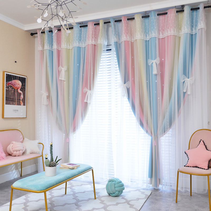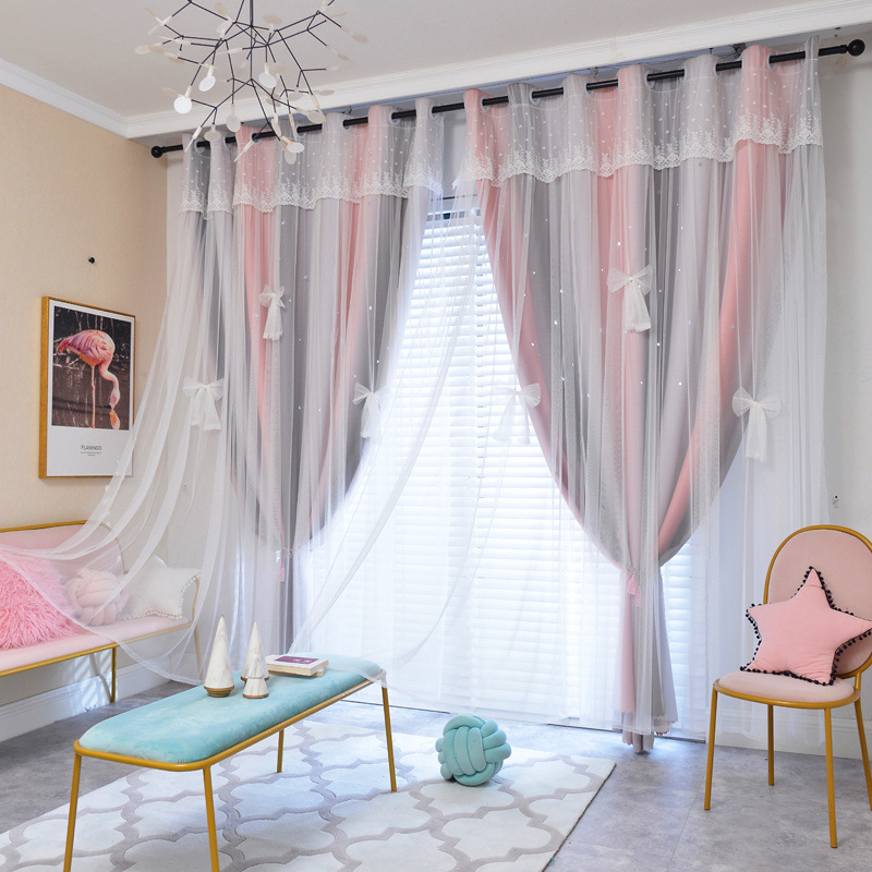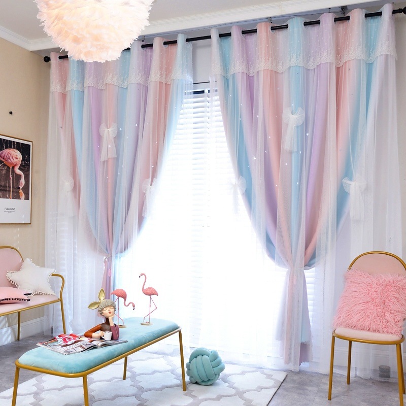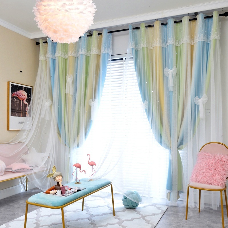 실이있는 더블 레이어 판타지 커튼 공주 스타일 침실 새로운 벌크 화창한 창 빛 차단 어린이 방 소녀 거실 커튼