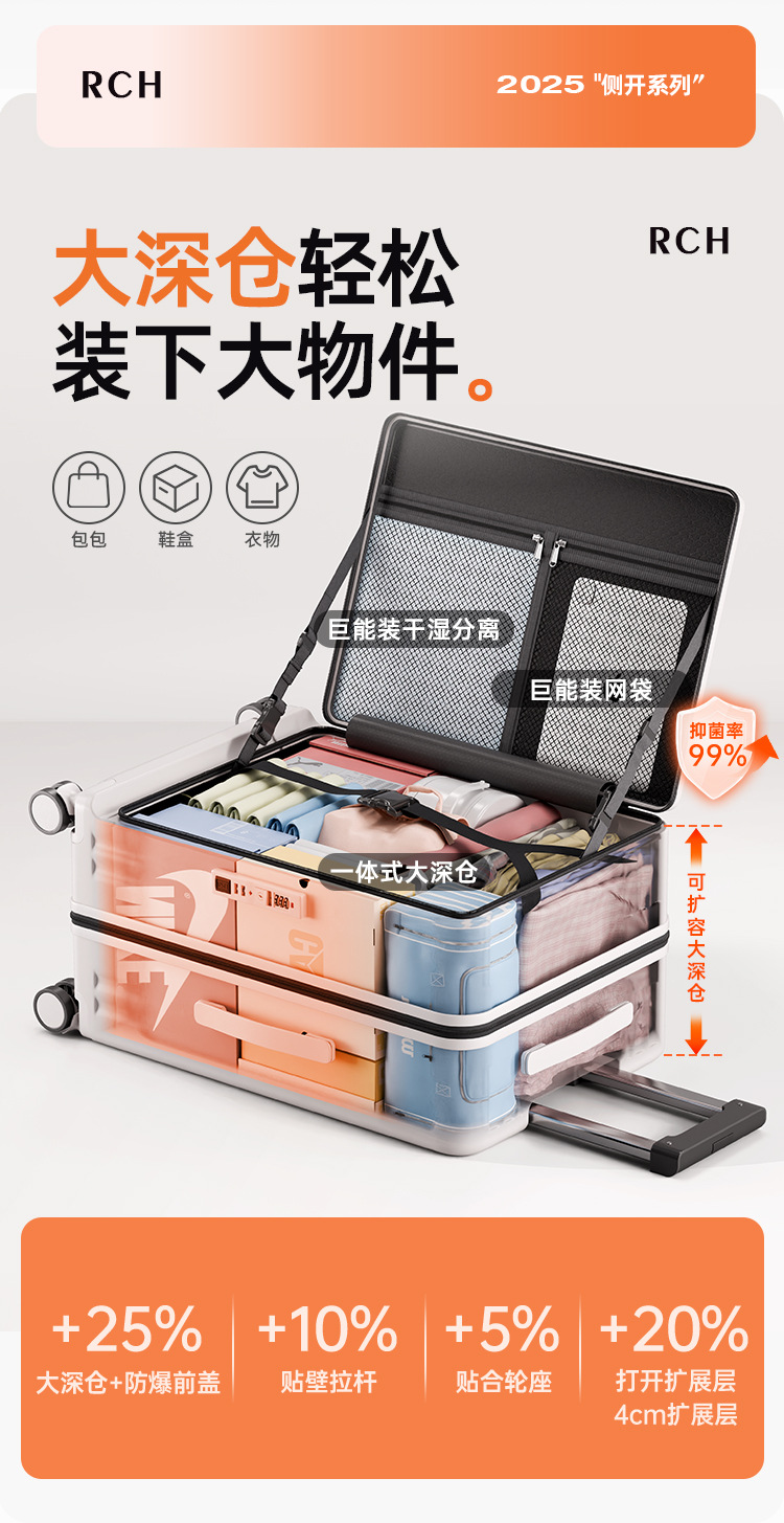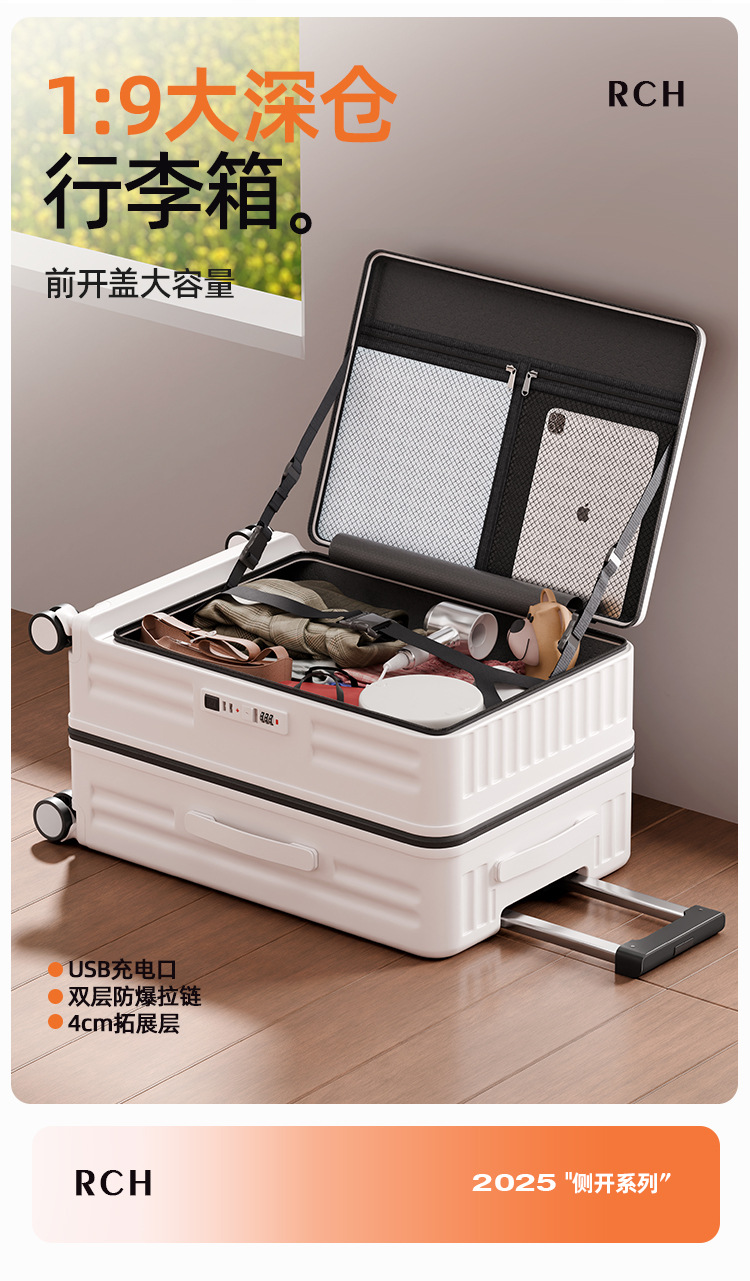 맞춤형 측면 개방형 수하물 트렁크, 여성용 딥 카고, 초대형 용량, 범용 휠, 20inch 확장형 트롤리 여행용 가방