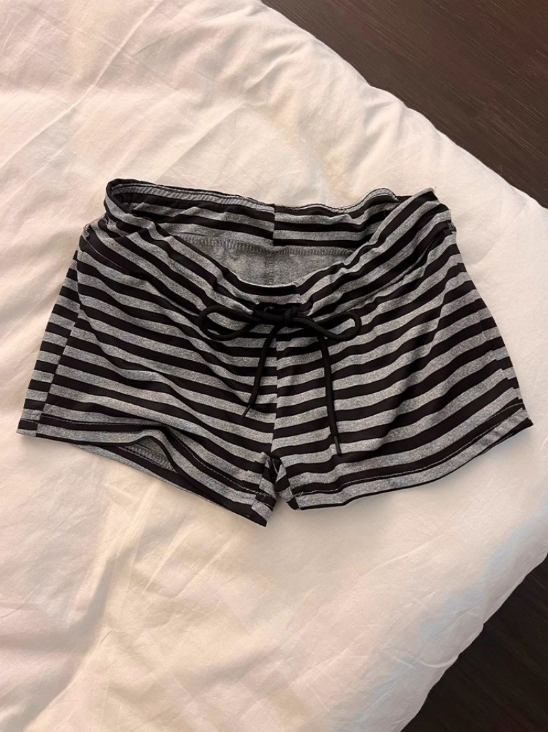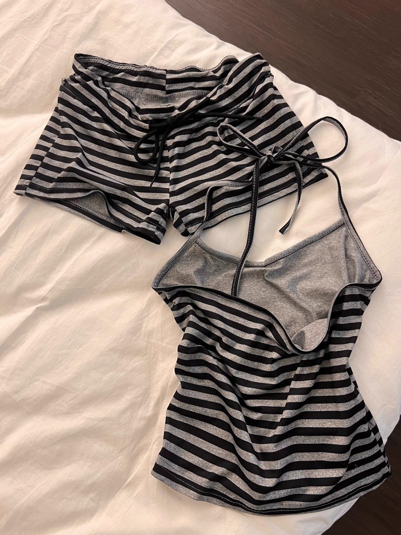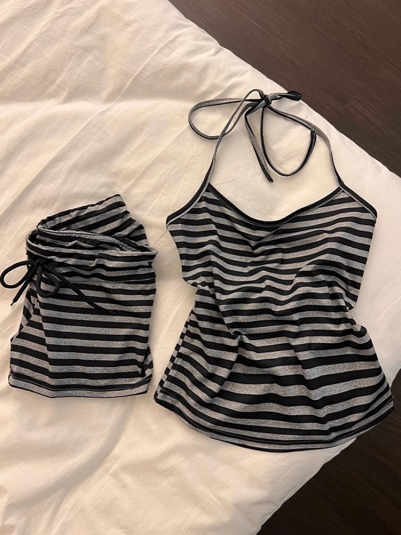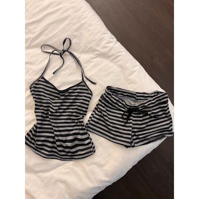 여름 핫걸을 위한 순수한 욕망 스트라이프 레이스업 홀터넥 서스펜더 잠옷, 가슴 패드와 아름다운 등 반바지, 홈웨어 세트