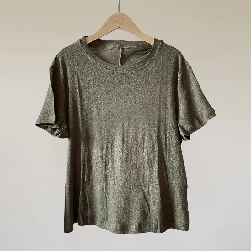 니트 대마 여름 부드럽고 매끄럽고 주름이 잘 생기지 않는 스트레이트 버전 라운드 넥 오른쪽 어깨 솔리드 컬러 여성용 반팔 티셔츠스토어 가기