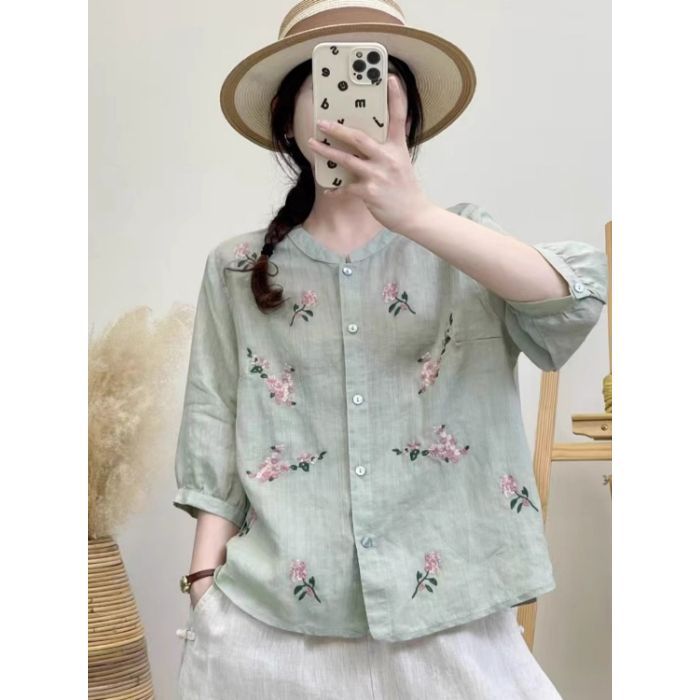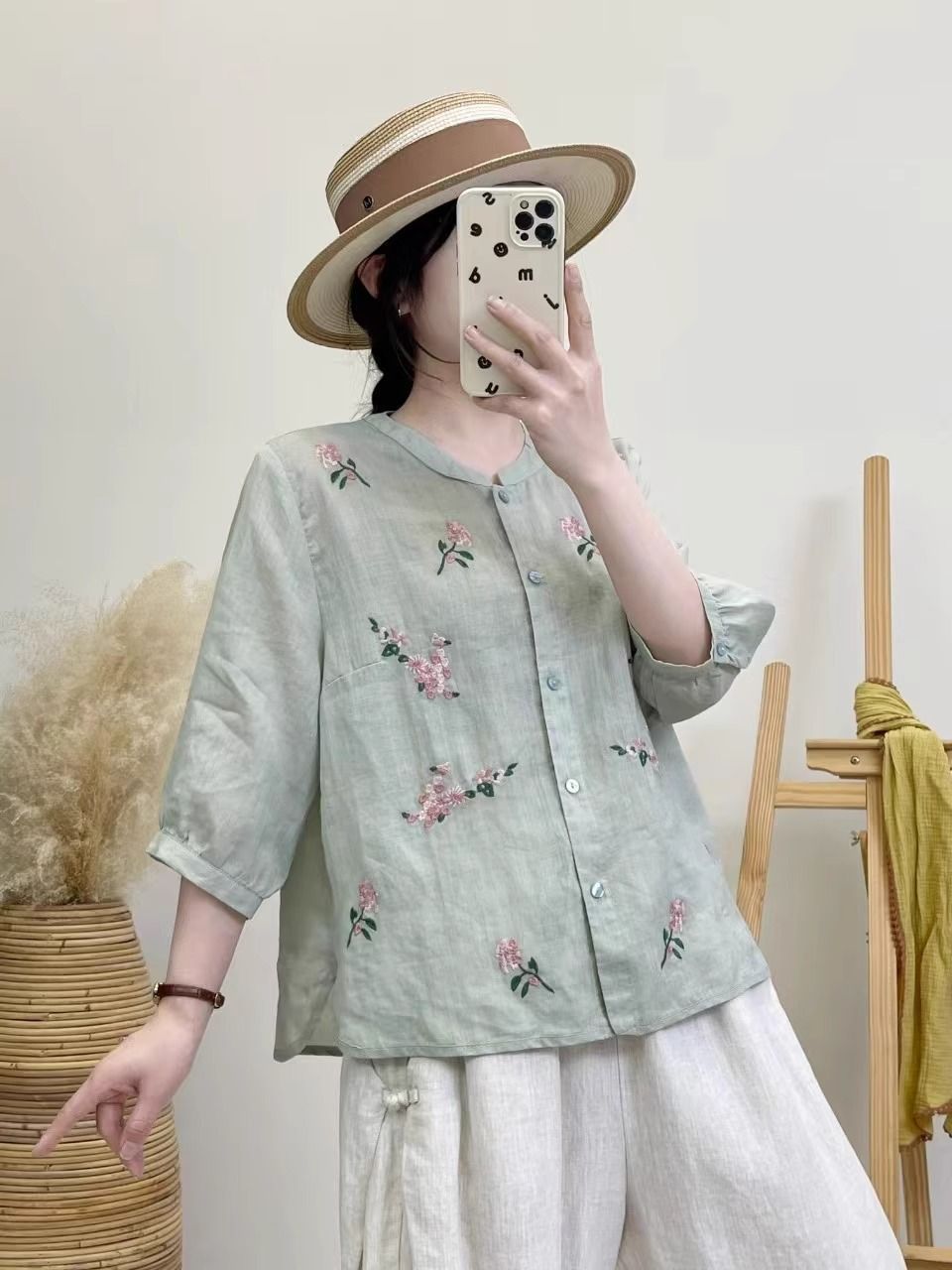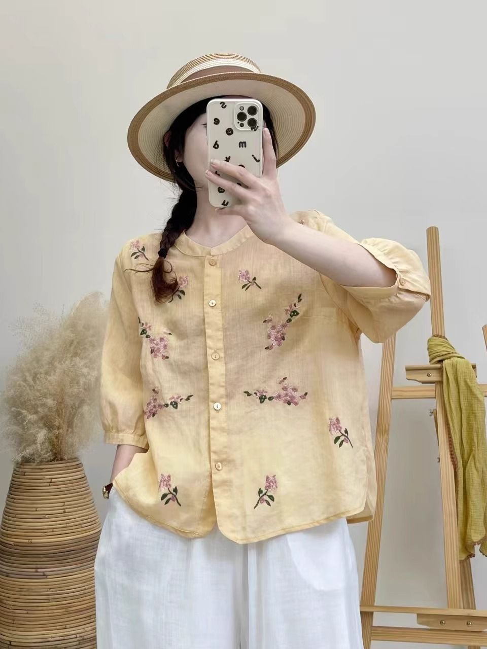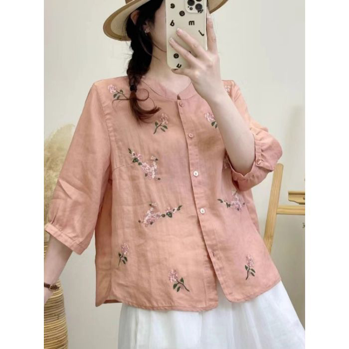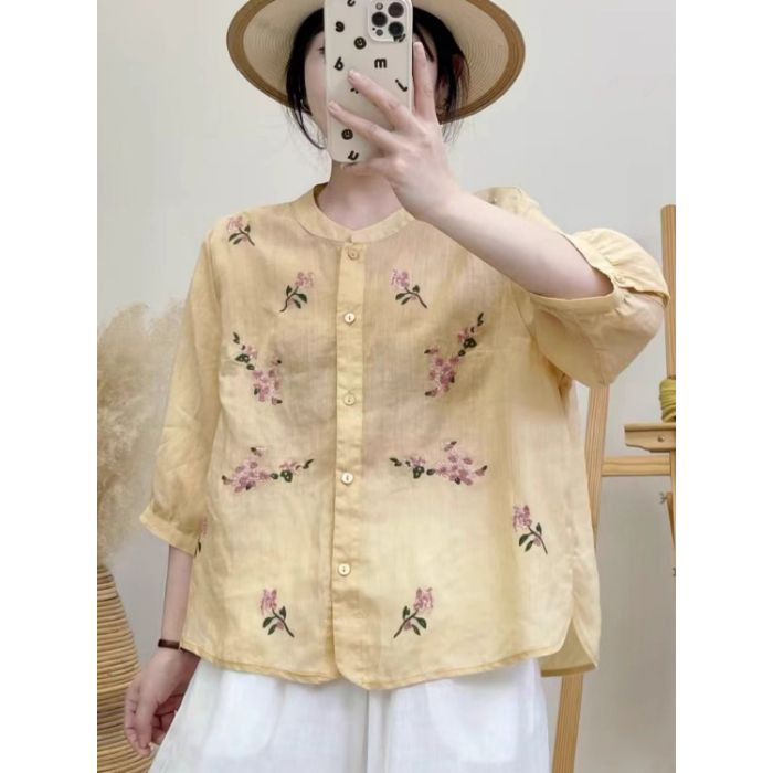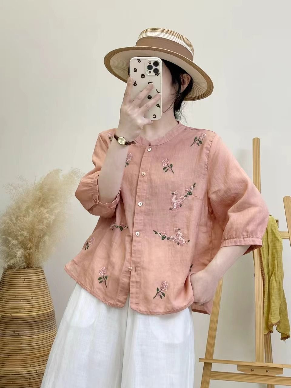 민족 스타일의 새로운 중국 스타일 반팔 반팔 면 및 린넨 셔츠 봄 여름 새로운 다용도 자수 절묘한 도파민 착용스토어 가기