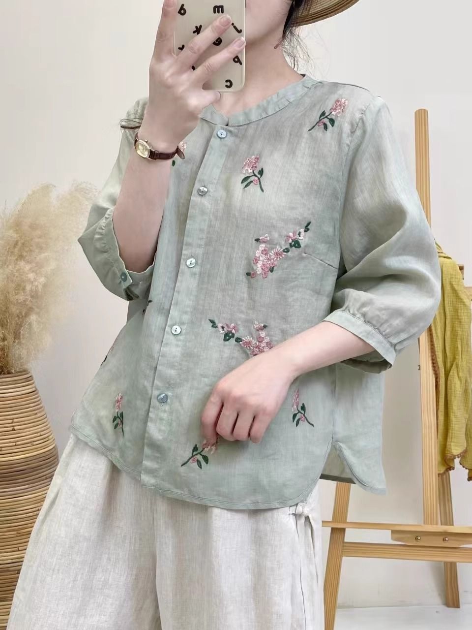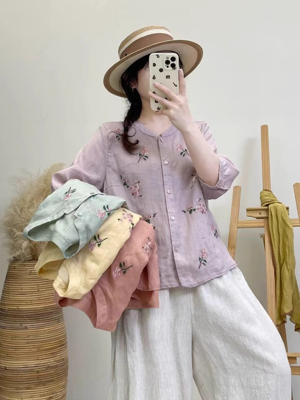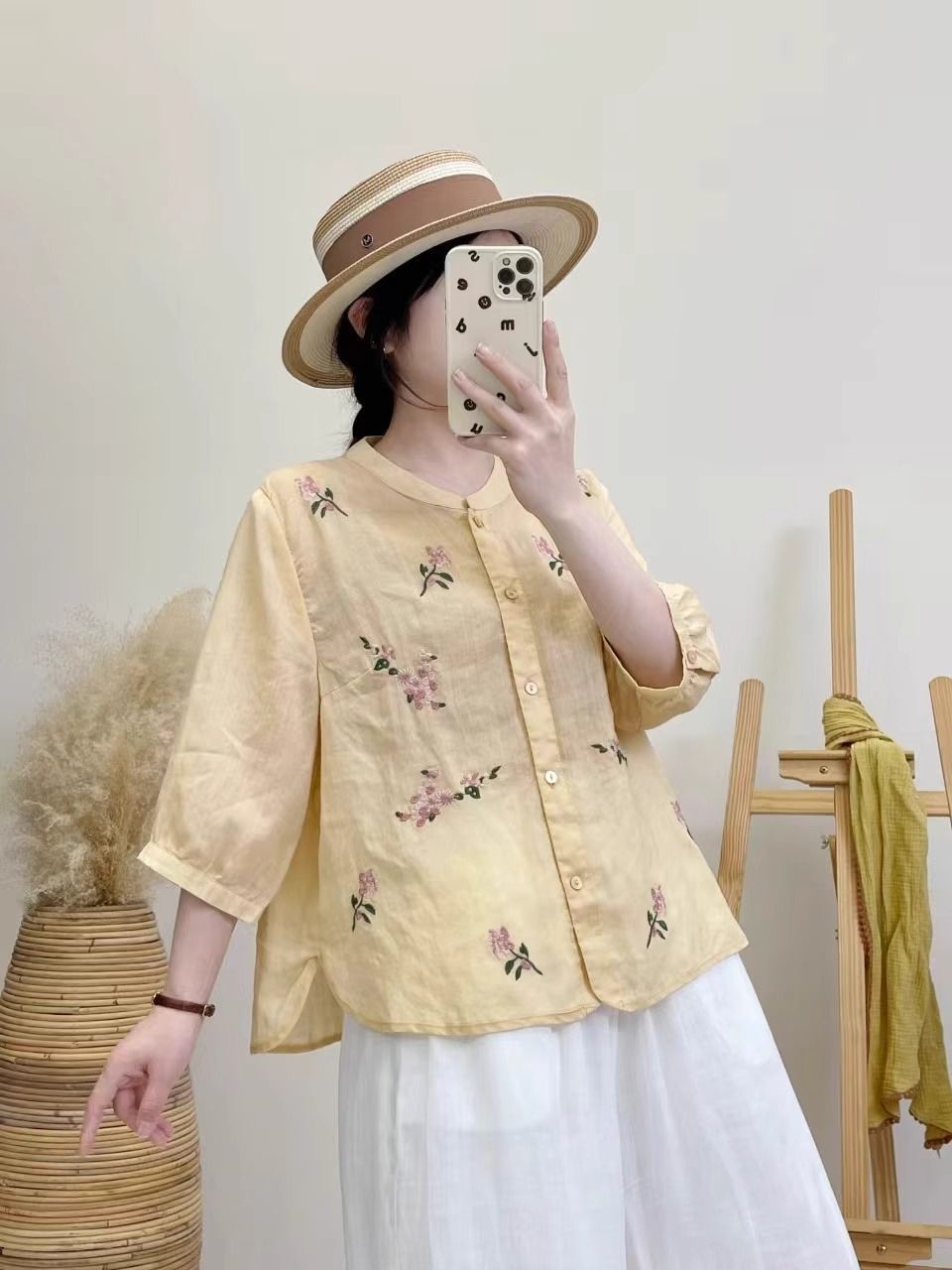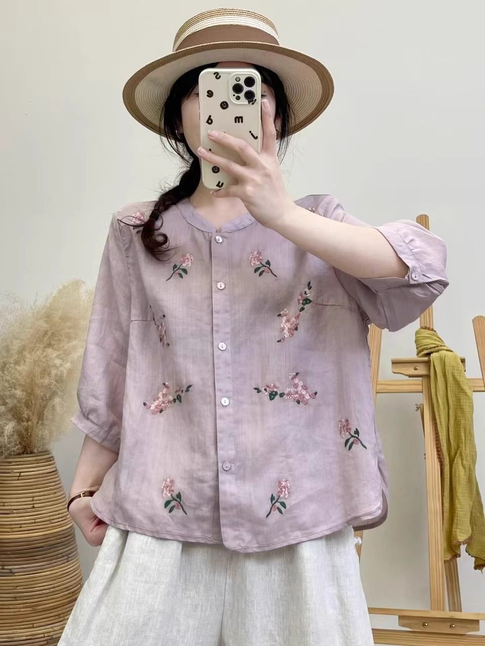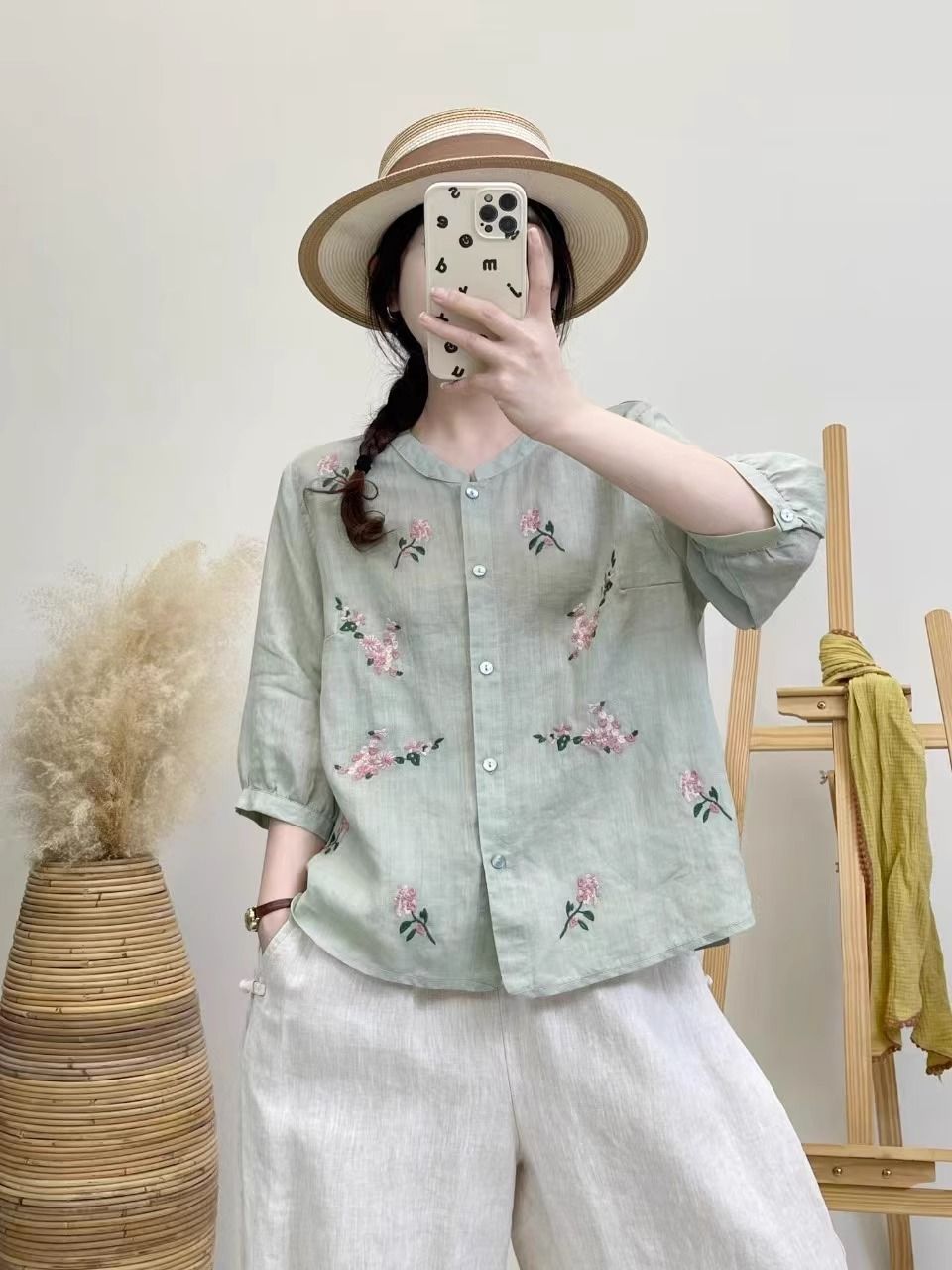 민족 스타일의 새로운 중국 스타일 반팔 반팔 면 및 린넨 셔츠 봄 여름 새로운 다용도 자수 절묘한 도파민 착용스토어 가기