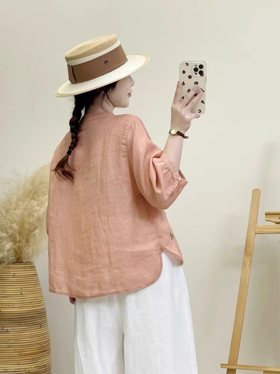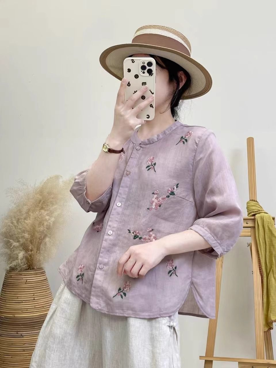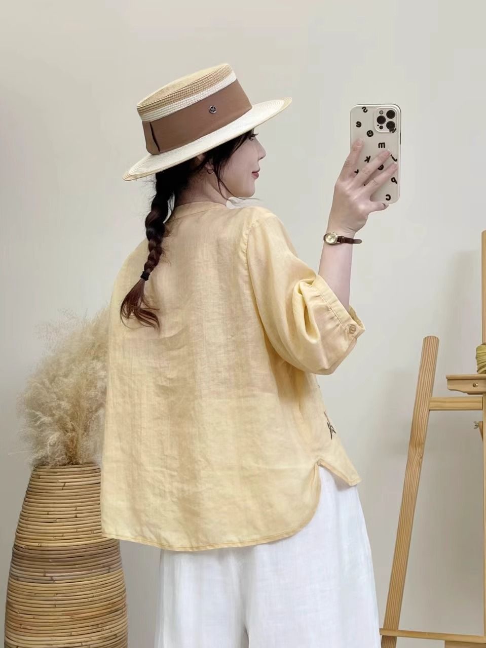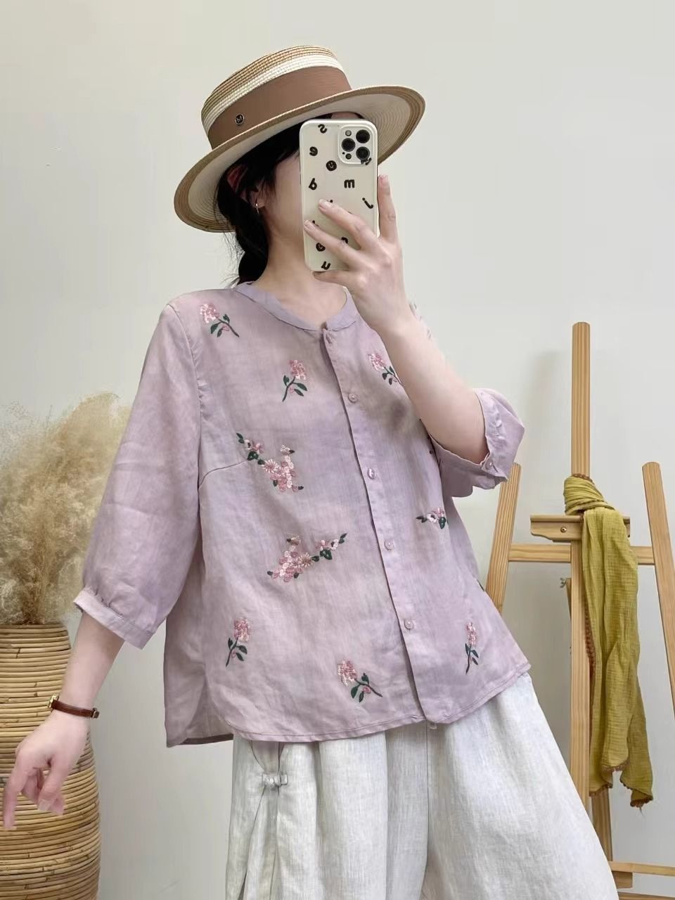 민족 스타일의 새로운 중국 스타일 반팔 반팔 면 및 린넨 셔츠 봄 여름 새로운 다용도 자수 절묘한 도파민 착용스토어 가기