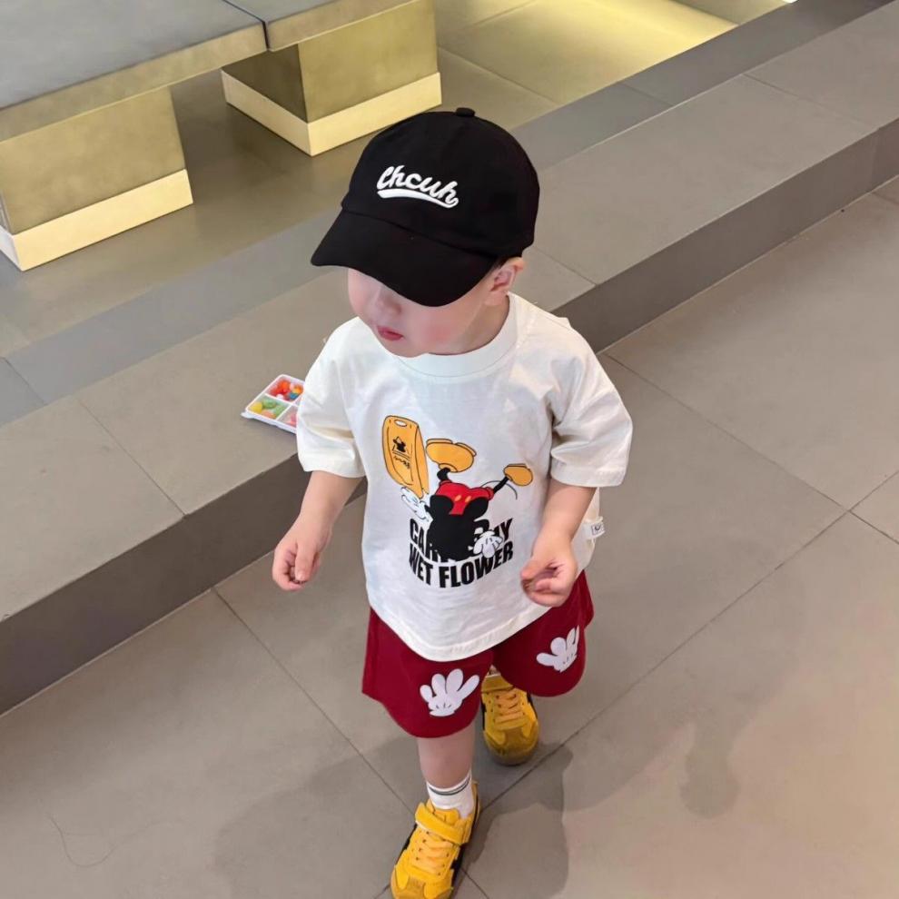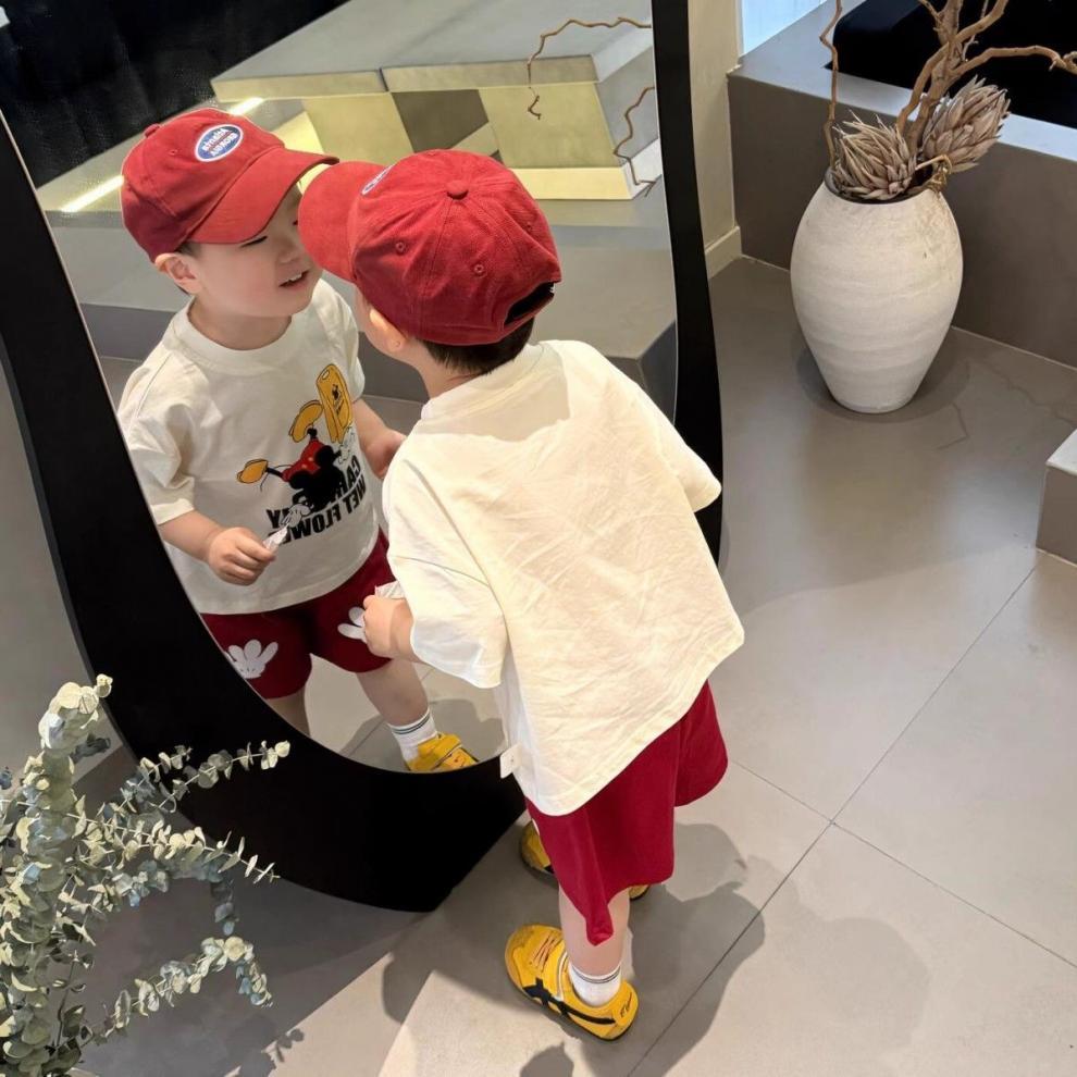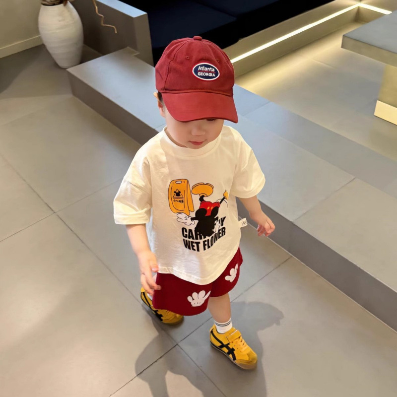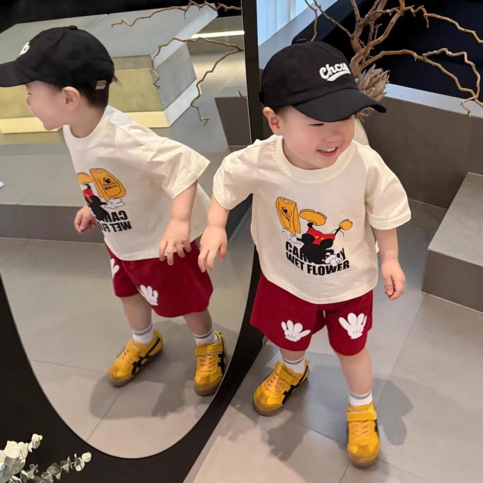 한국 스타일 소년 정장 2025 여름 어린이 도파민 빨간색 반바지 아기 프린트 반팔 티셔츠 투피스 세트스토어 가기