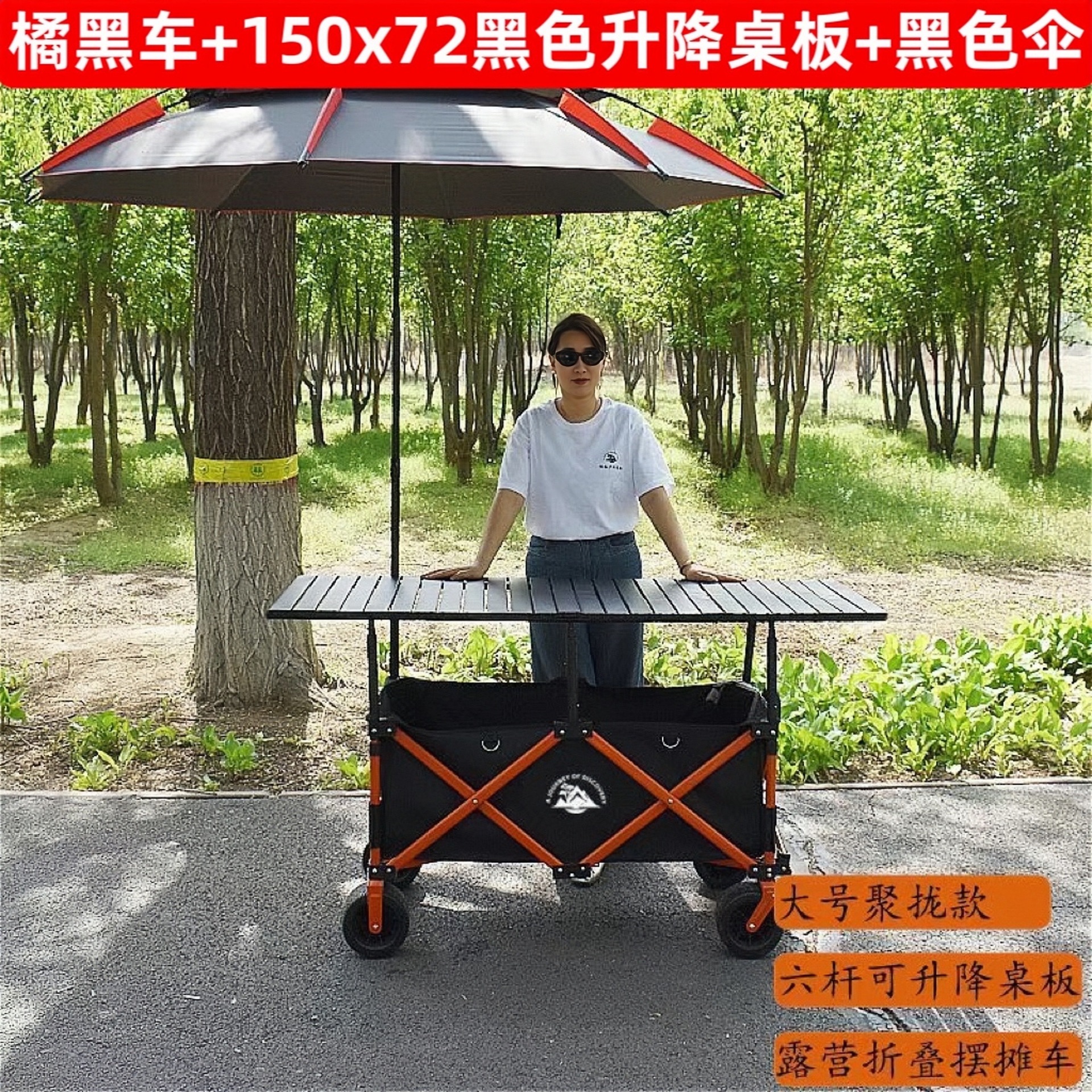 • 오렌지 프레임 블랙카 + 150*72 블랙 리프팅 테이블 + (블랙) 대형 우산