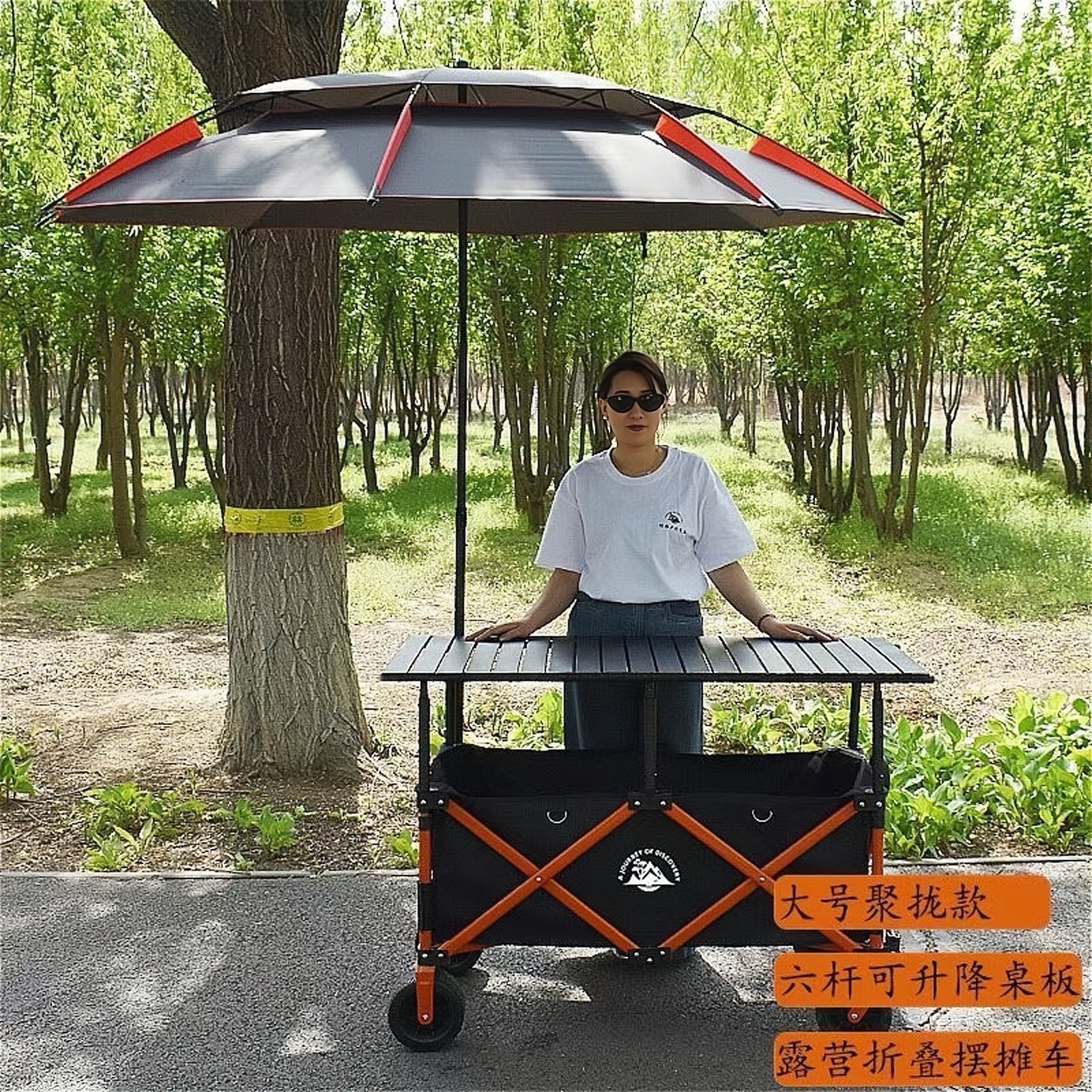 • 오렌지 프레임 블랙카 + 120*60 블랙 리프팅 테이블 + (블랙) 대형 우산