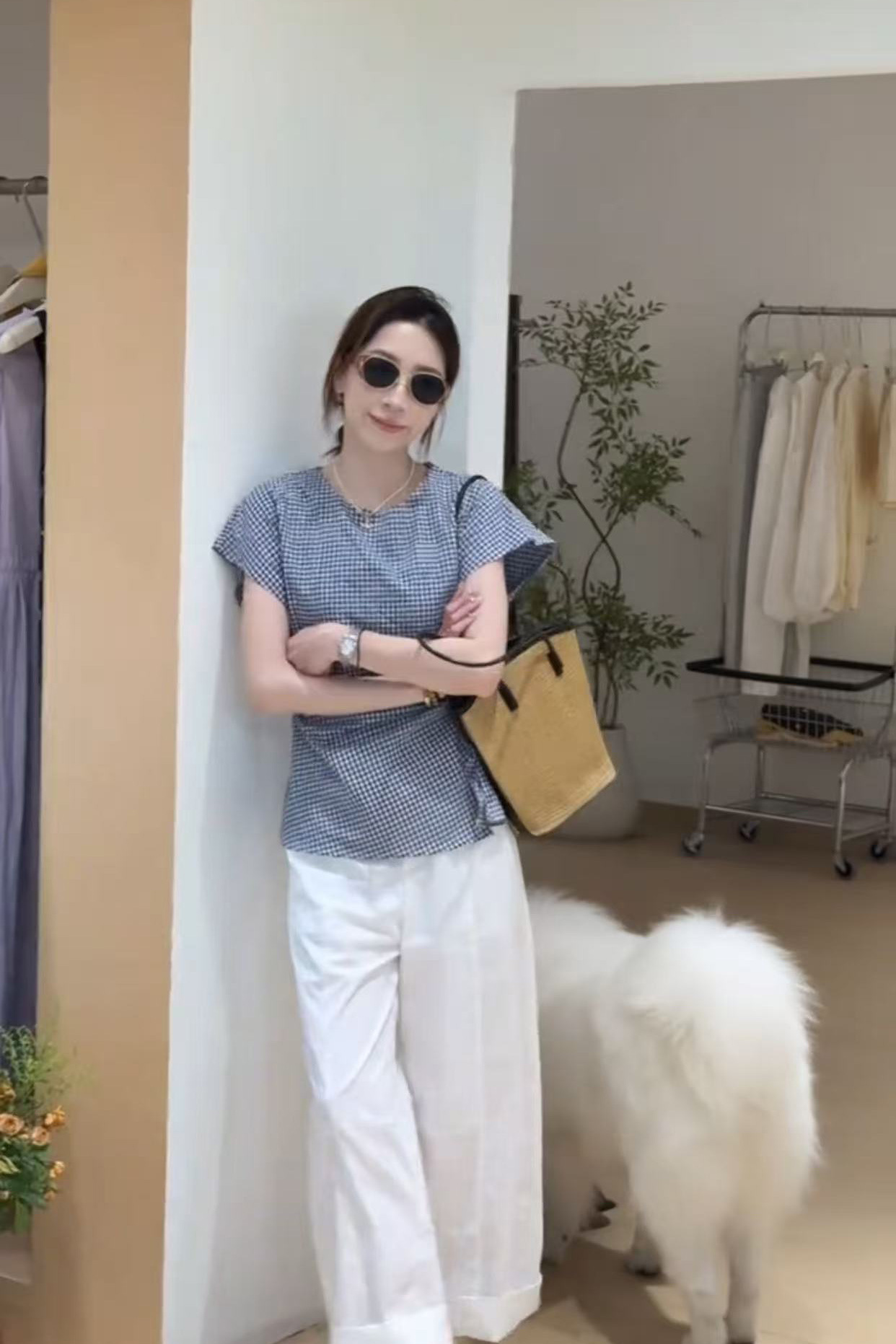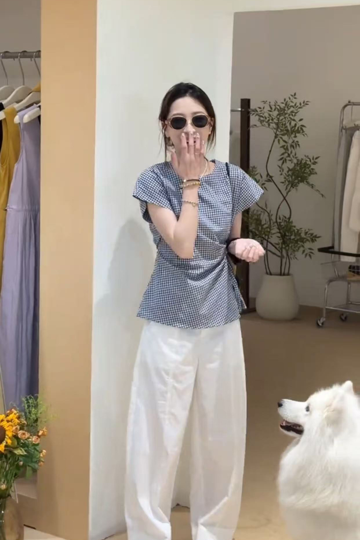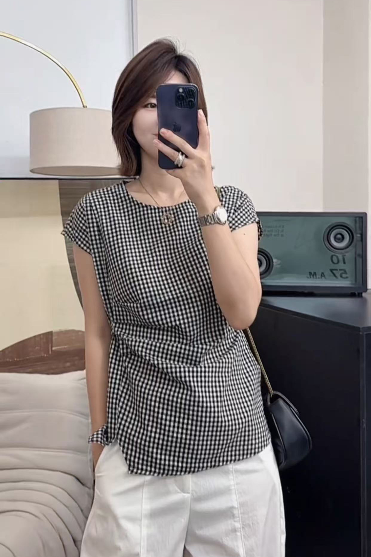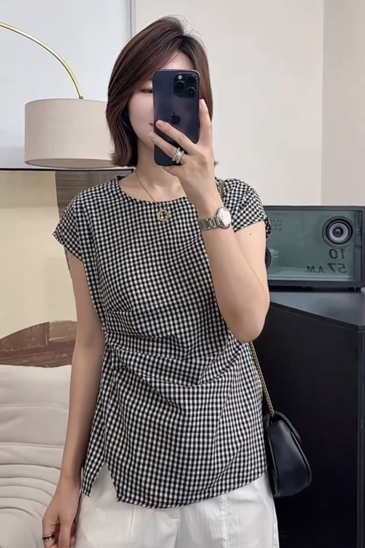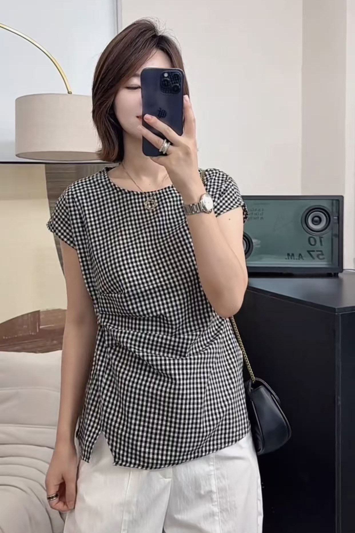 여성을 위한 디자인된 작은 플라잉 슬리브 체크 무늬 셔츠 2025 새로운 여름 고급 독특하고 아름다운 연령 감소 셔츠 탑스토어 가기
