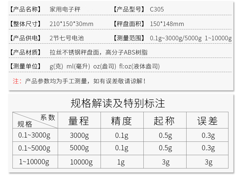 국경 간 재고 주방 전자 저울 C305 베이킹 저울 방수 스테인리스 가정용 10kg 식품 저울 주방 저울
