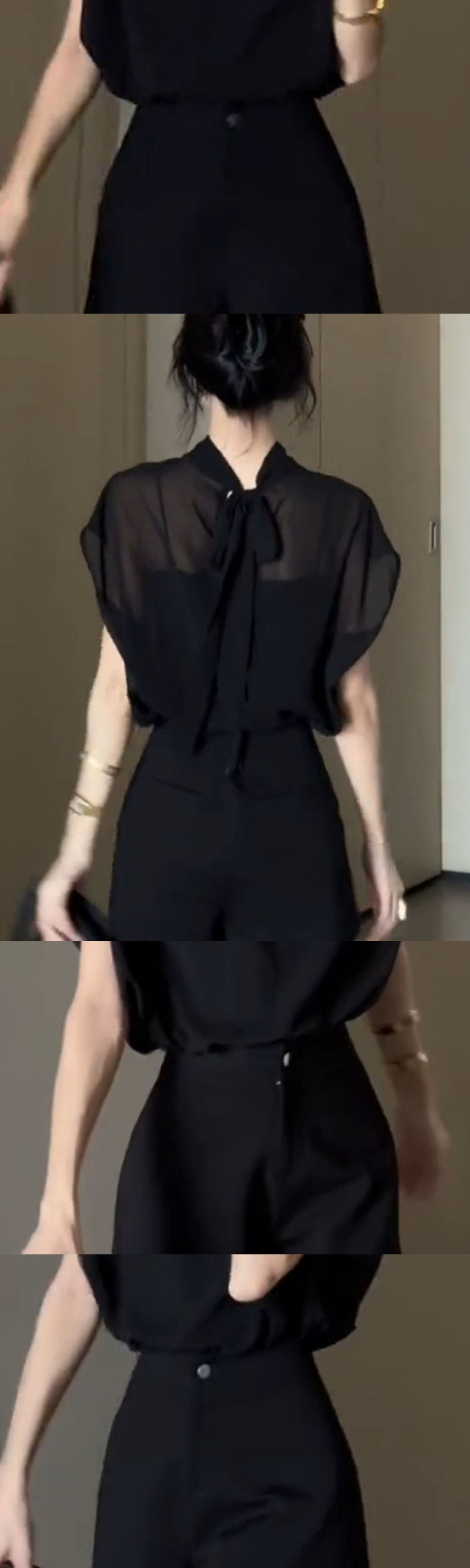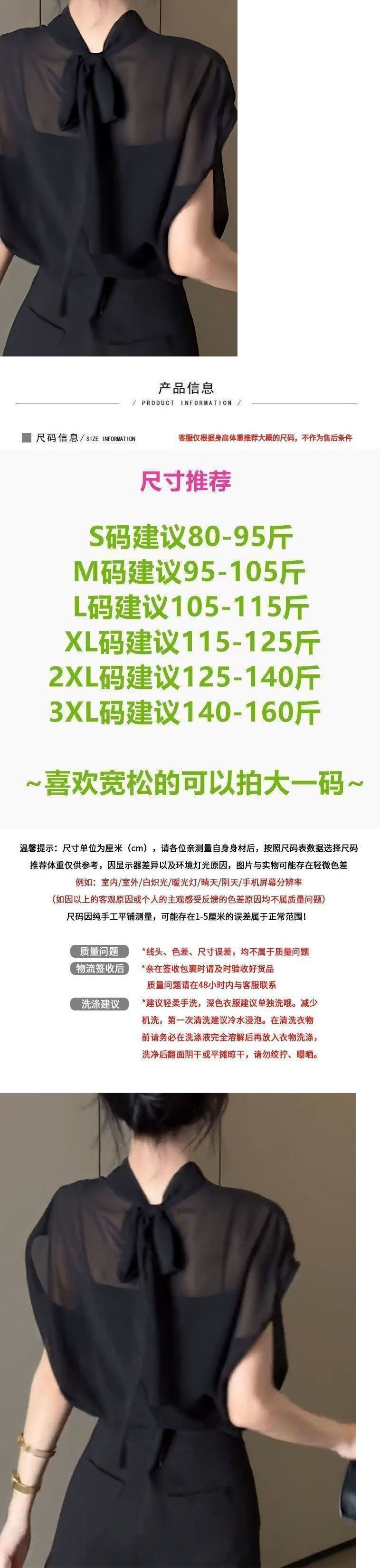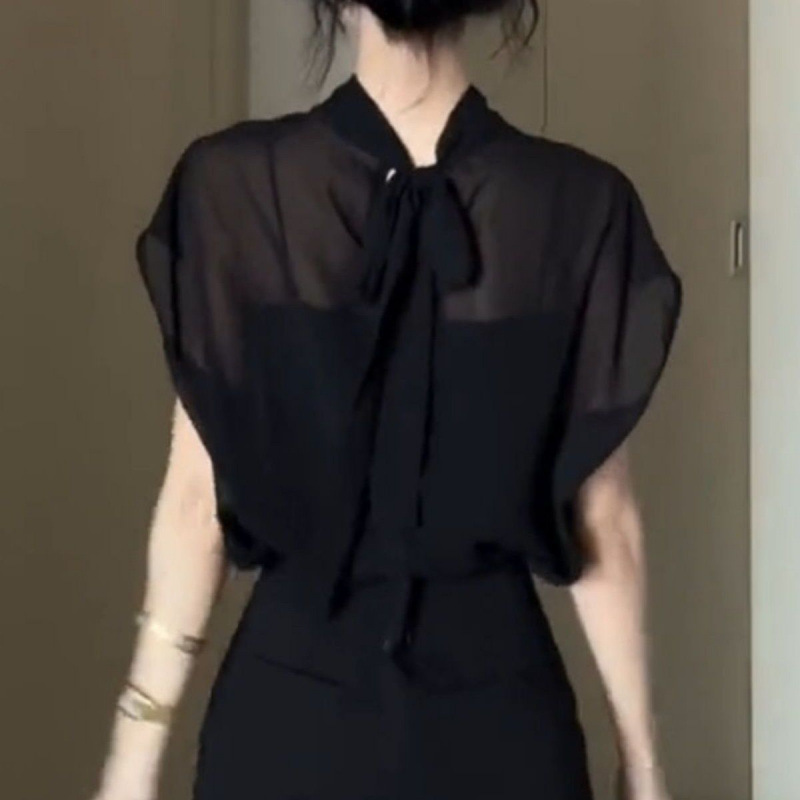여성을위한 블랙 Tulle Bow Tie 스탠드 칼라 반팔 쉬폰 셔츠 2025 여름 새로운 패션 스타일 탑스토어 가기
