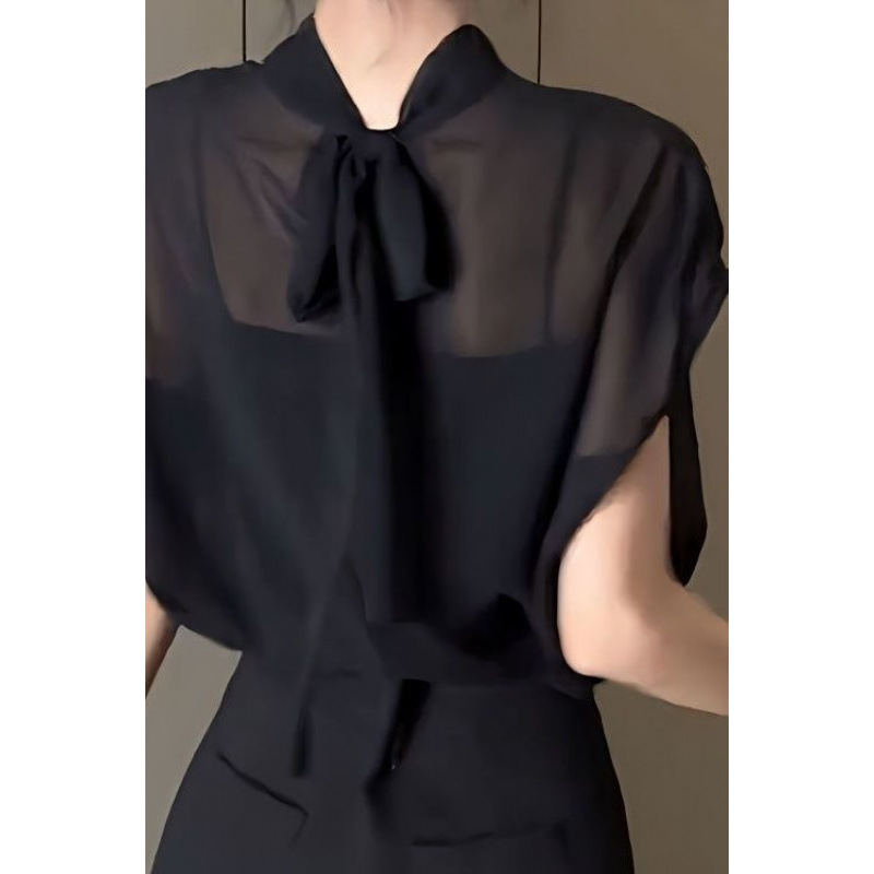 여성을위한 블랙 Tulle Bow Tie 스탠드 칼라 반팔 쉬폰 셔츠 2025 여름 새로운 패션 스타일 탑
