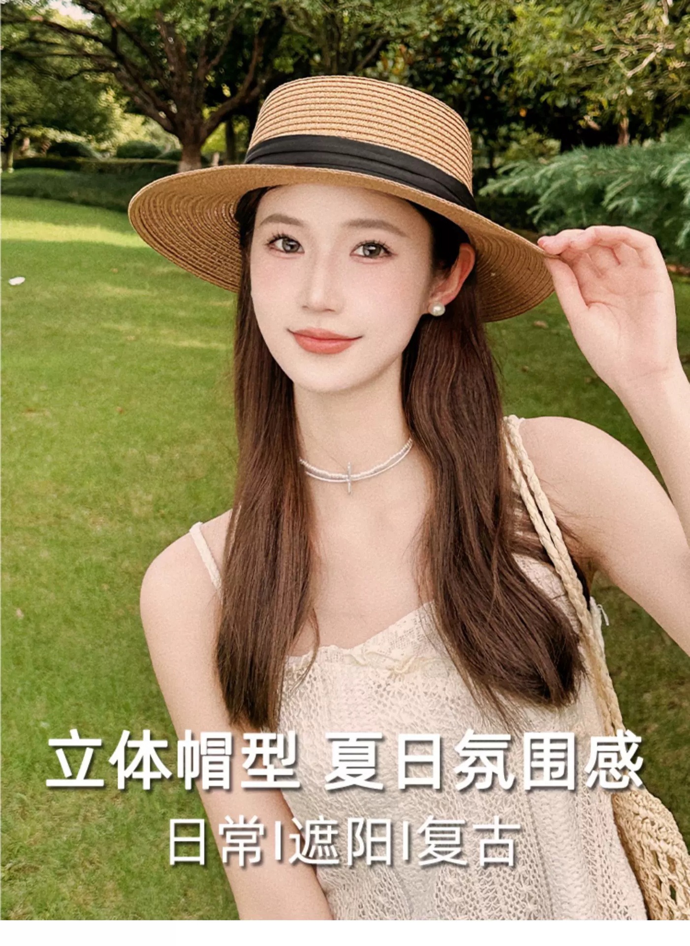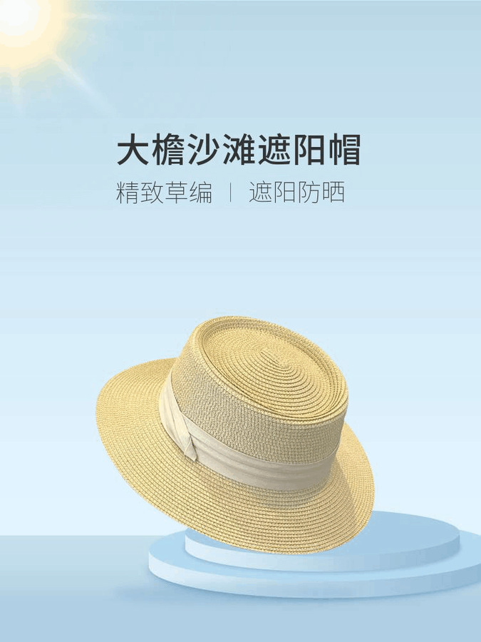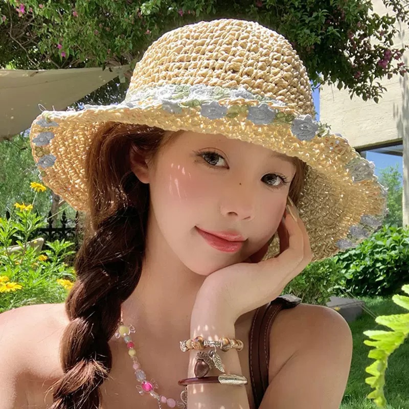 플랫 탑 밀짚 모자 여성 프랑스 밀짚 모자 2025 새로운 여름 큰 챙 태양 모자 해변 휴가 태양 모자스토어 가기