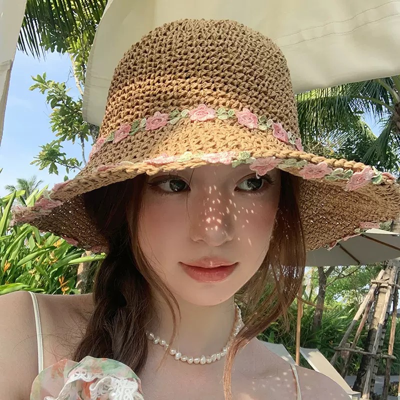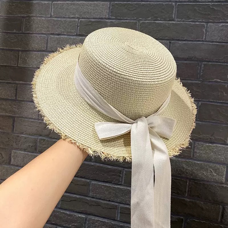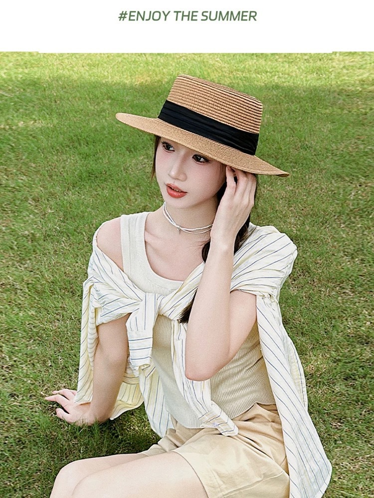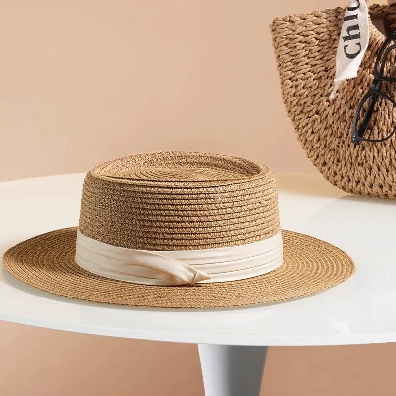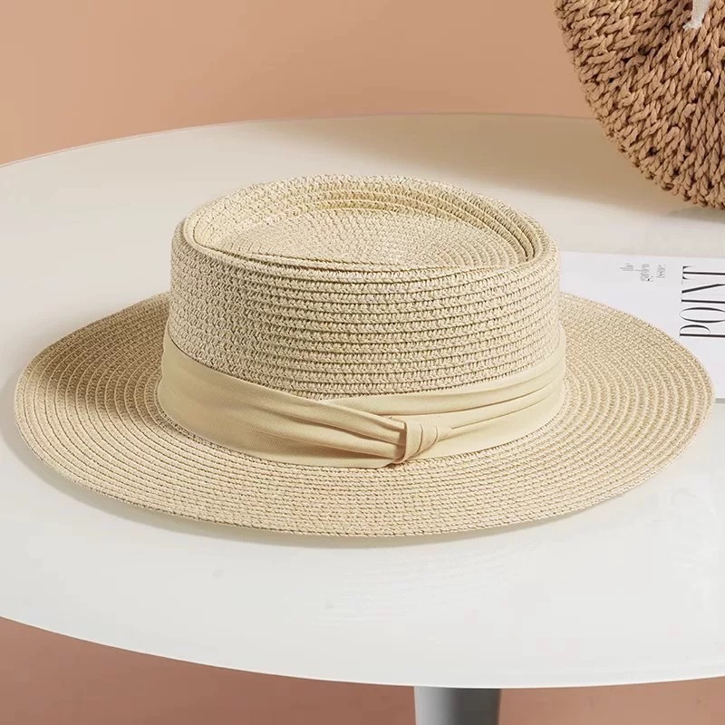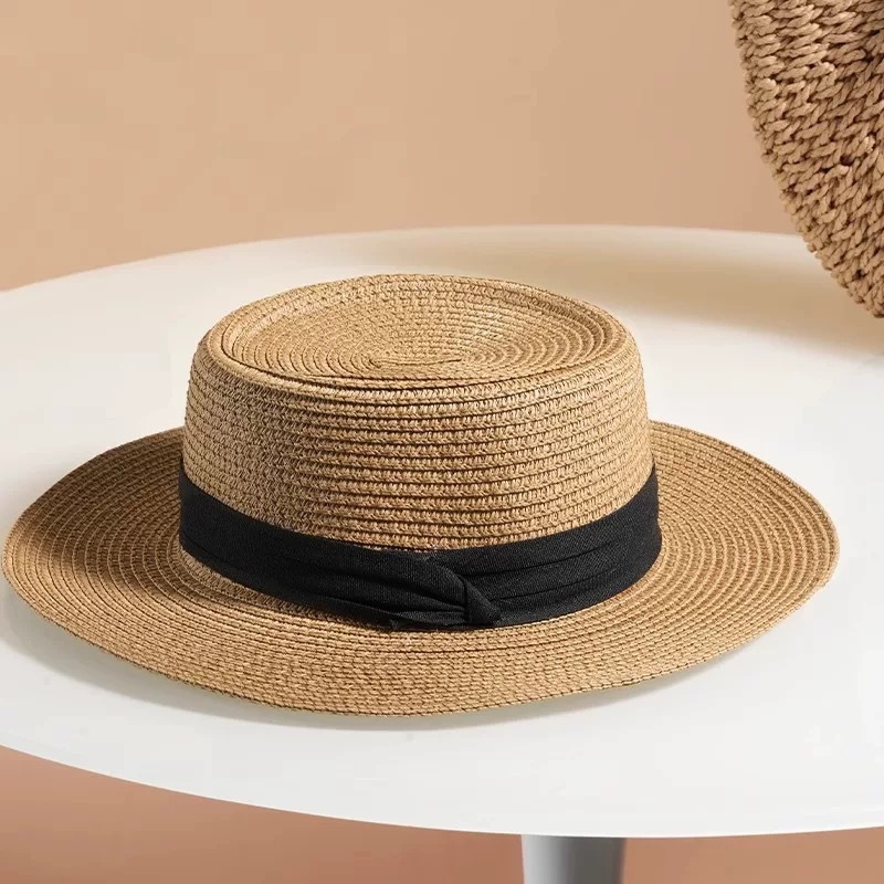 플랫 탑 밀짚 모자 여성 프랑스 밀짚 모자 2025 새로운 여름 큰 챙 태양 모자 해변 휴가 태양 모자