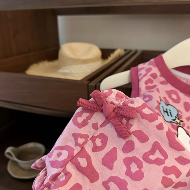 아동복 드레스 2025 여름 신상 여아 스커트 핑크 레오파드 프린트 스커트 밑단에 고양이 아기와 리본 장식