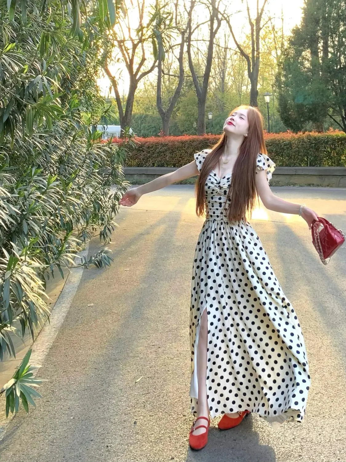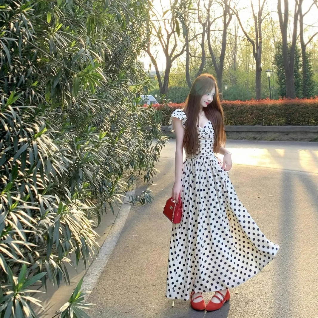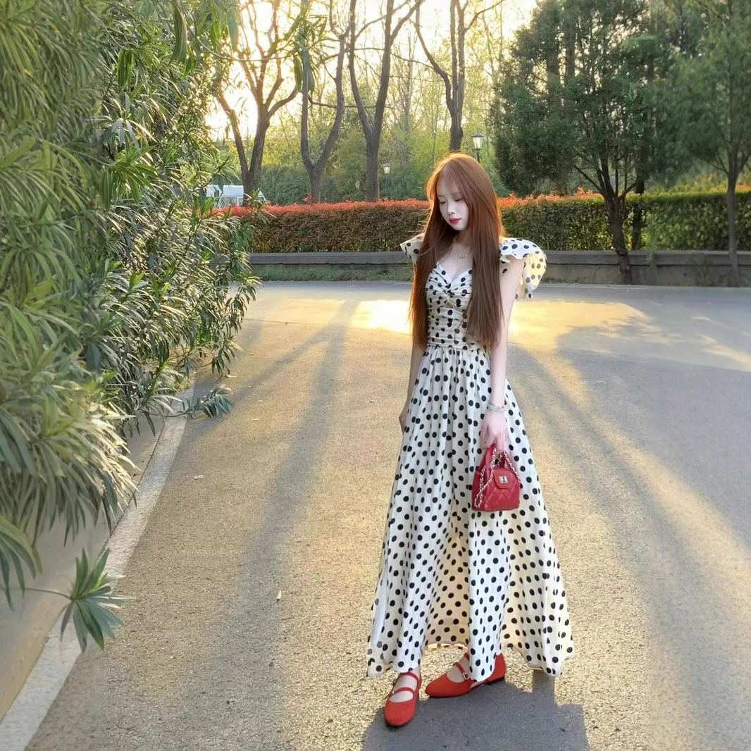 여름 여성용 프렌치 폴카 도트 드레스, 고급 해변 휴가, 작은 플라잉 슬리브, 허리라인 A라인 롱 스커트