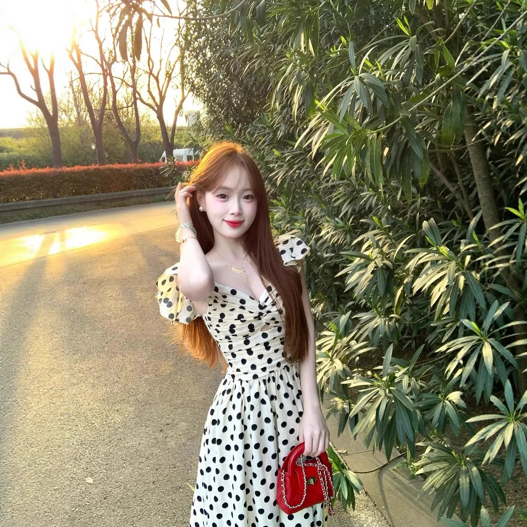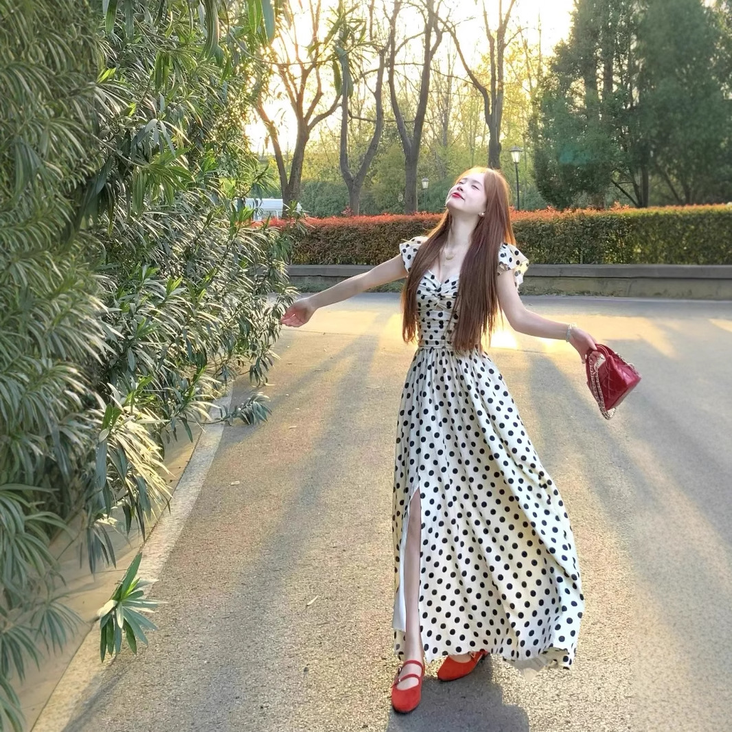 여름 여성용 프렌치 폴카 도트 드레스, 고급 해변 휴가, 작은 플라잉 슬리브, 허리라인 A라인 롱 스커트스토어 가기