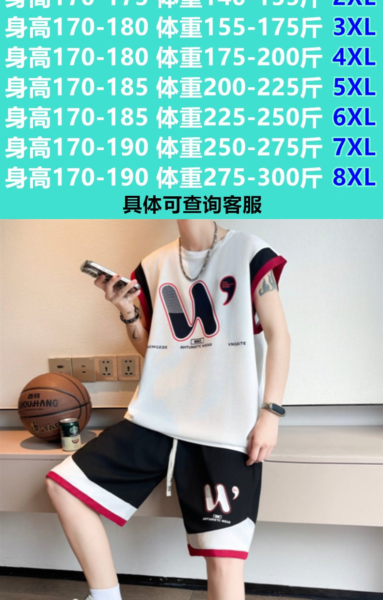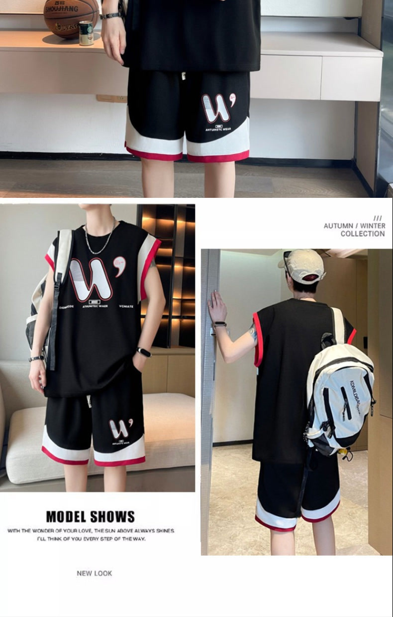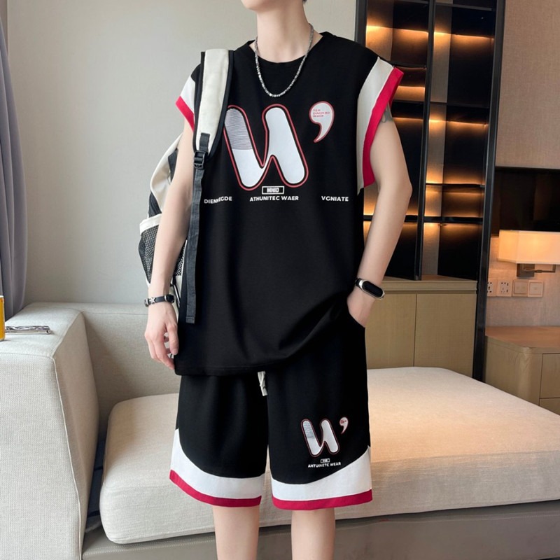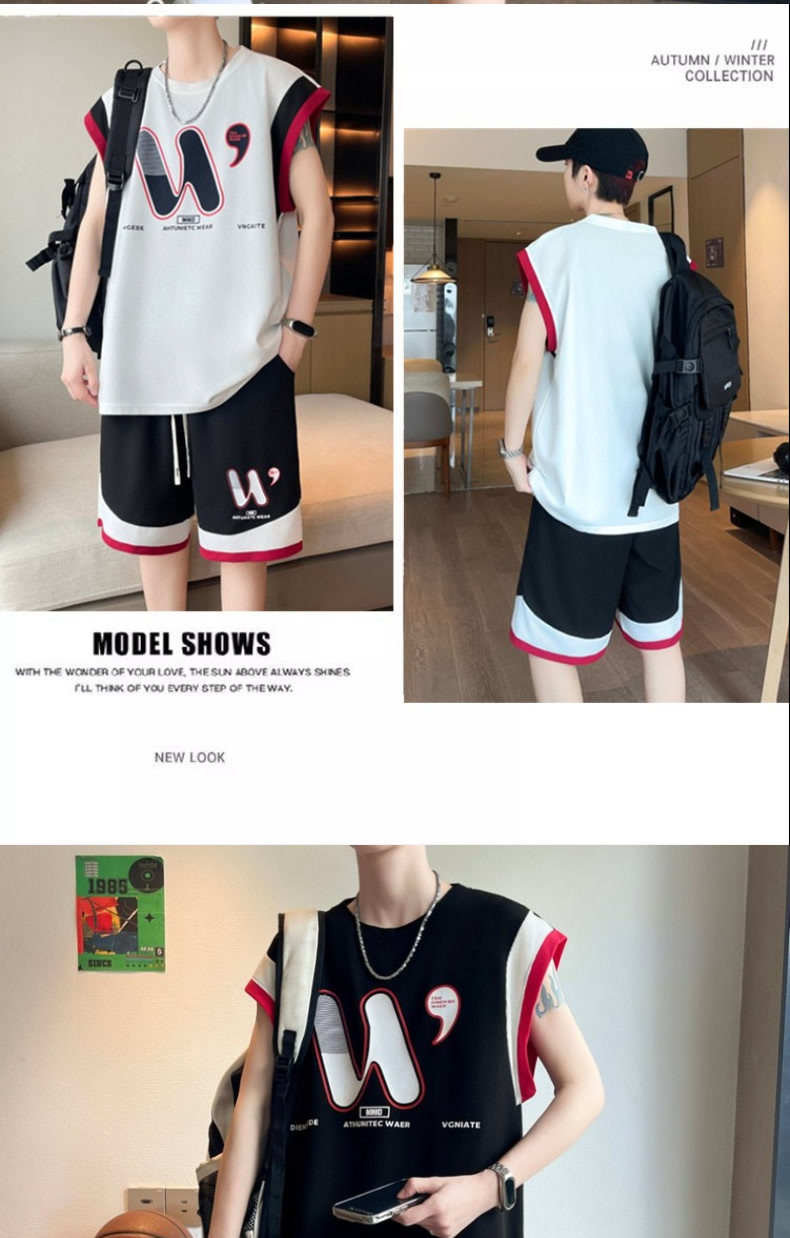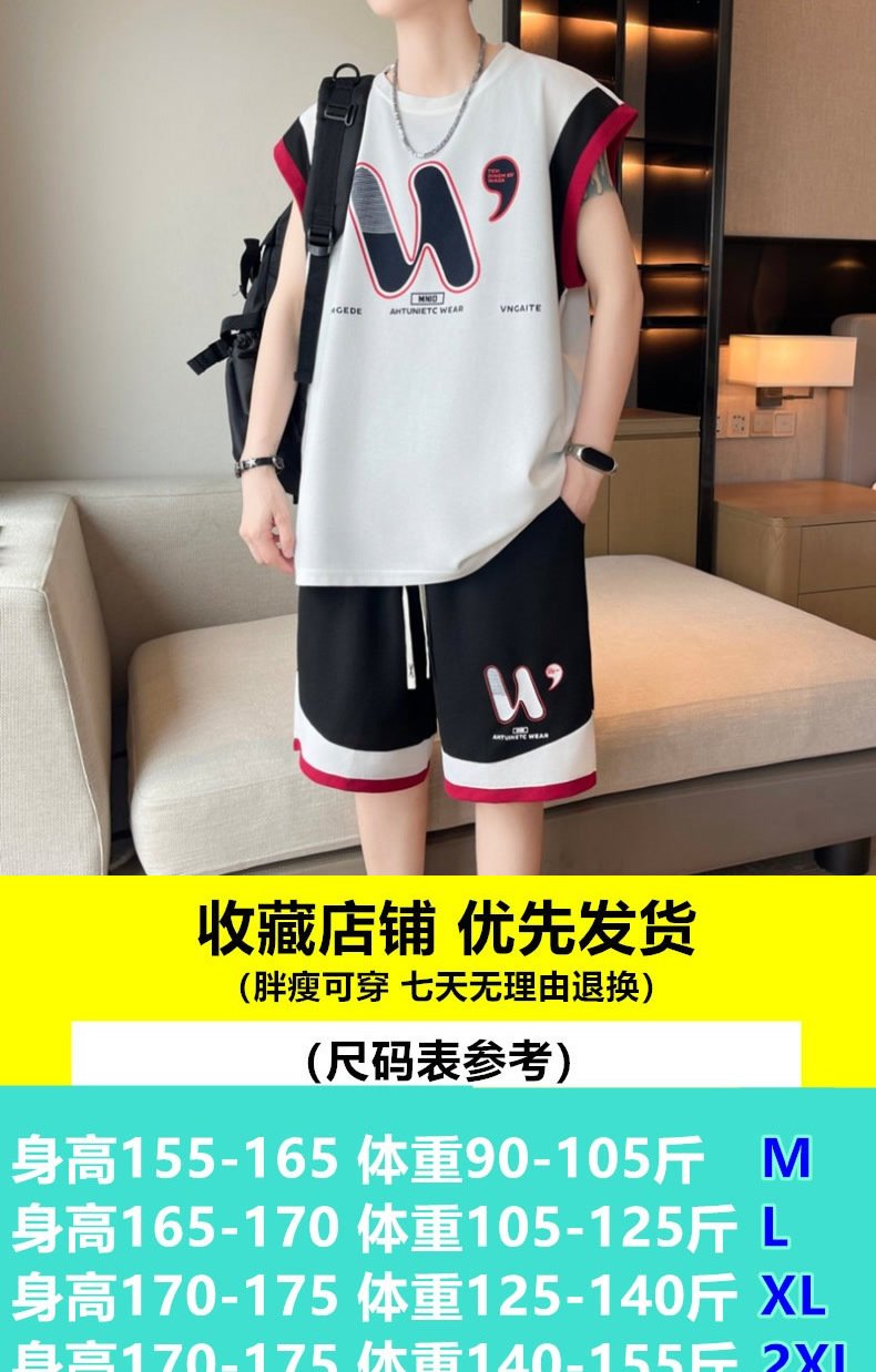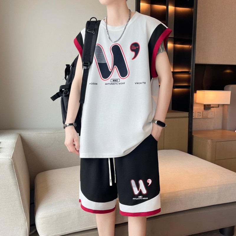 청소년 캐주얼 스포츠 정장 남성 여름 민소매 티셔츠 느슨한 대형 학생 조끼 5부 바지 투피스 세트