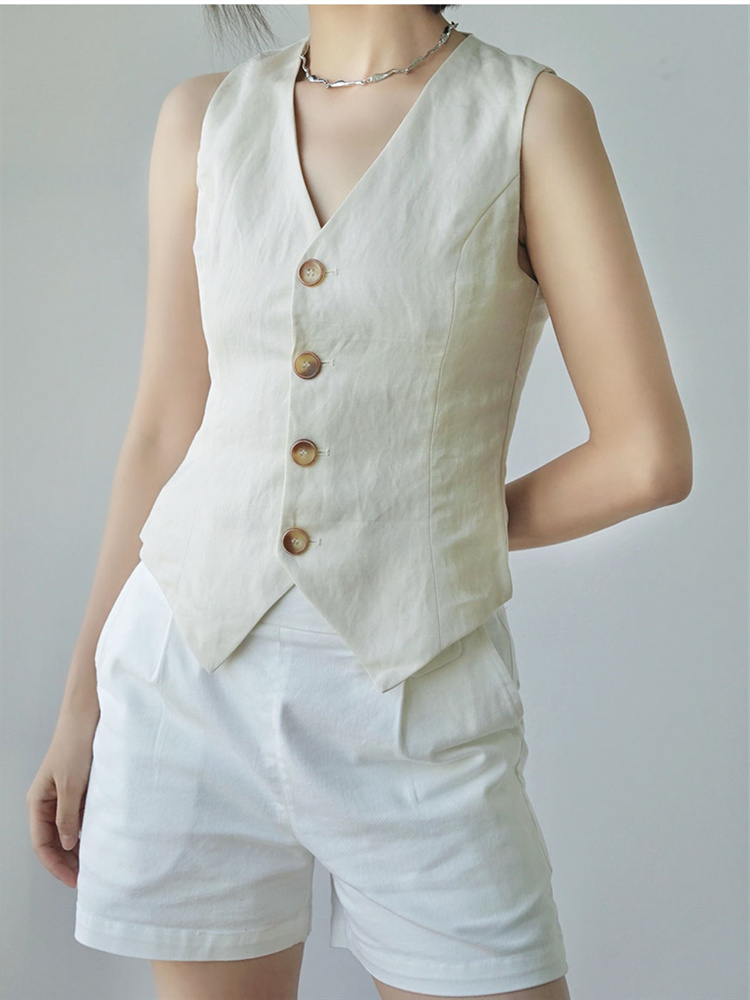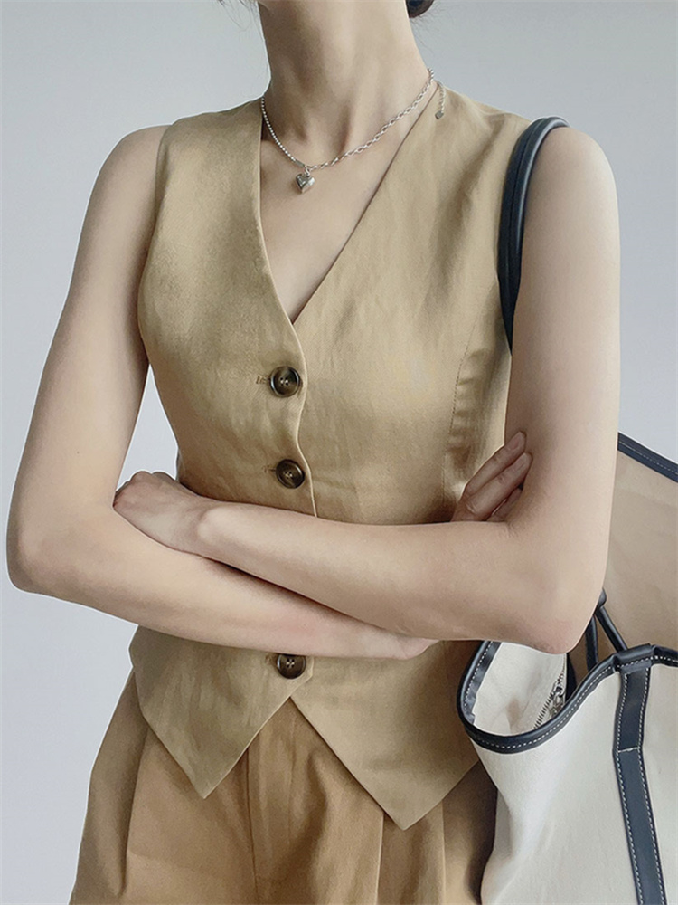 올드 머니 스타일 텐셀 린넨 v 넥 정장 조끼 짧은 코트 여성 여름 2025 새로운 레트로 민소매 조끼 탑