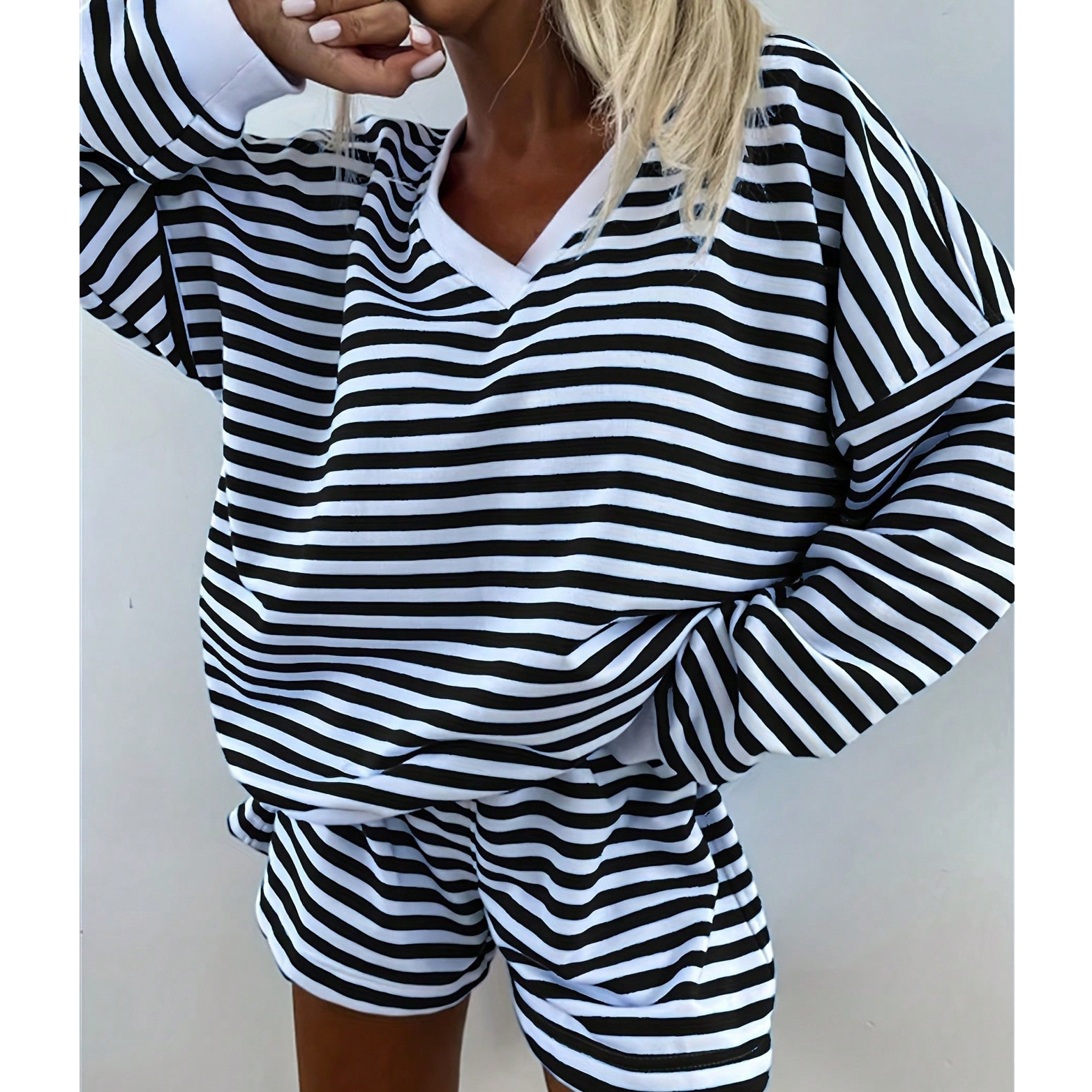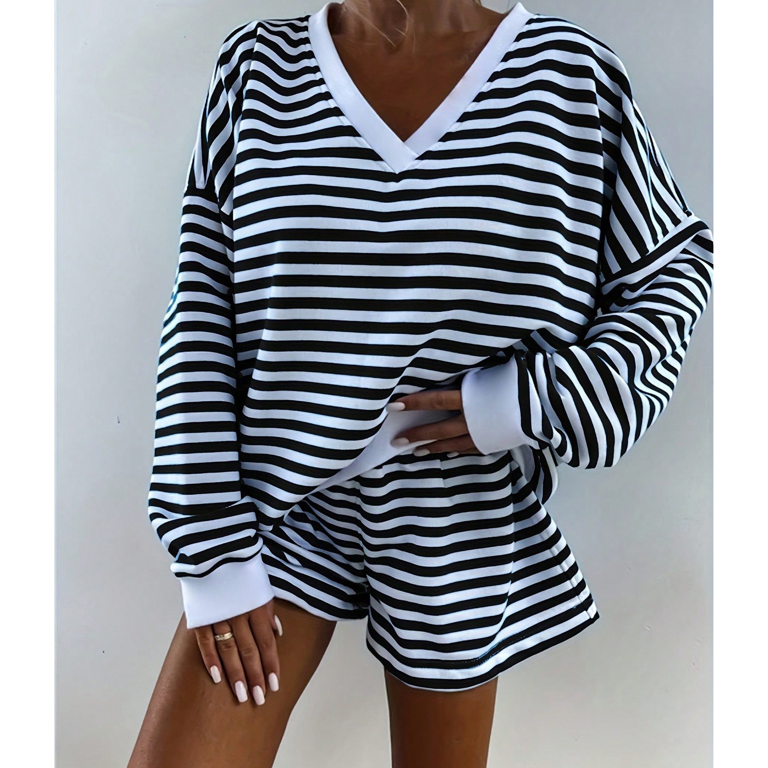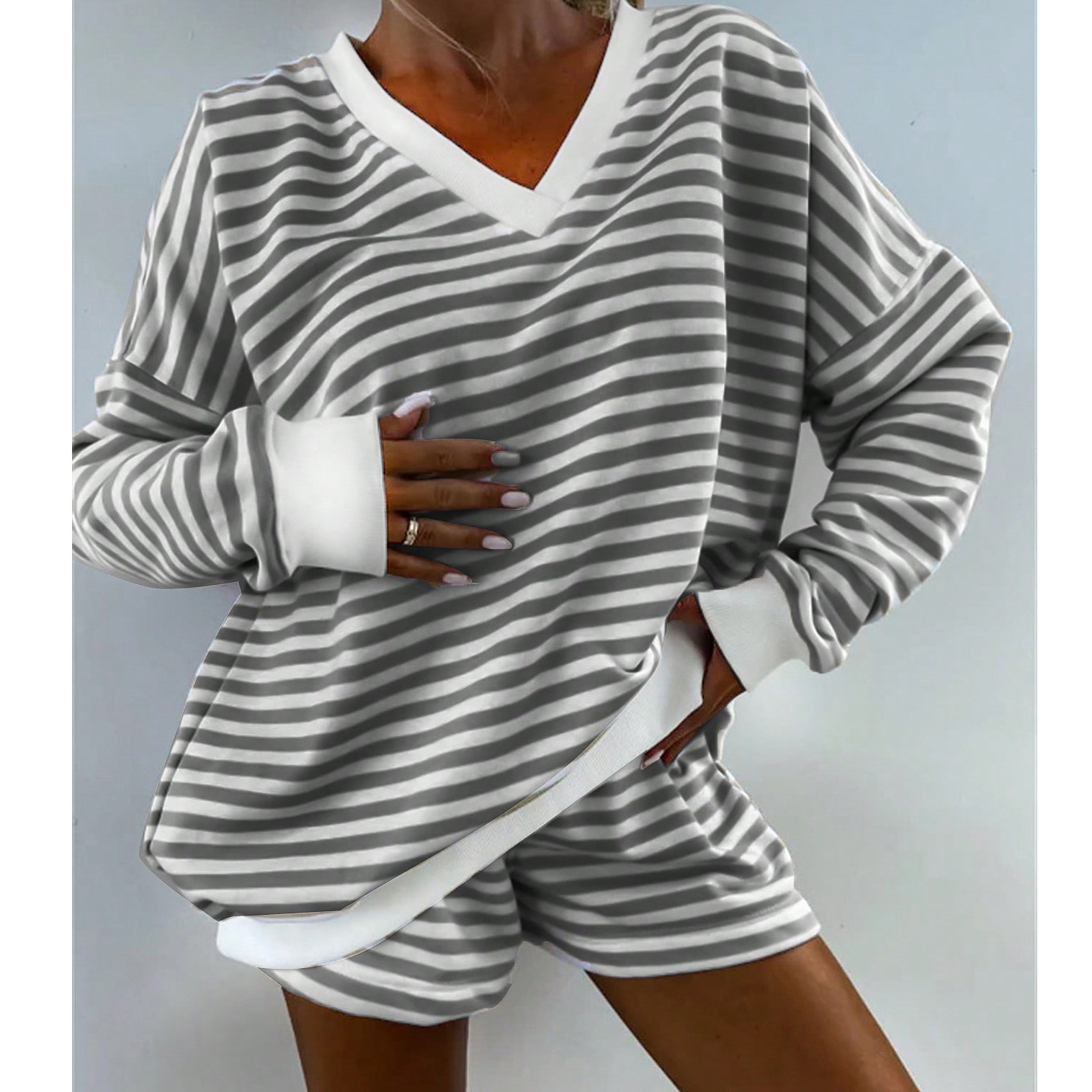 유럽풍 인스타 감성 스트라이프 홈웨어 파자마 세트 여성용 V넥 멀티컬러 긴팔 반바지 캐주얼웨어