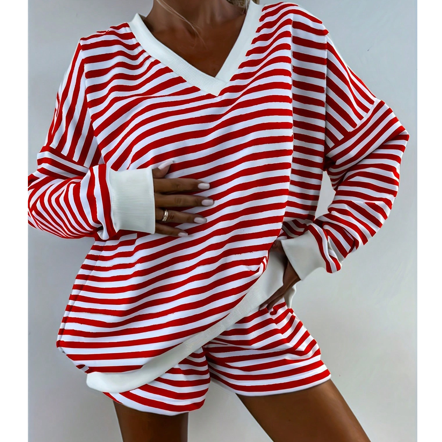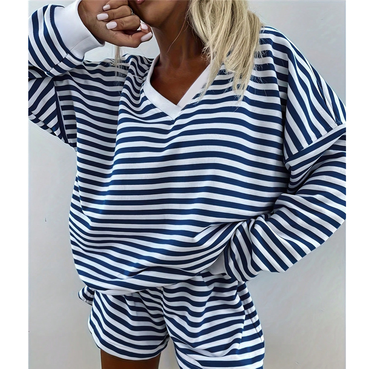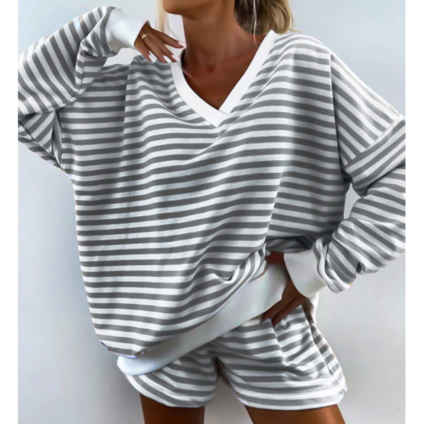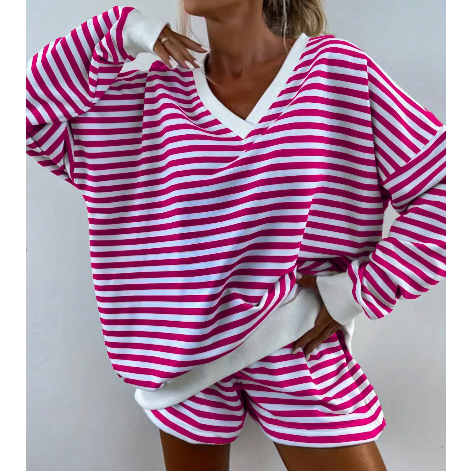 유럽풍 인스타 감성 스트라이프 홈웨어 파자마 세트 여성용 V넥 멀티컬러 긴팔 반바지 캐주얼웨어