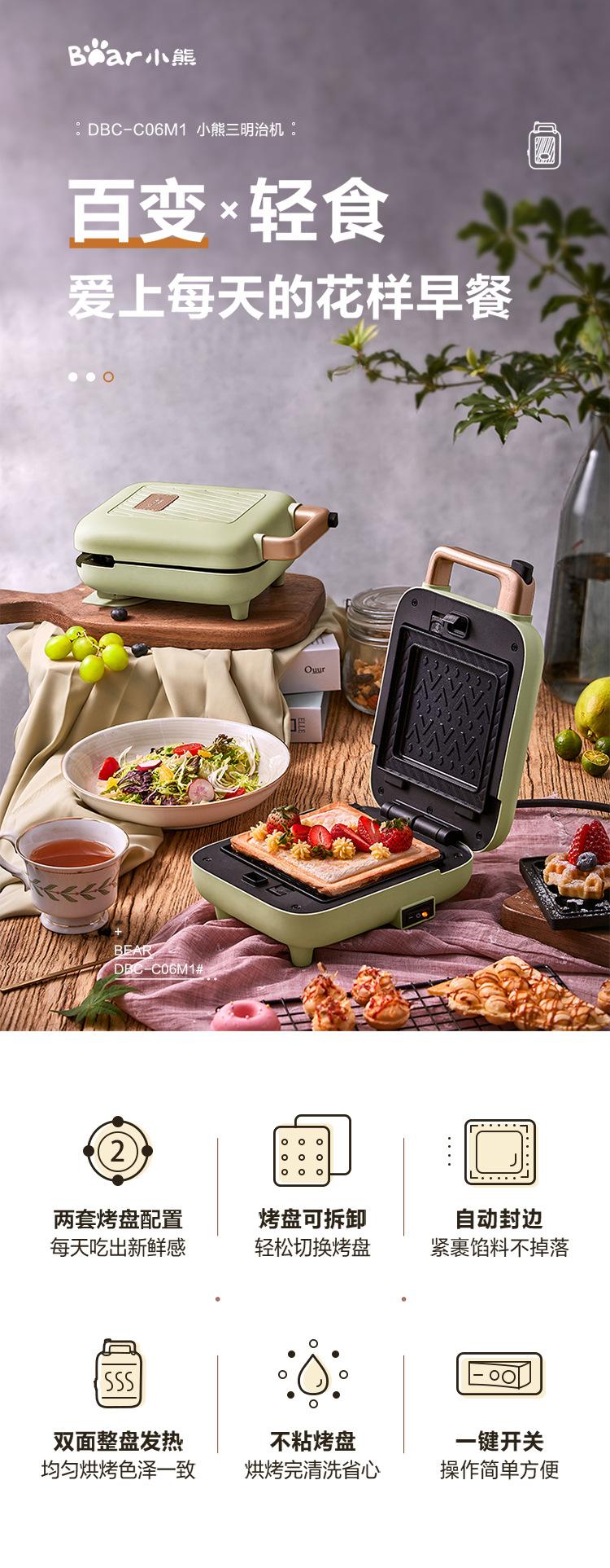 곰 샌드위치 메이커 DBC-C06M1 전기 베이킹 팬 상단 및 하단 접시 탈착식 및 세척 가능한 양면 가열 아침 식사 메이커 트위스터