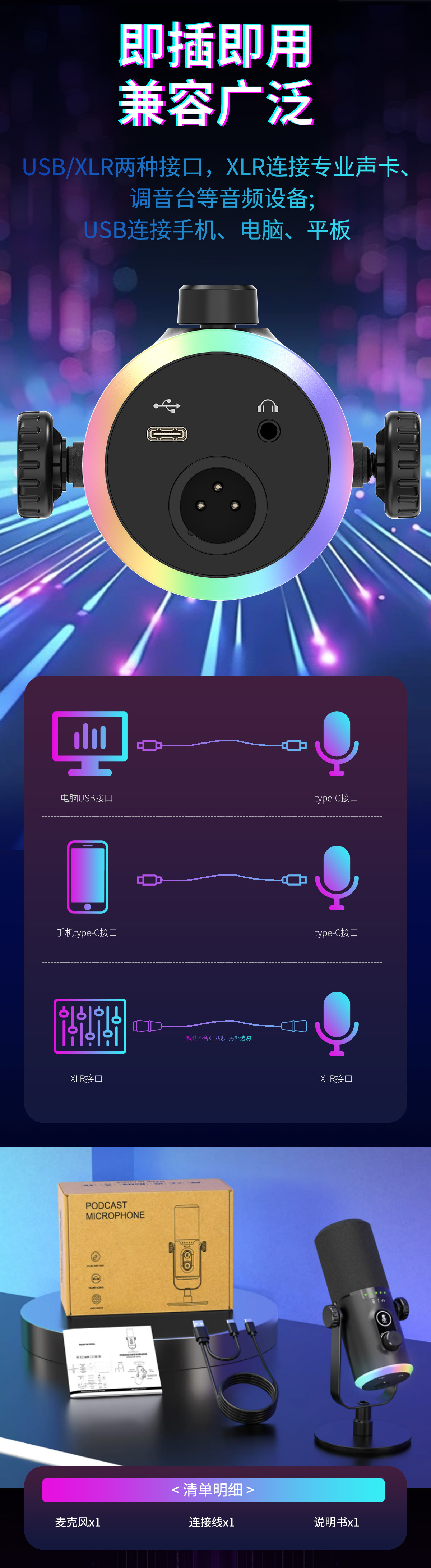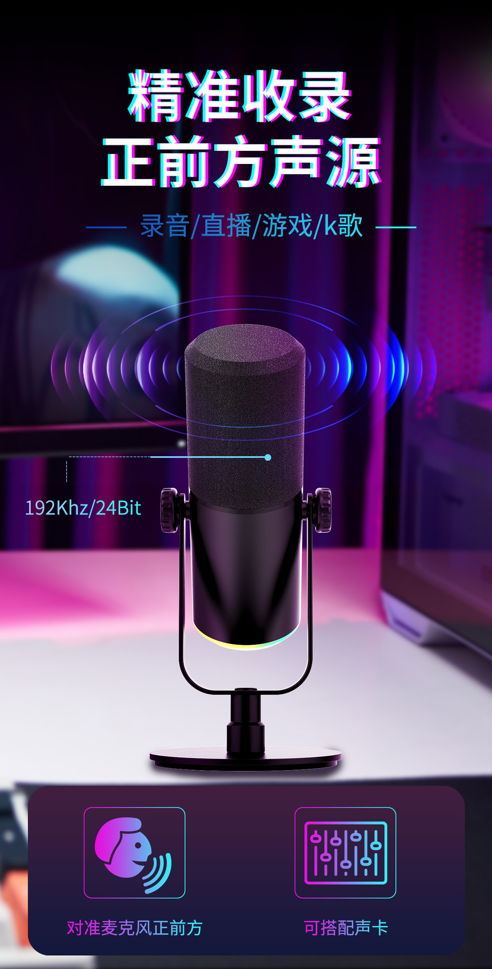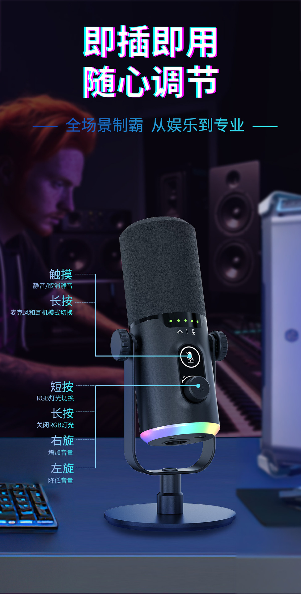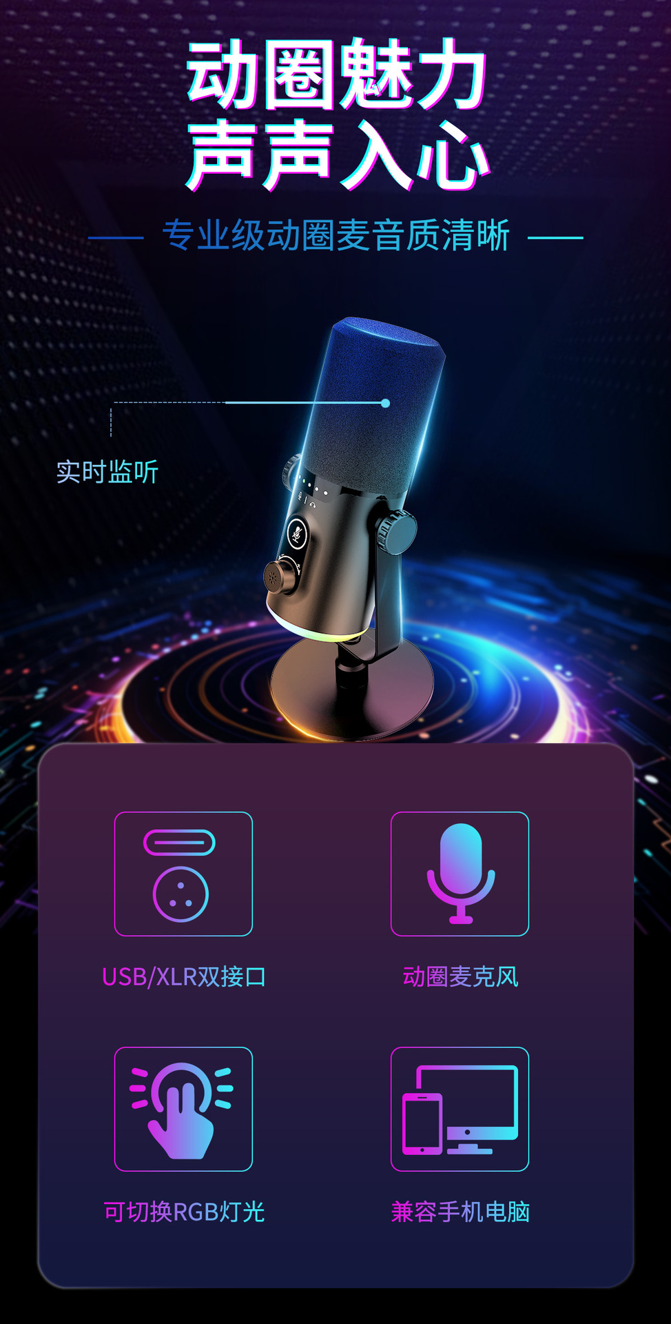 Jinweihang 개인 모델 다이나믹 USB 마이크 게임 마이크 녹음 스튜디오 전문 RGB 마이크 2024 새 모델
