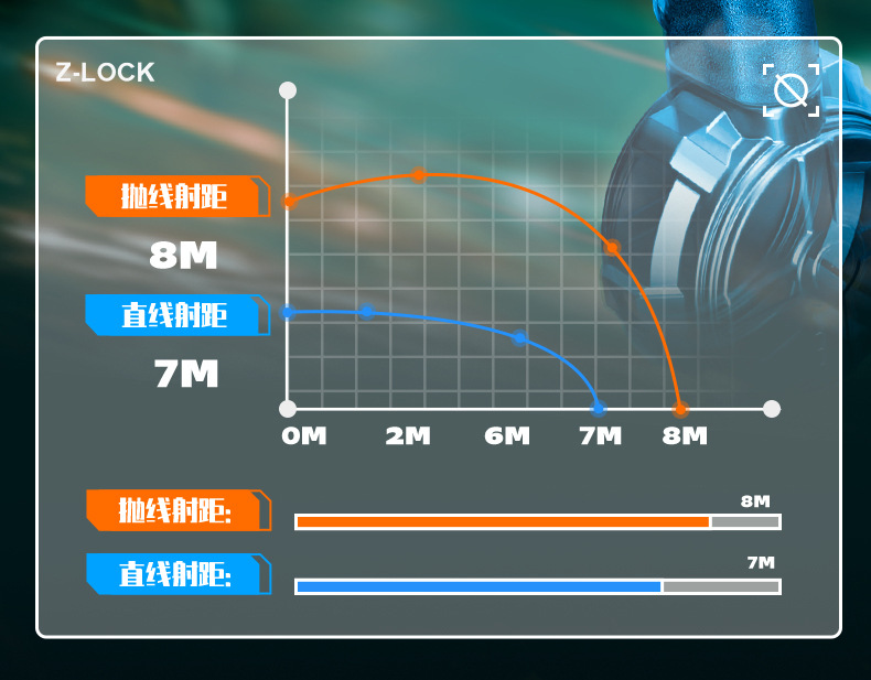 射程(直线射程、抛线射程):直线射程7米,抛线射程9米
