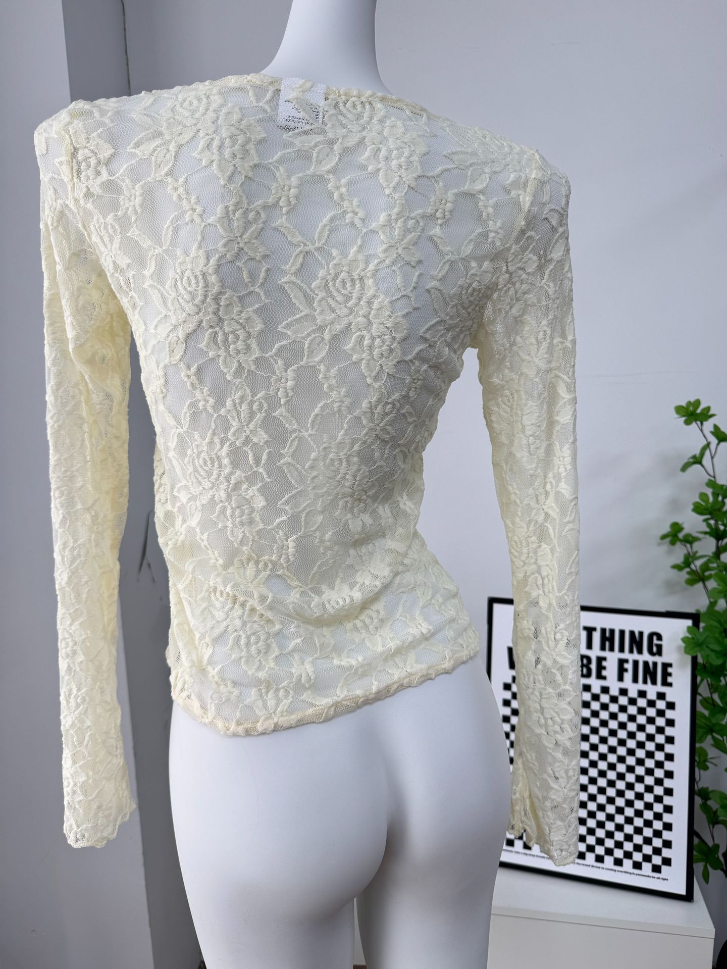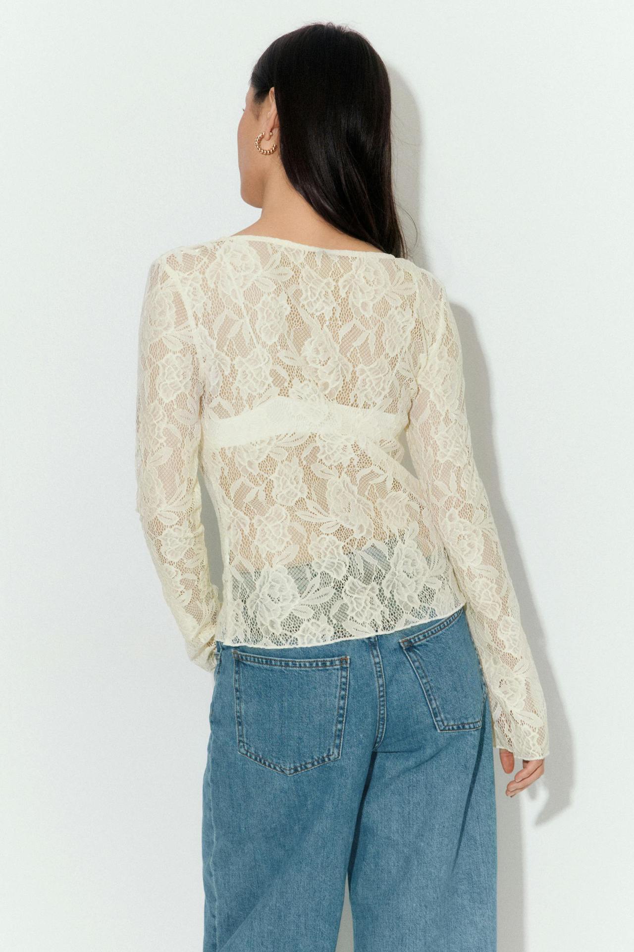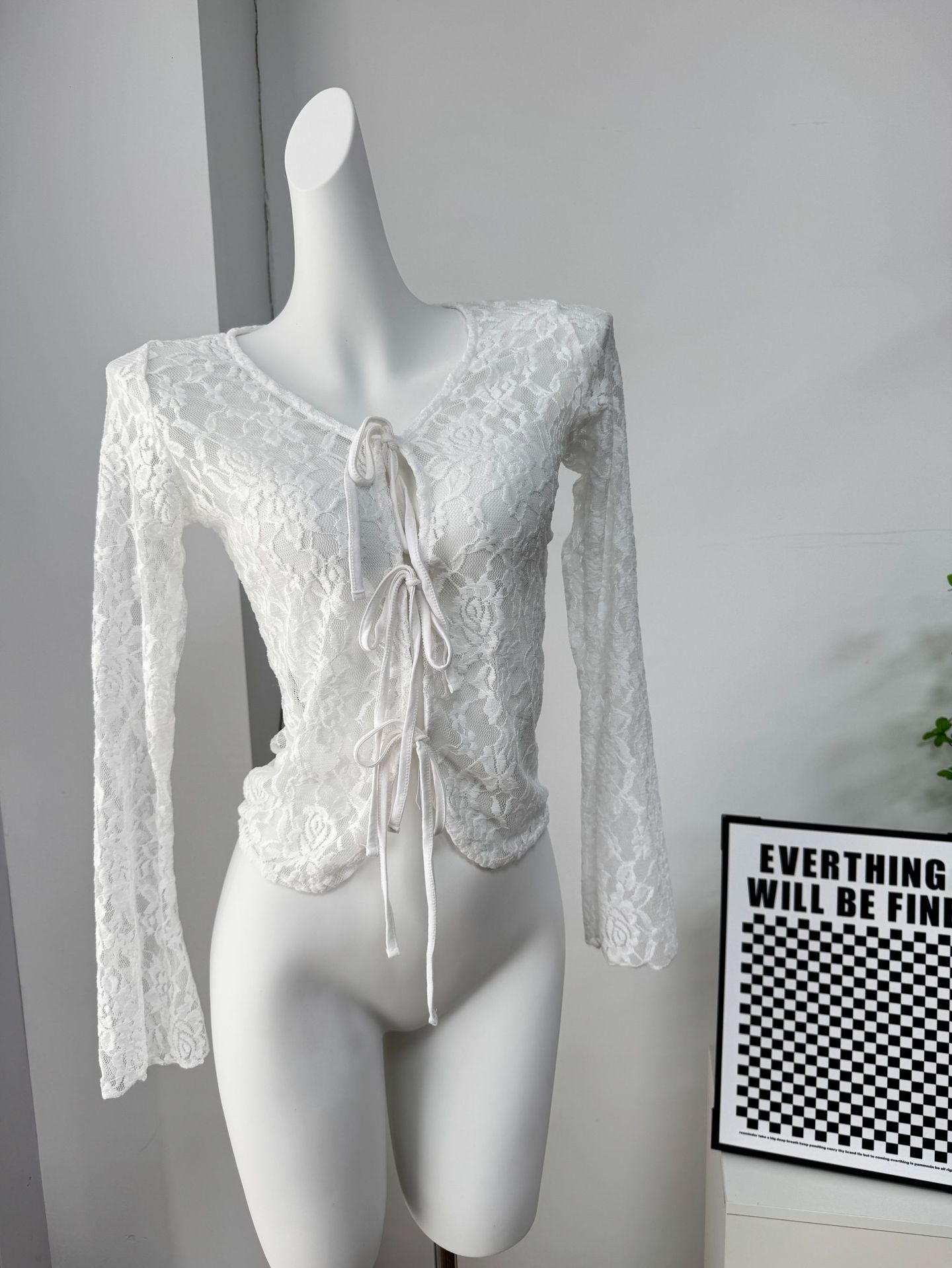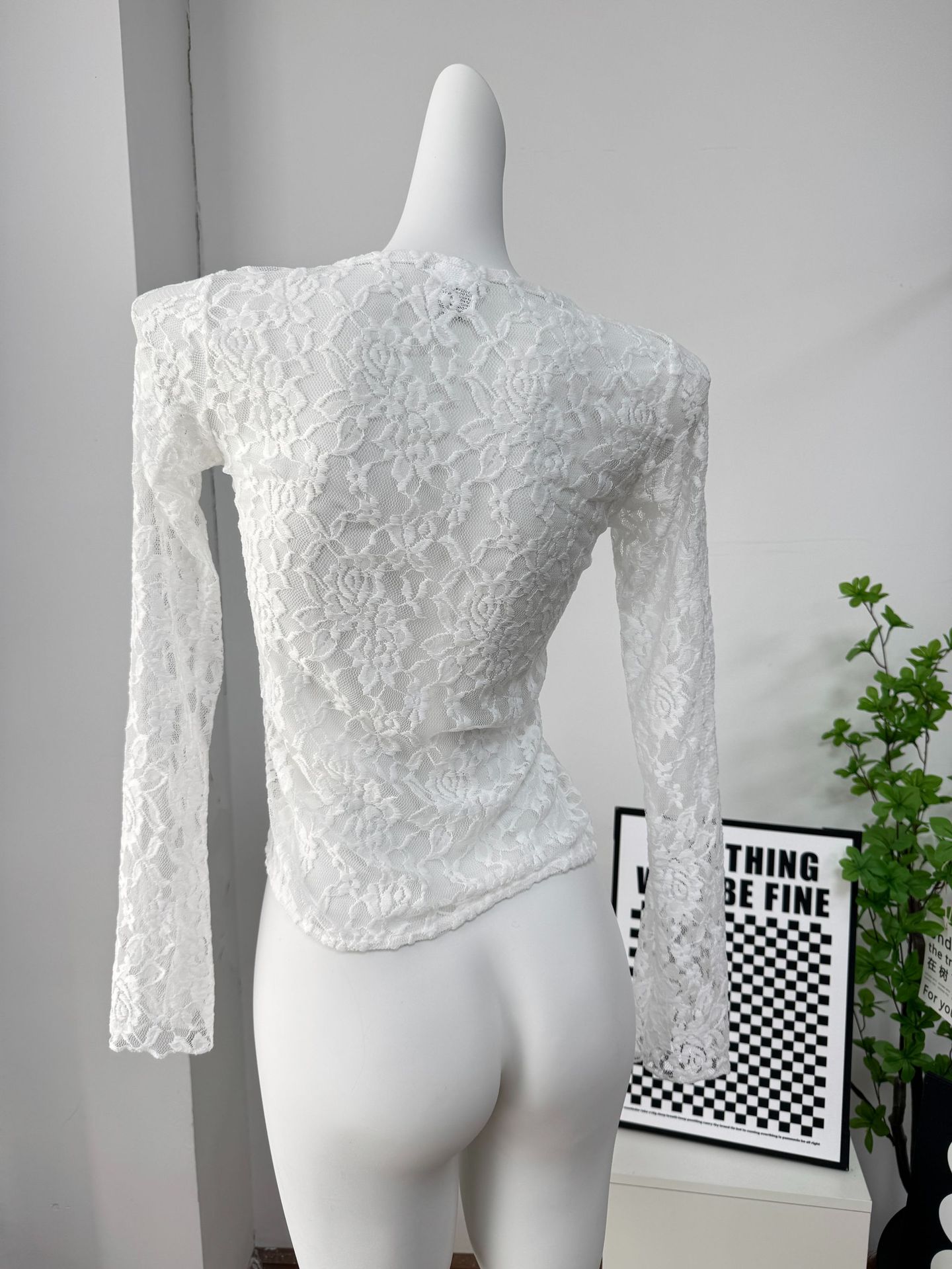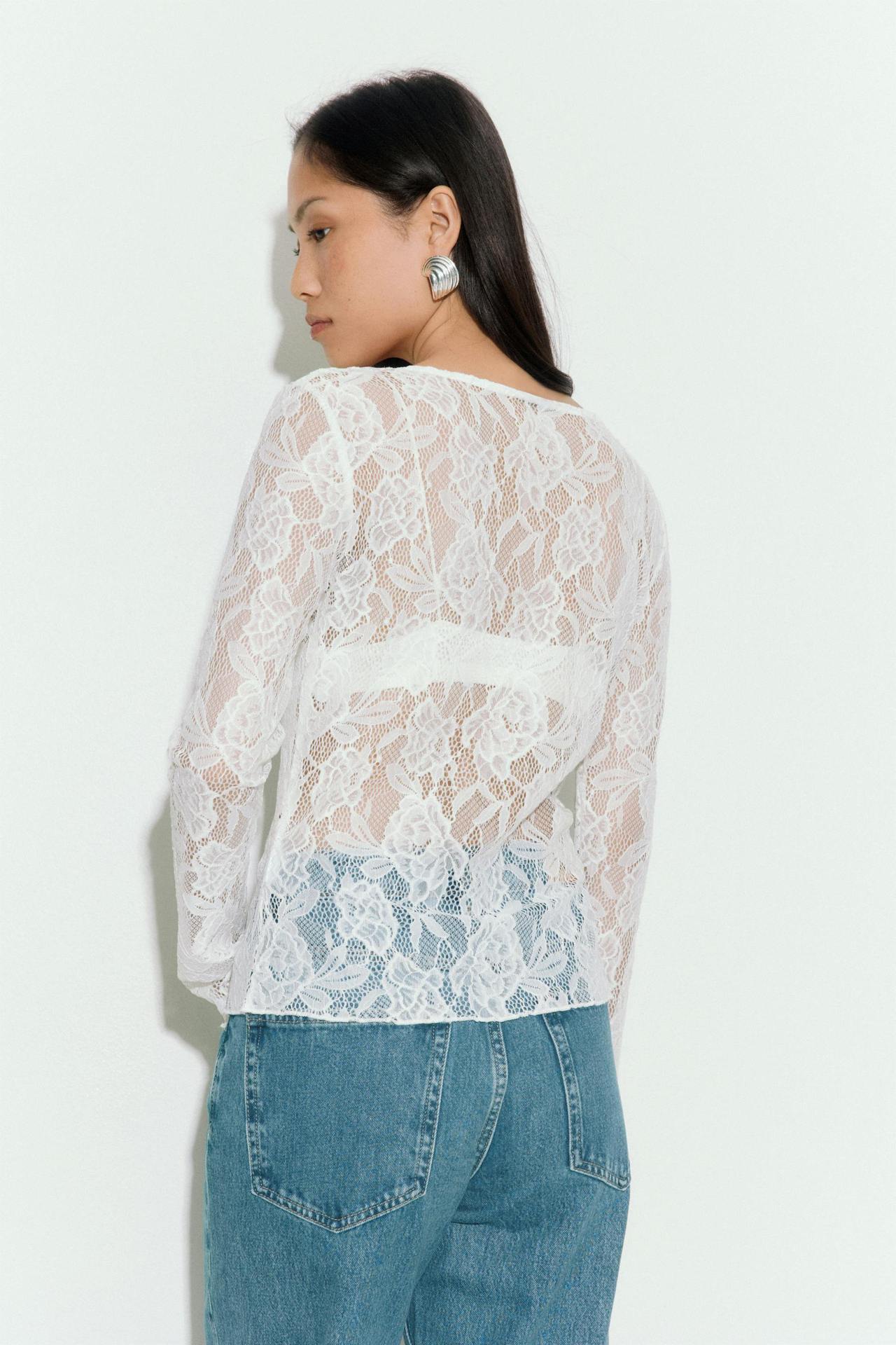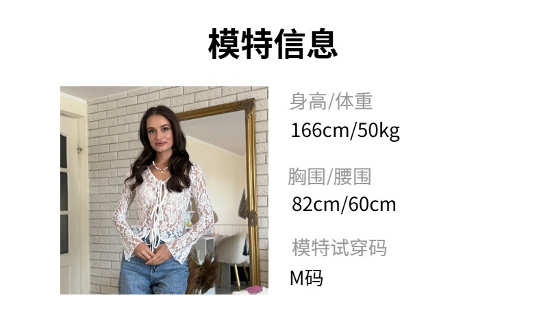 여성을위한 틈새 디자인 중공 흰색 긴팔 레이스 셔츠 여름 새로운 슬림 피트 니트 레이스 탑스토어 가기