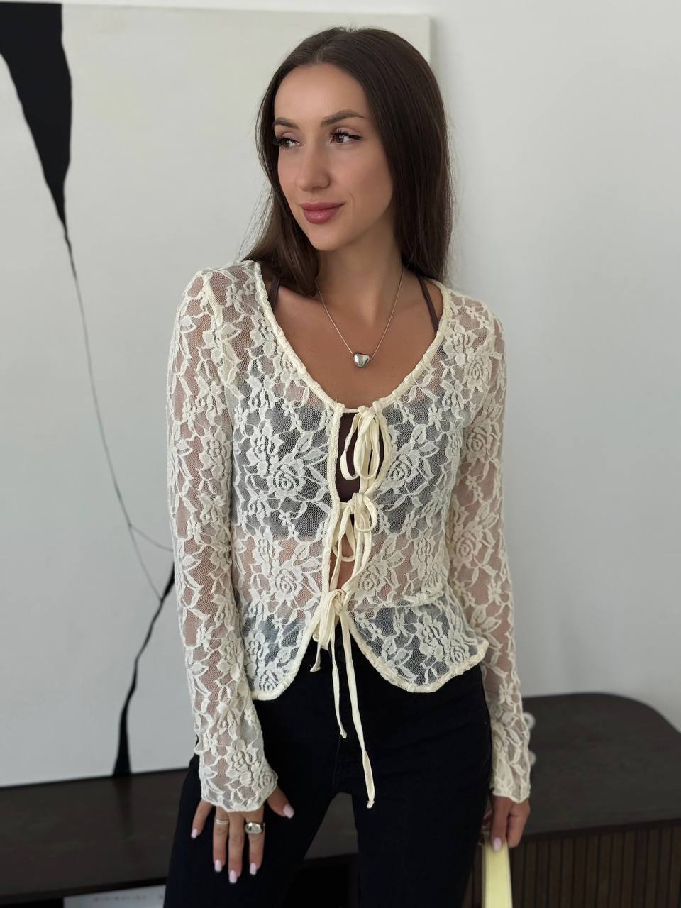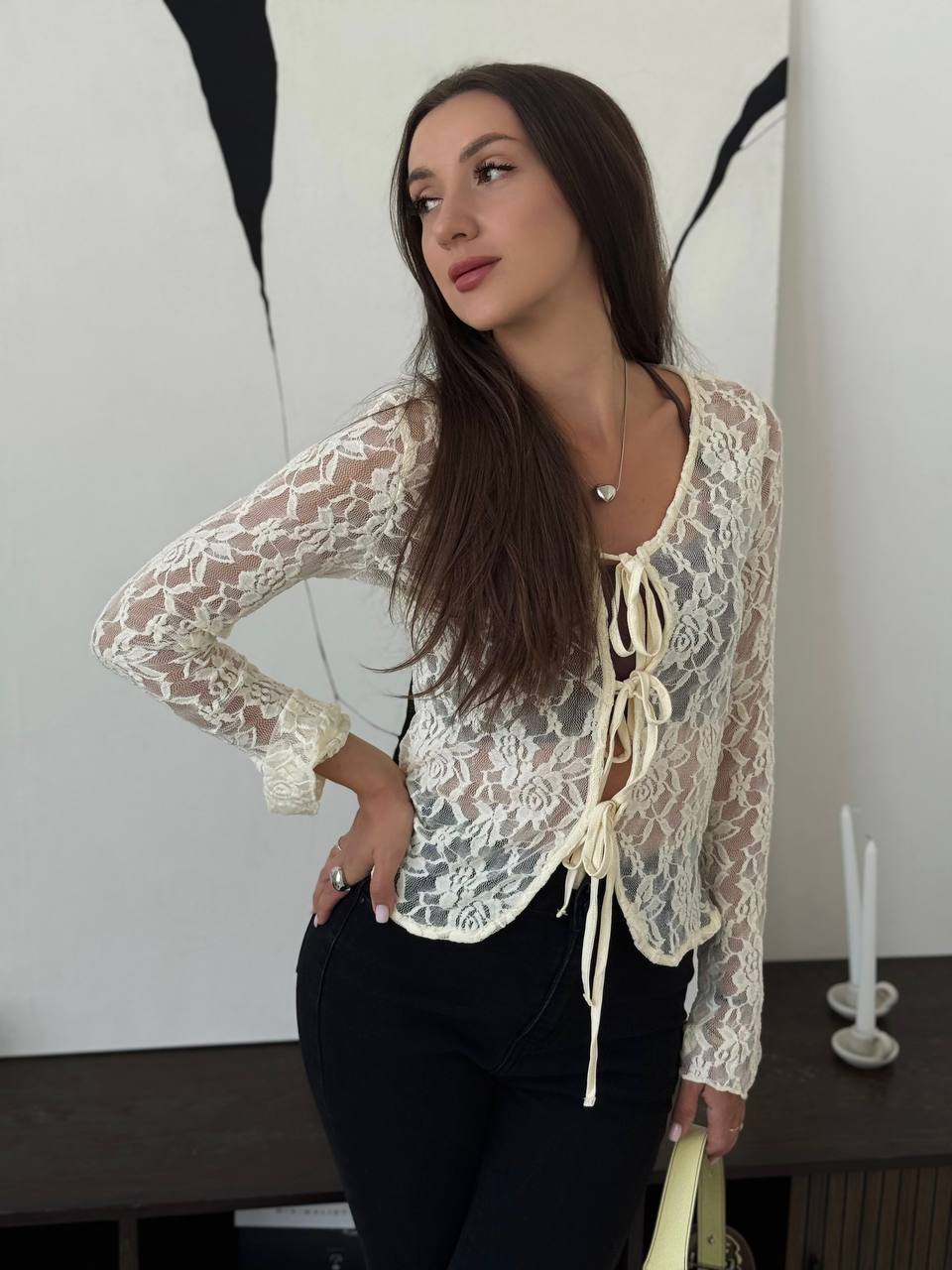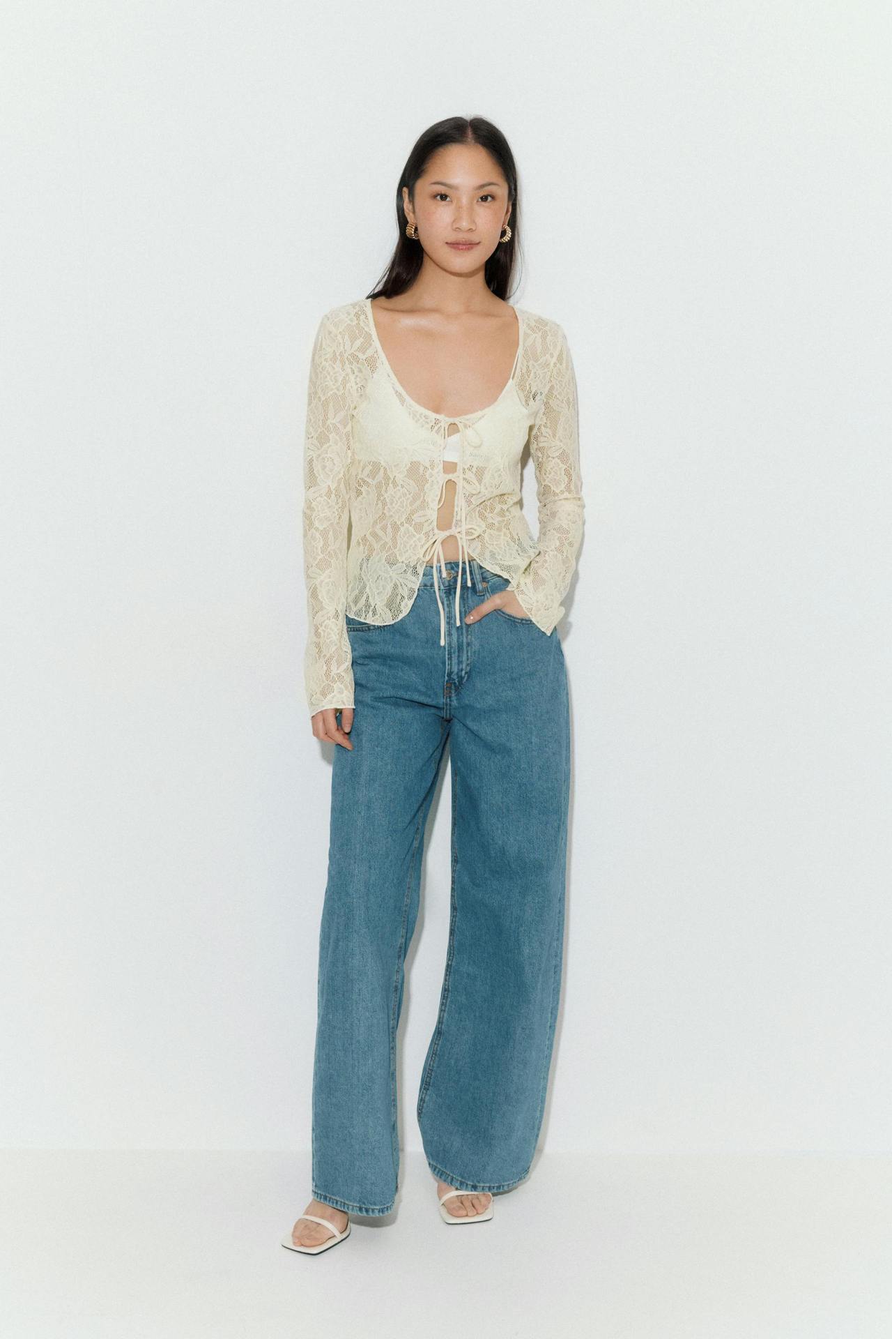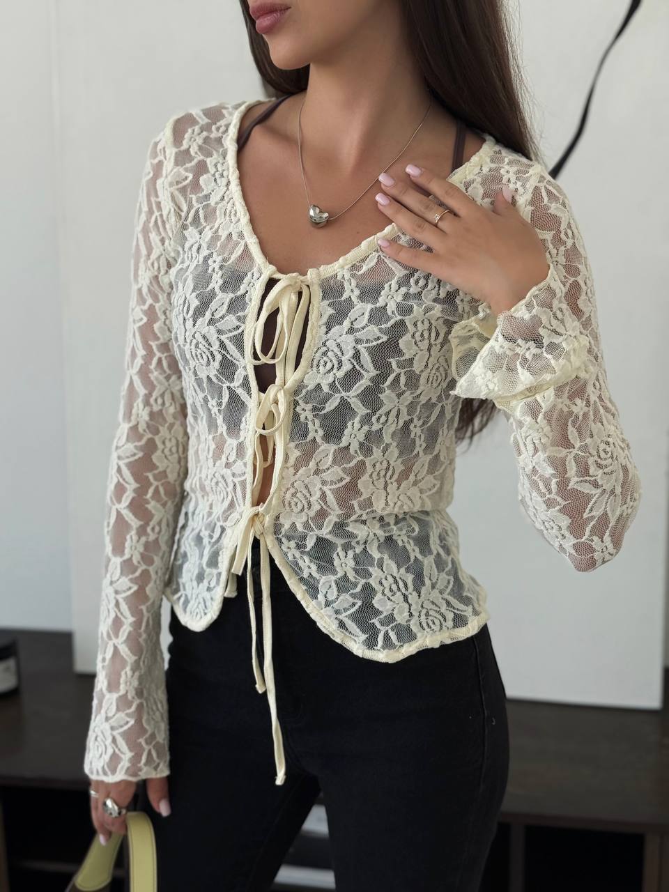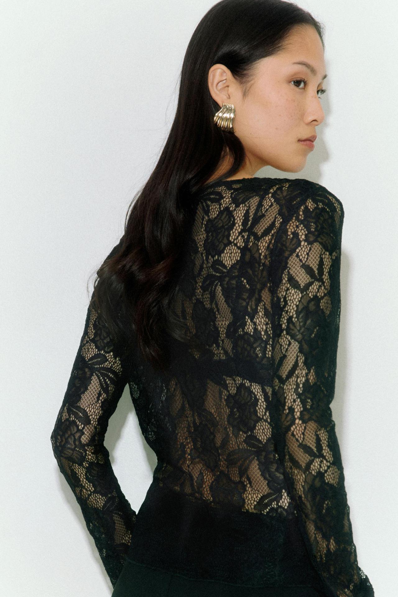 여성을위한 틈새 디자인 중공 흰색 긴팔 레이스 셔츠 여름 새로운 슬림 피트 니트 레이스 탑스토어 가기