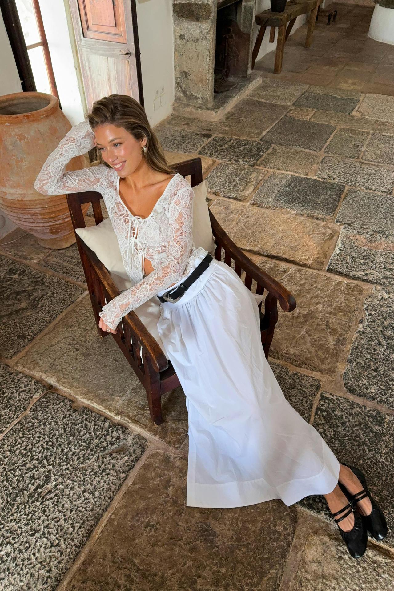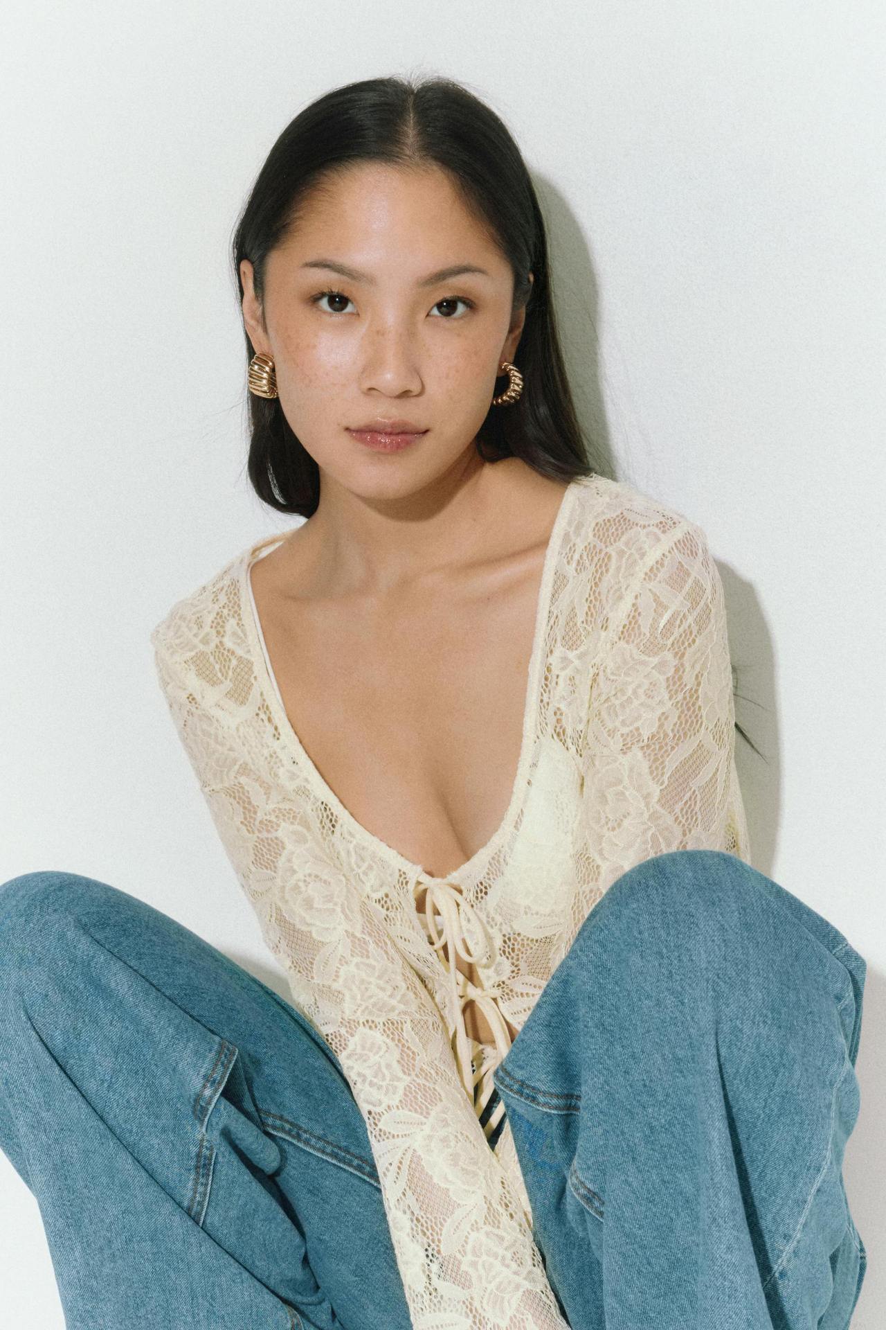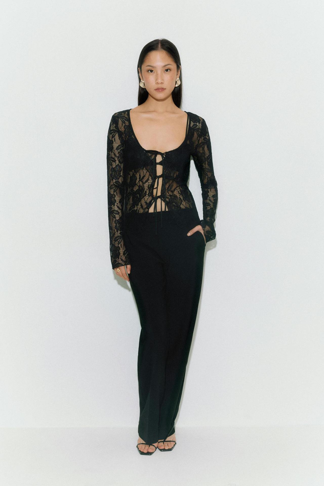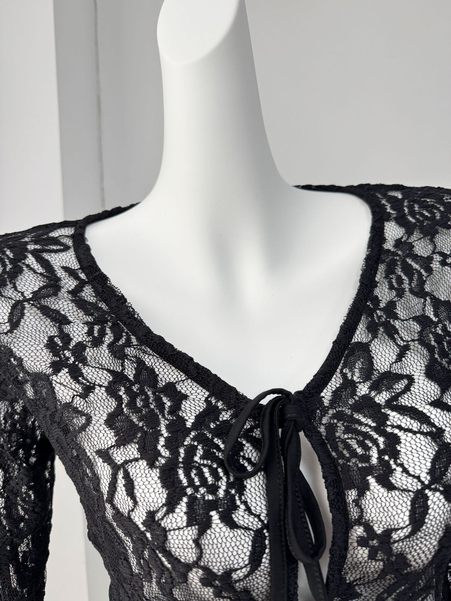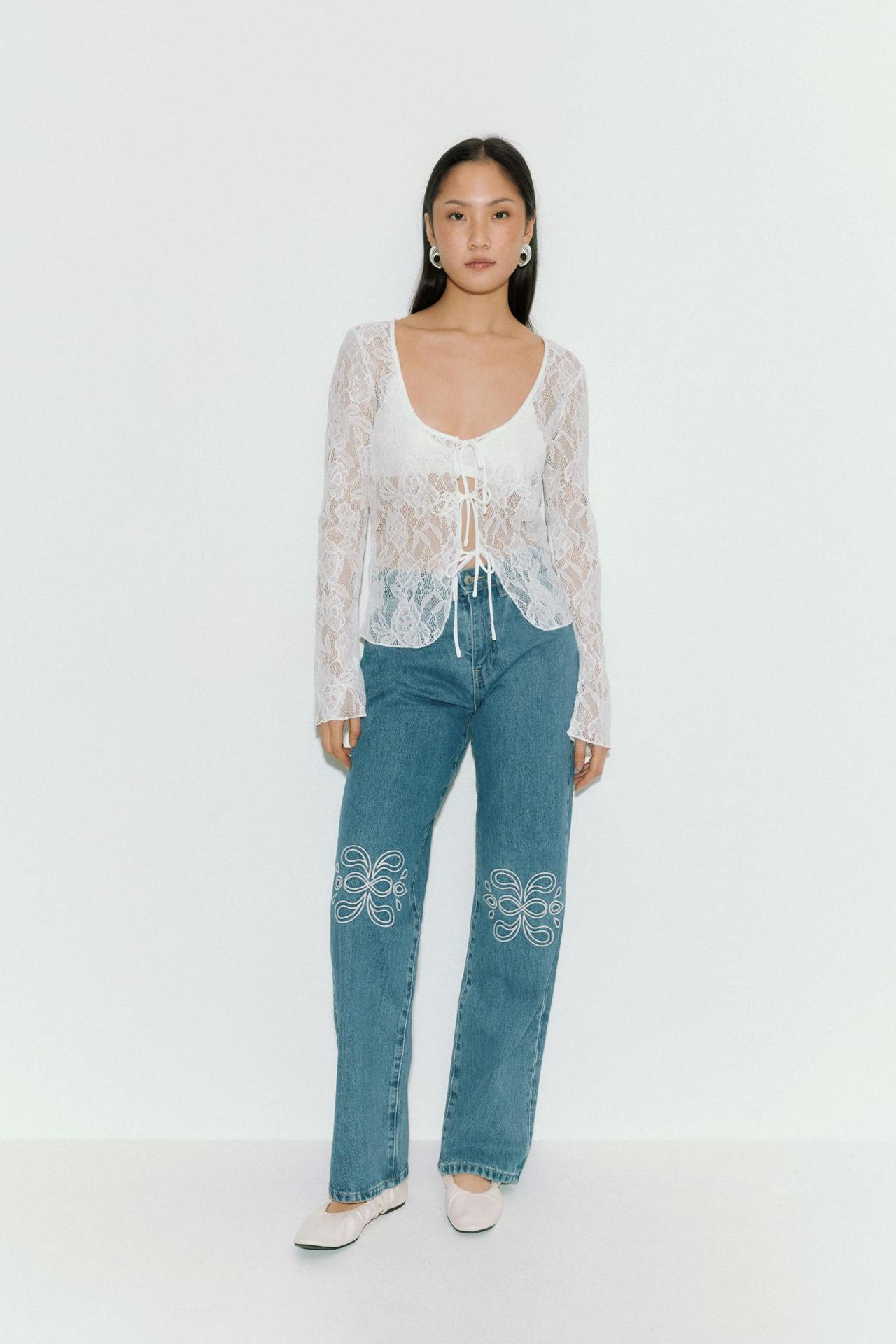 여성을위한 틈새 디자인 중공 흰색 긴팔 레이스 셔츠 여름 새로운 슬림 피트 니트 레이스 탑스토어 가기