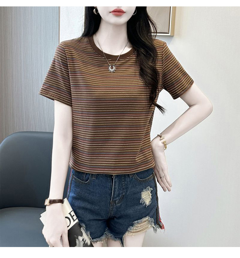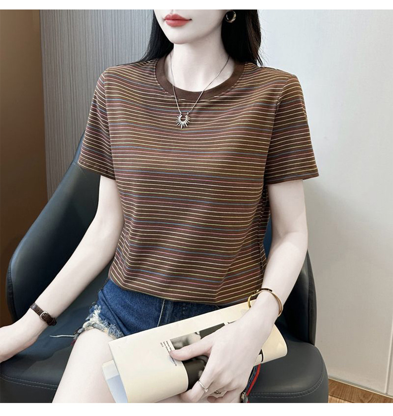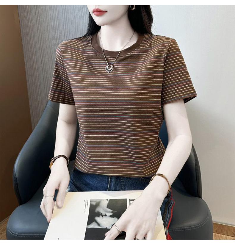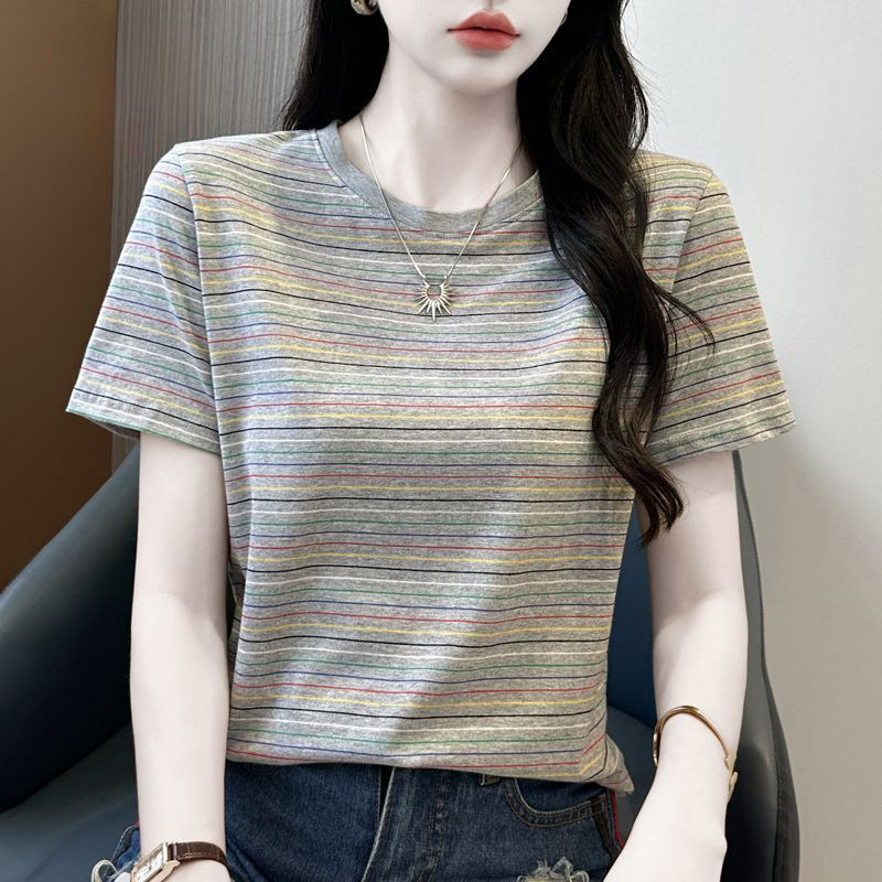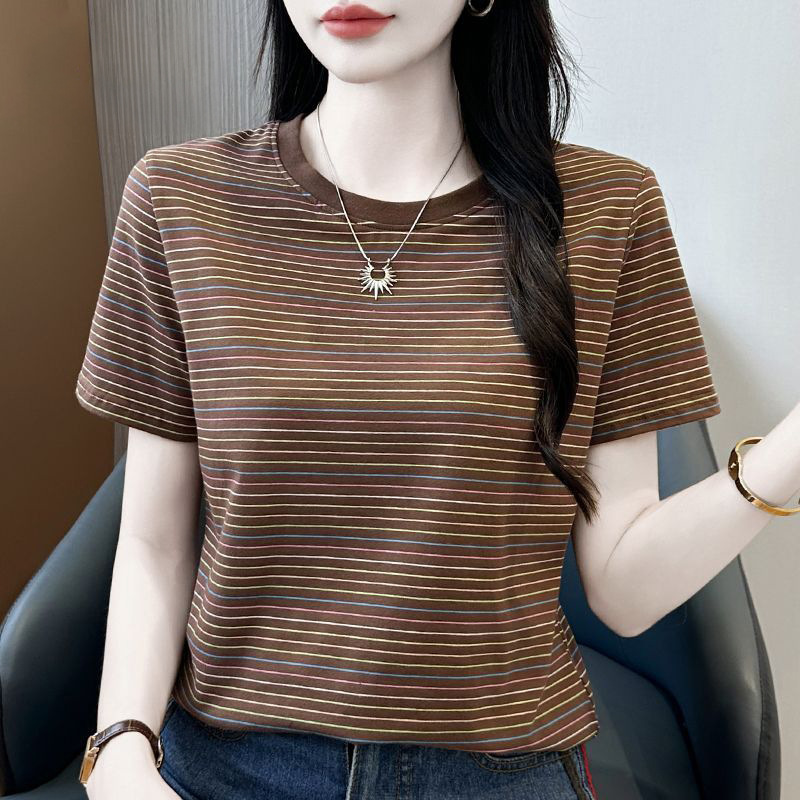 여성을위한 코튼 스트라이프 반팔 티셔츠 2025 새로운 여름 오른쪽 어깨 느슨한 슬림 라운드 넥 하이 엔드 반팔 티셔츠
