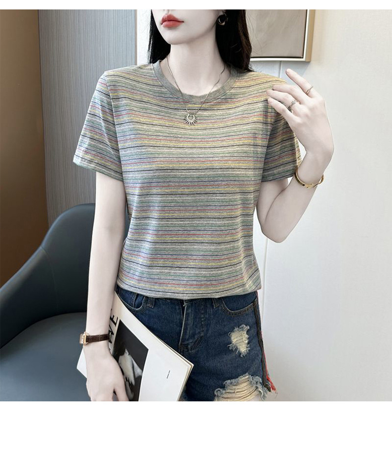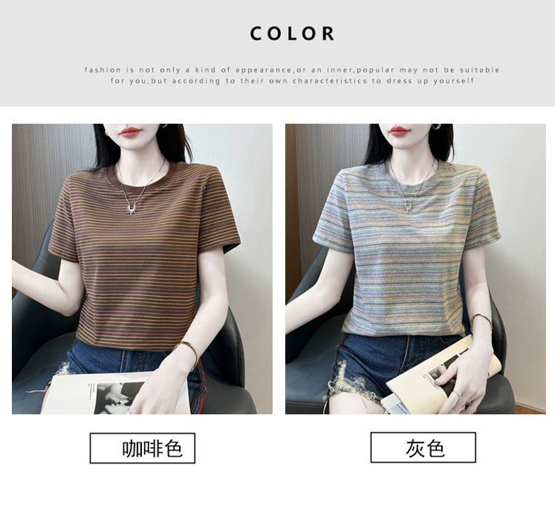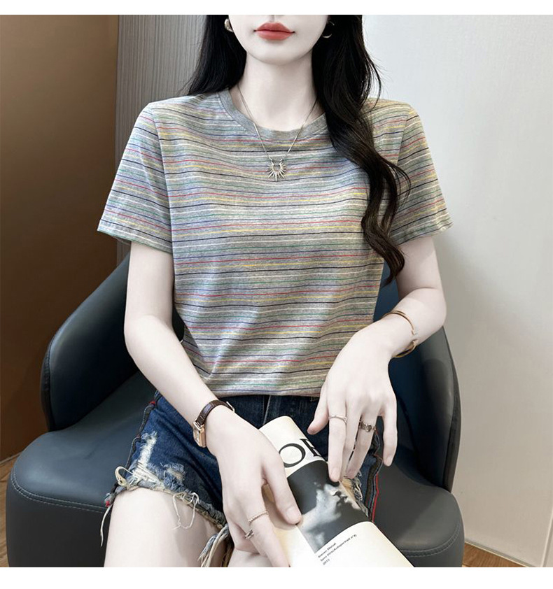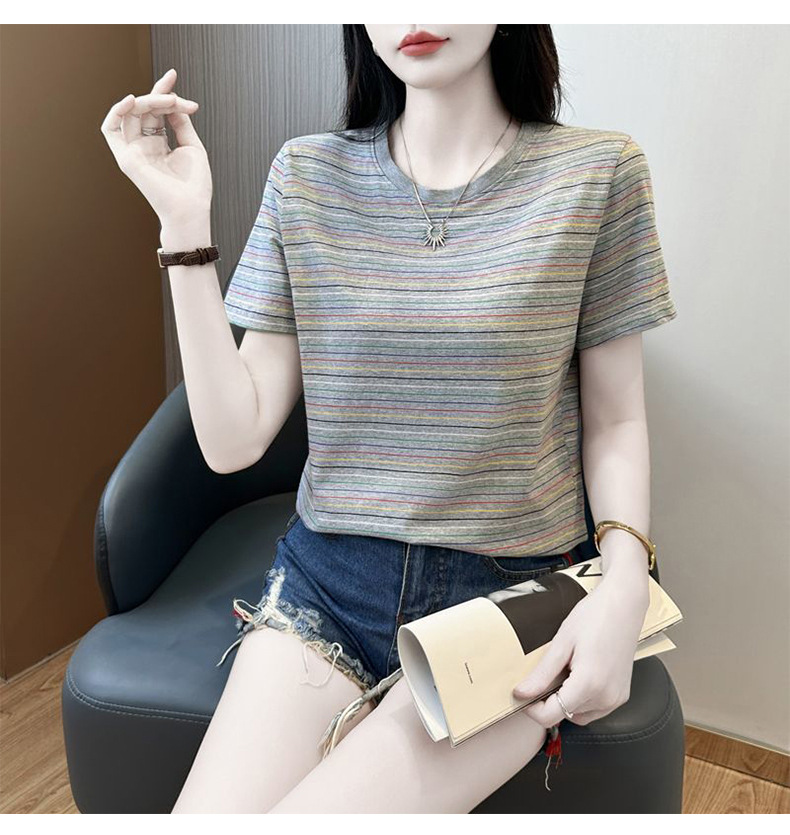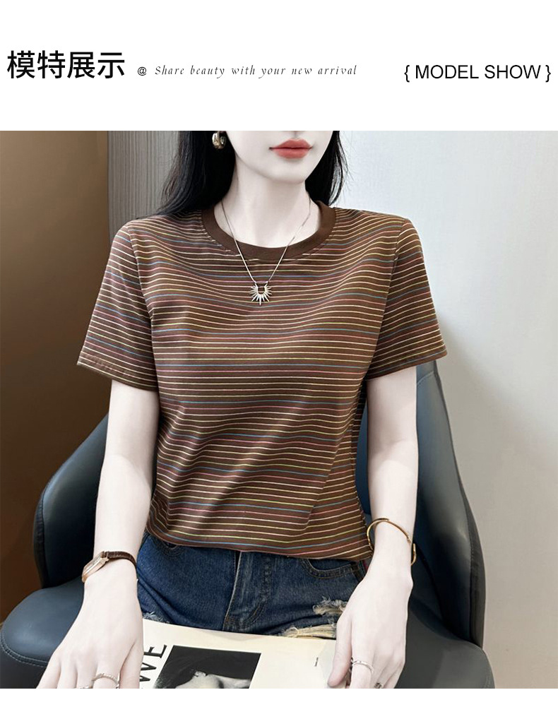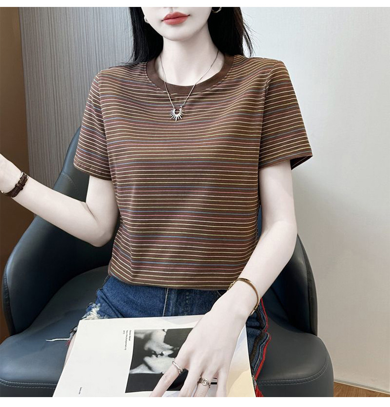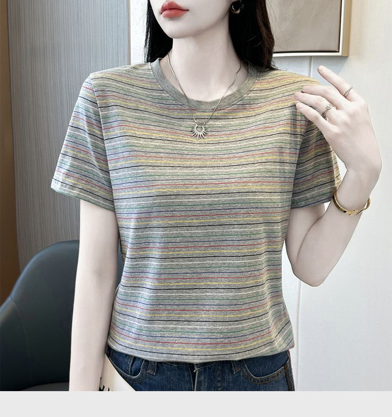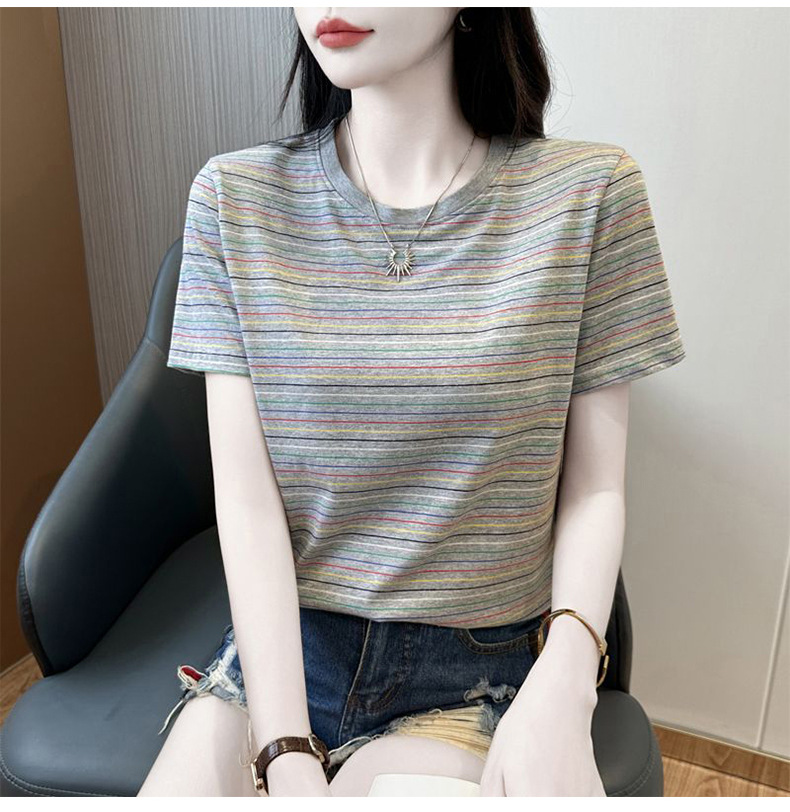 여성을위한 코튼 스트라이프 반팔 티셔츠 2025 새로운 여름 오른쪽 어깨 느슨한 슬림 라운드 넥 하이 엔드 반팔 티셔츠스토어 가기