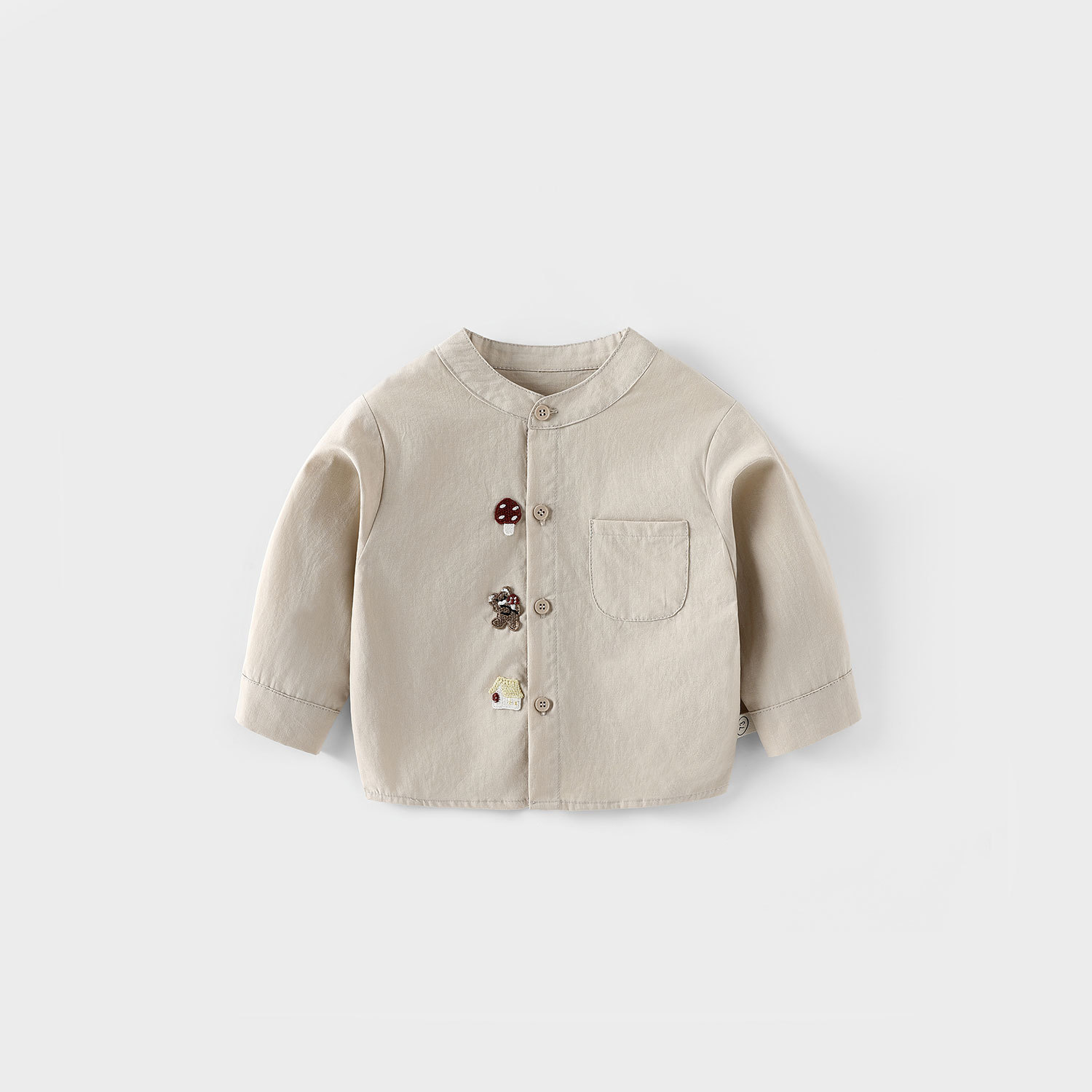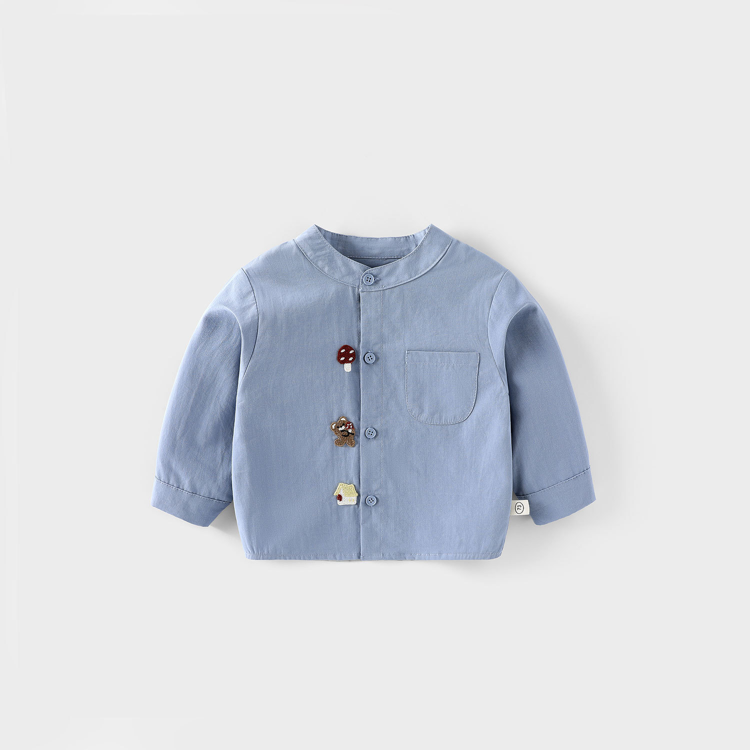 아동 패션 라벨 셔츠 2025 새로운 가을 소년의 세련된 한국 스타일 솔리드 컬러 셔츠 아기 스탠드 칼라 가을 의류스토어 가기
