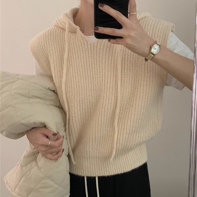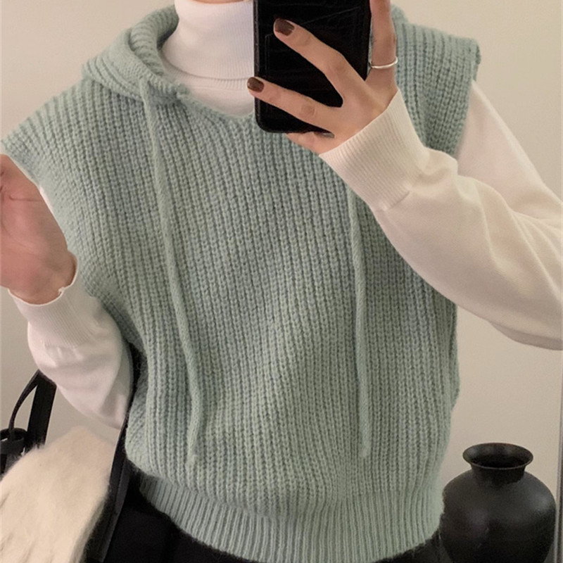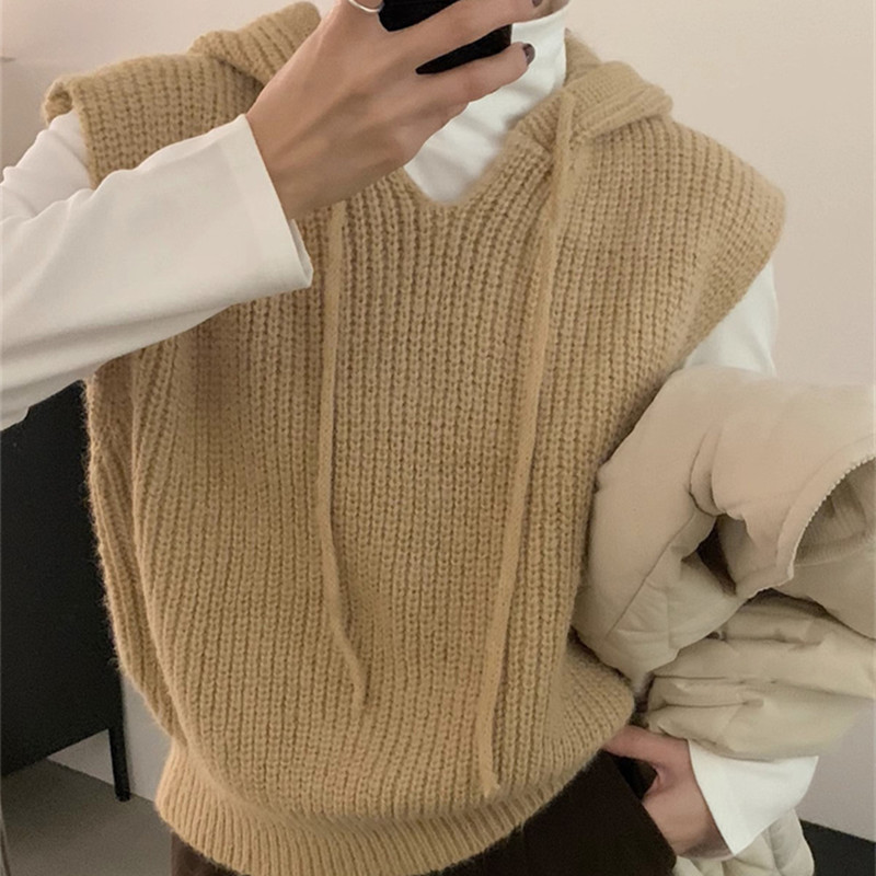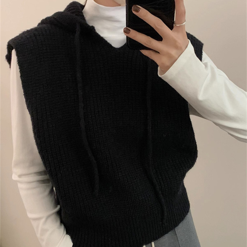 디자인 캐주얼 솔리드 컬러 스태킹 탑 조끼 여성 가을, 겨울 니트 후드 아우터 민소매 조끼 스웨터