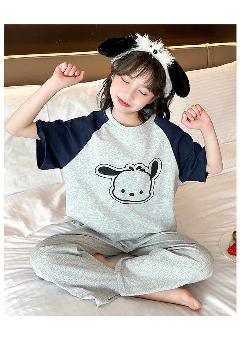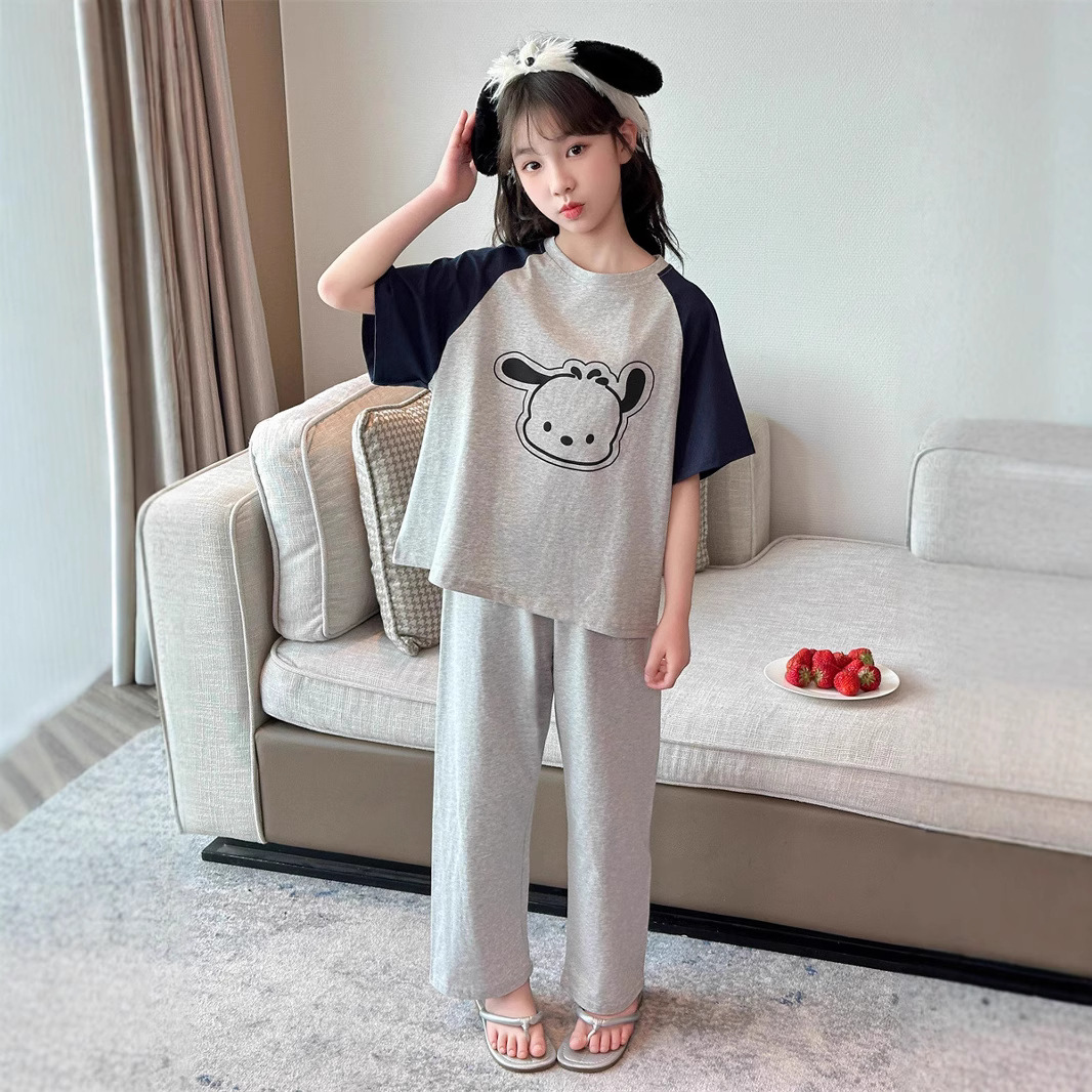 어린이 순면 잠옷 세트 여름 소녀 반팔 바지 만화 큰 어린이를위한 얇은 소녀 귀여운 가정 옷