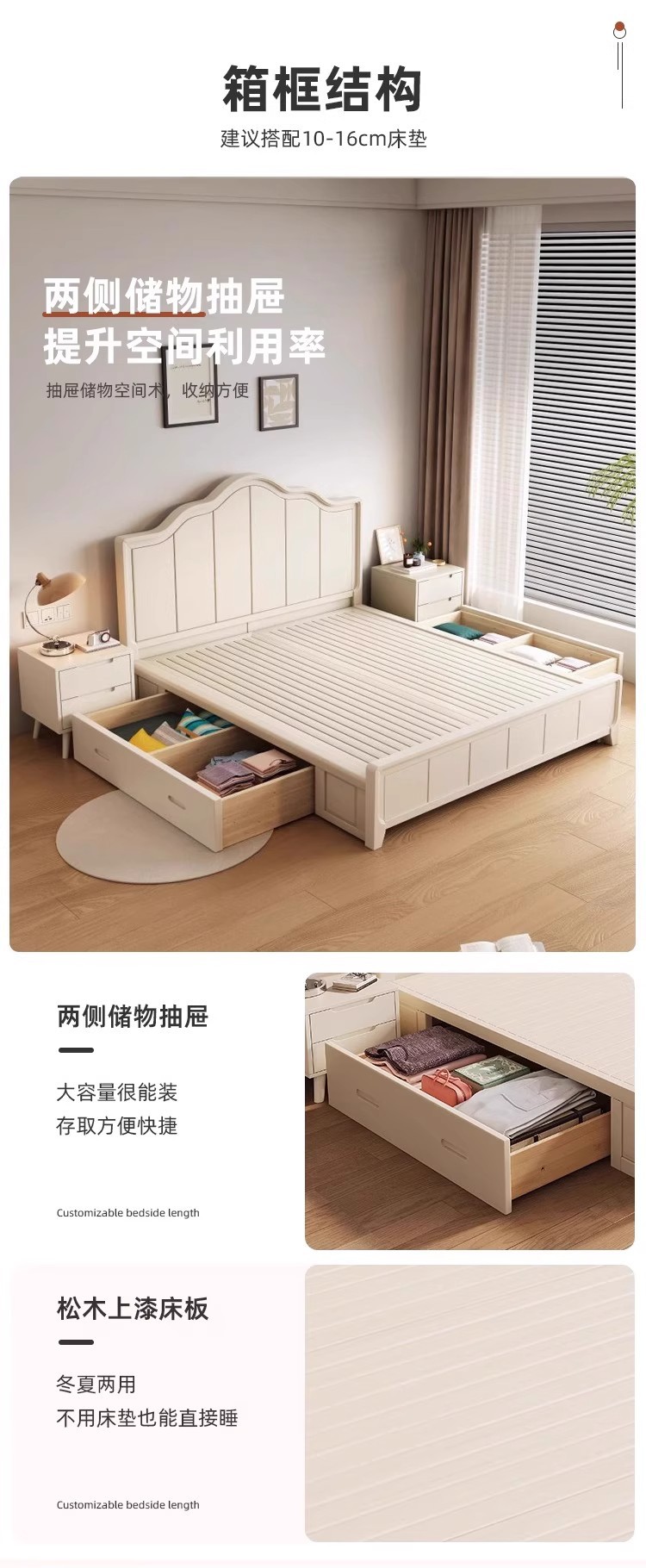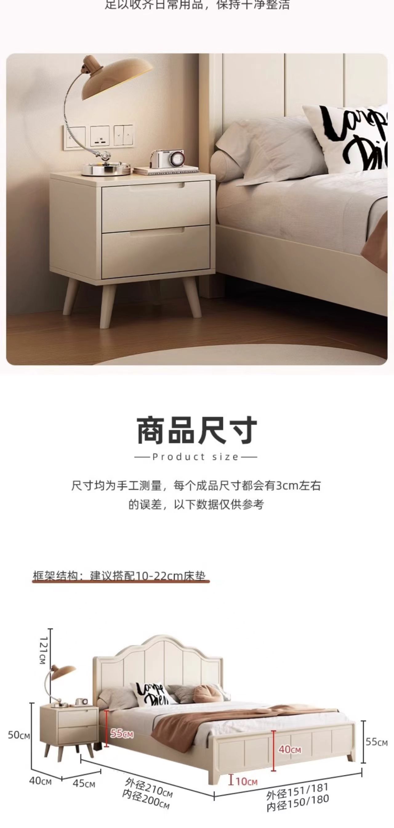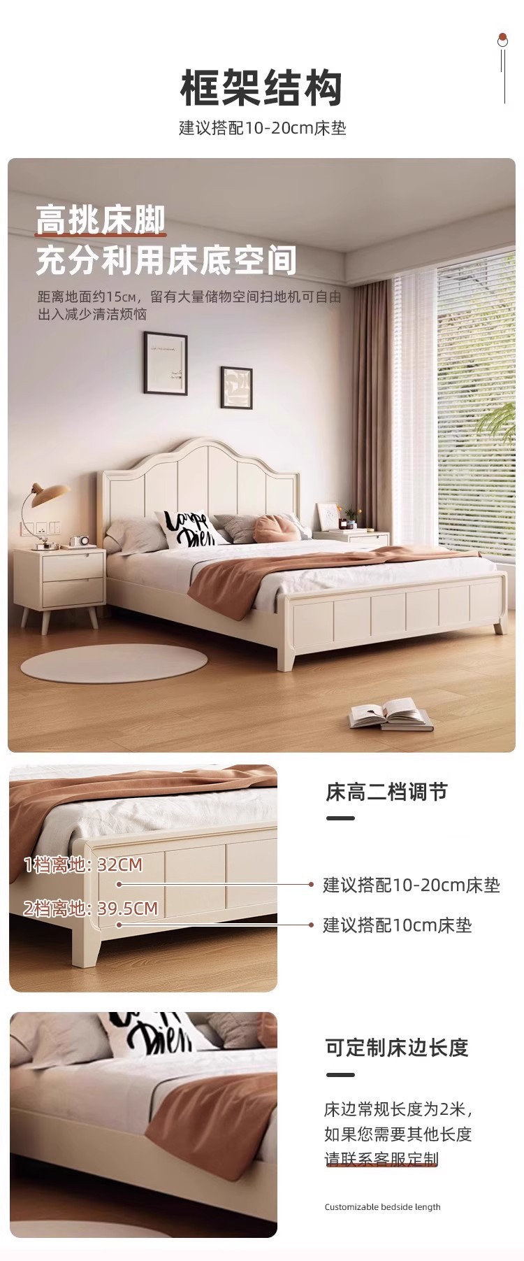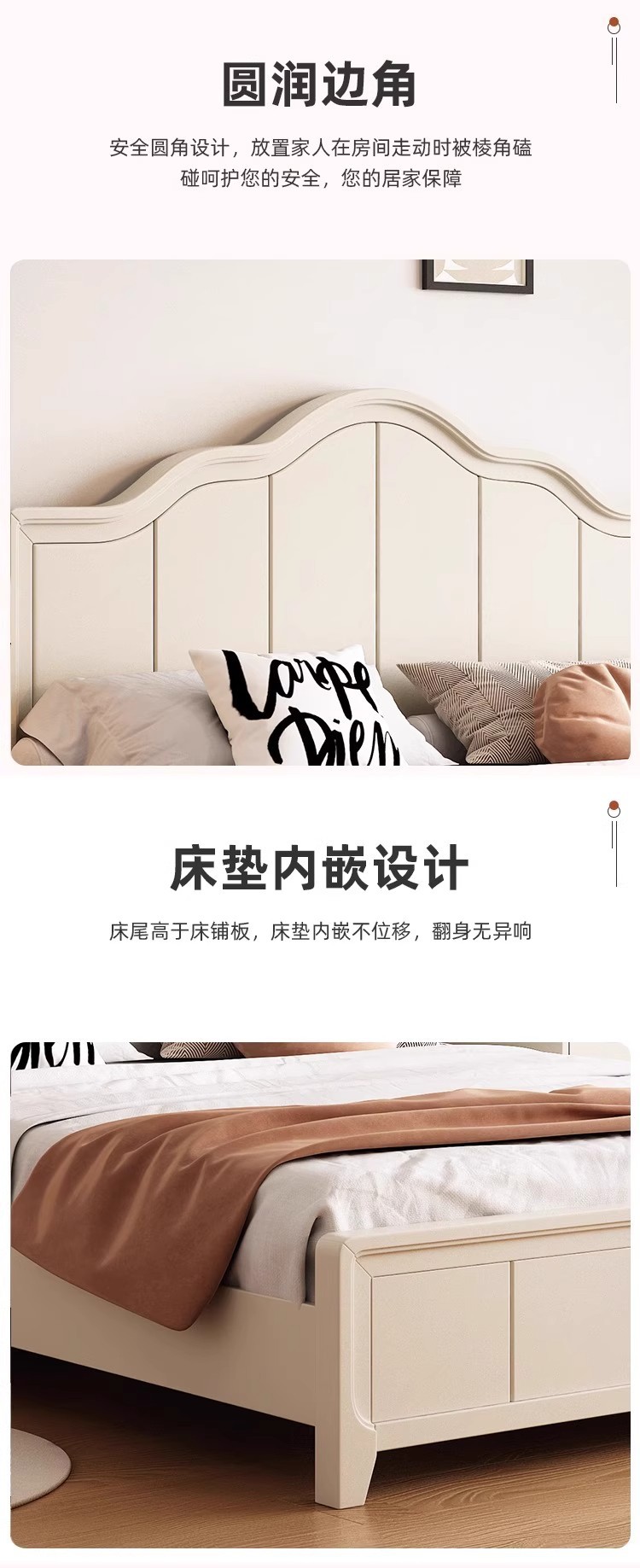 북유럽 흰색 단단한 나무 침대 현대 간단한 1.5m 싱글 및 더블 침대 크림 스타일 공주 침대 1.8m 마스터 침실 수납 침대