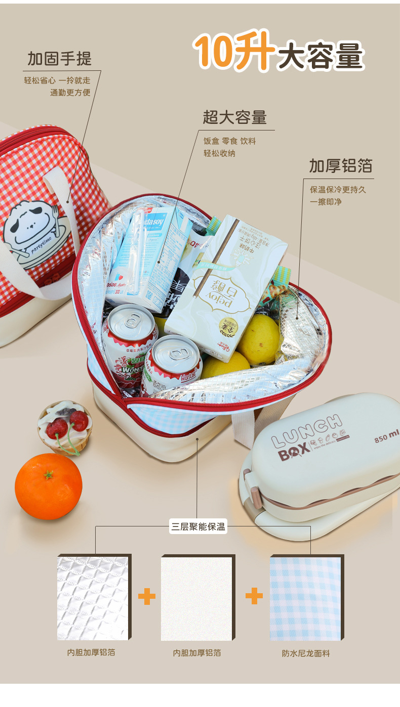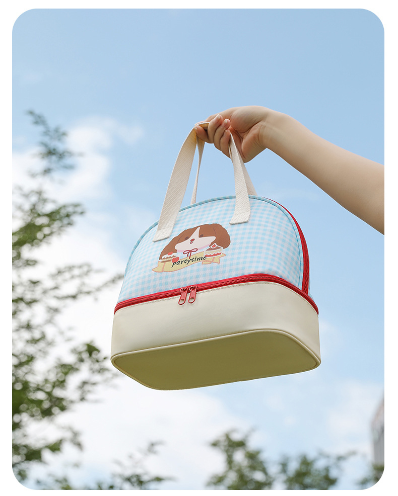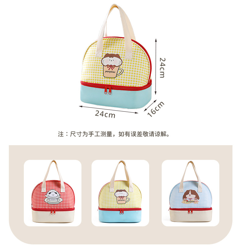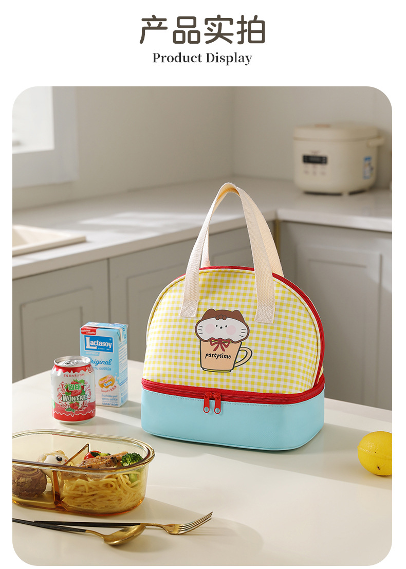 신입생 도시락 가방, 더블 레이어 만화 격자 무늬 도시락 가방, 직장인 도시락 가방, 야외 보온 가방