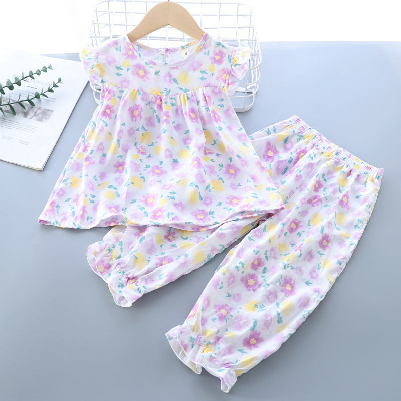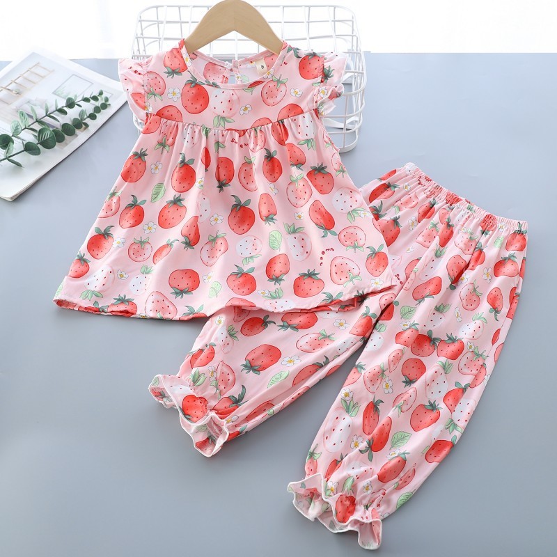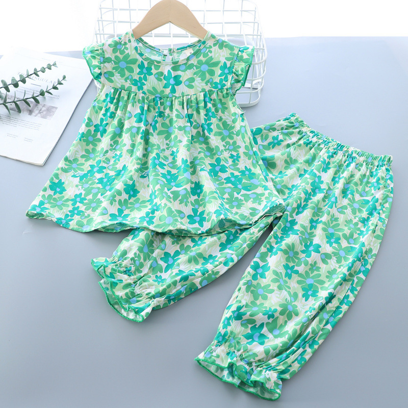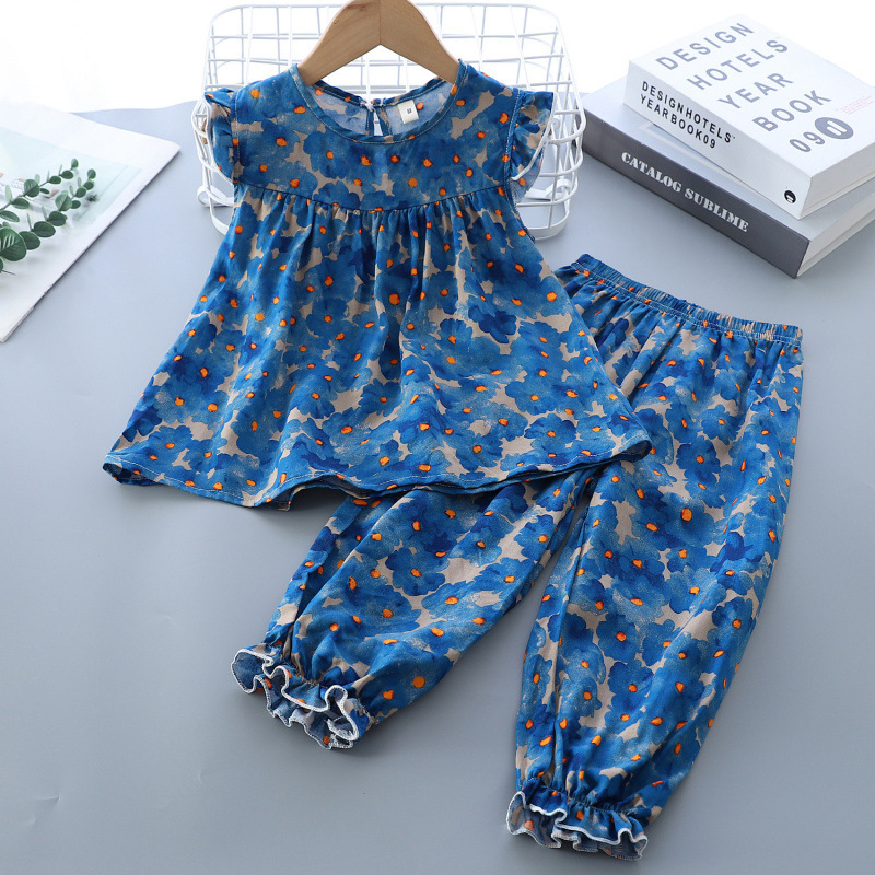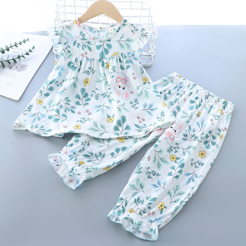 아동용 여름 면화 인공 면화 정장, 여아용 잠옷, 가정복, 유아용 얇은 조끼, 크롭 팬츠, 투피스 세트스토어 가기