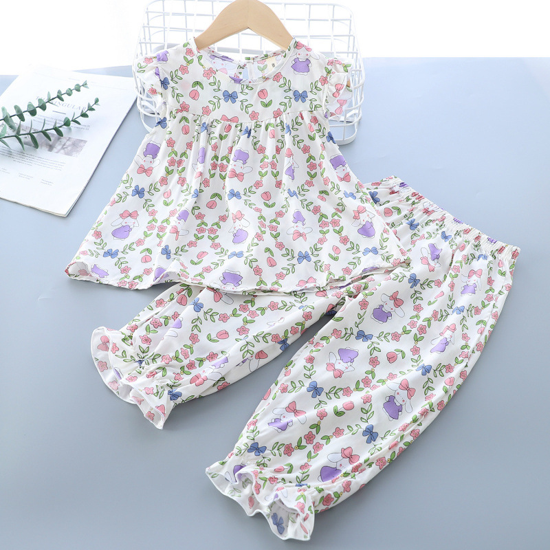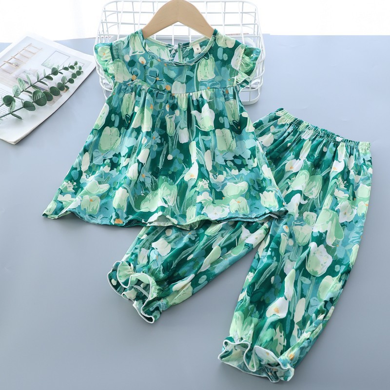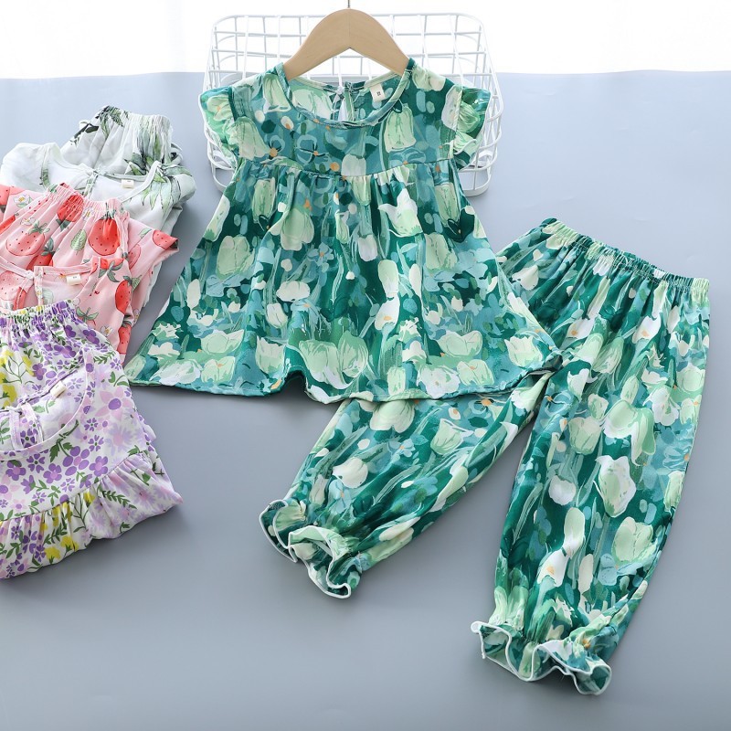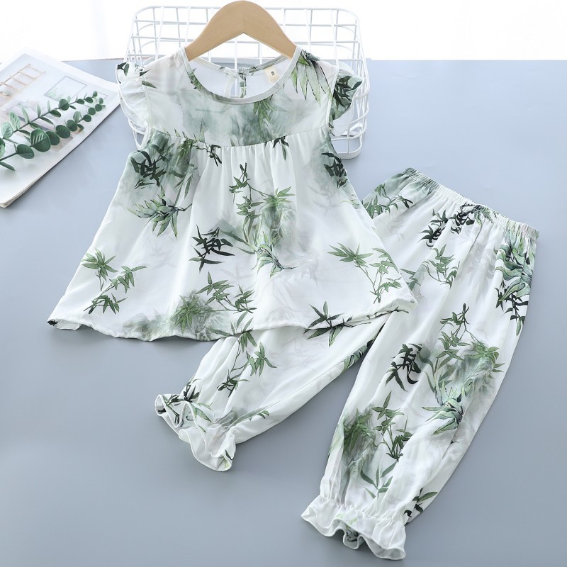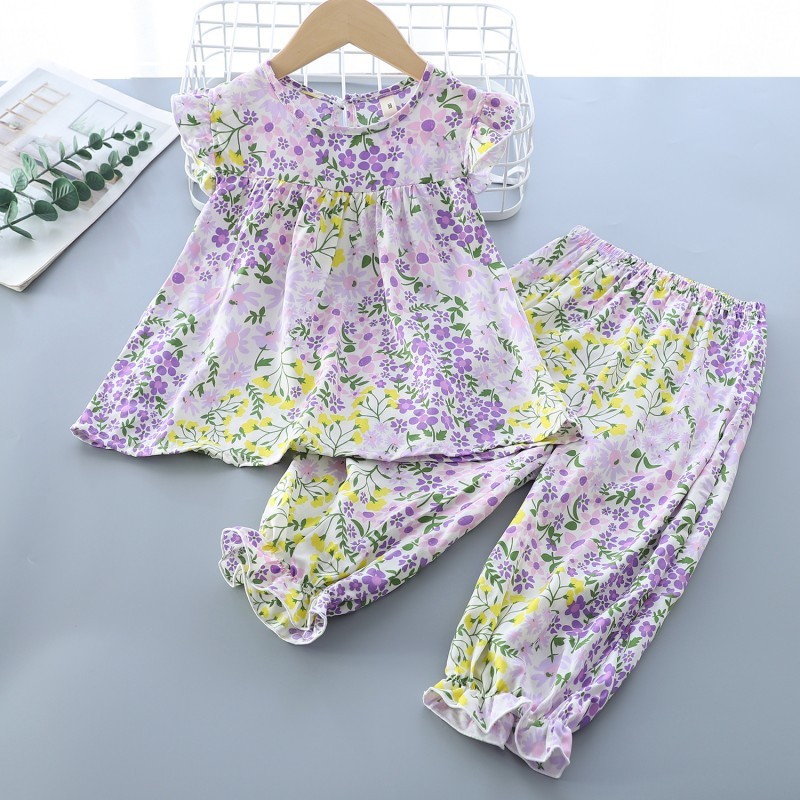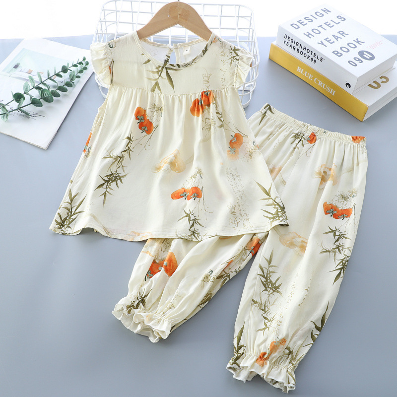 아동용 여름 면화 인공 면화 정장, 여아용 잠옷, 가정복, 유아용 얇은 조끼, 크롭 팬츠, 투피스 세트스토어 가기