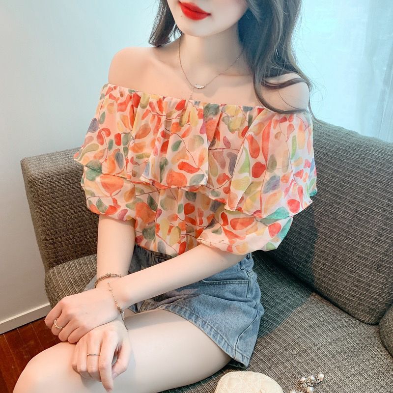 여름 디자인 버블 반팔 틈새 상의 여성용 프렌치 스위트 원 숄더 러플 꽃무늬 쉬폰 셔츠스토어 가기