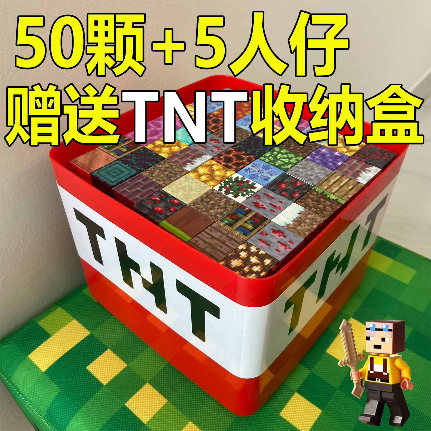 • 빌딩 블록 50개 + 미니피겨 5개 + TNT 보관함