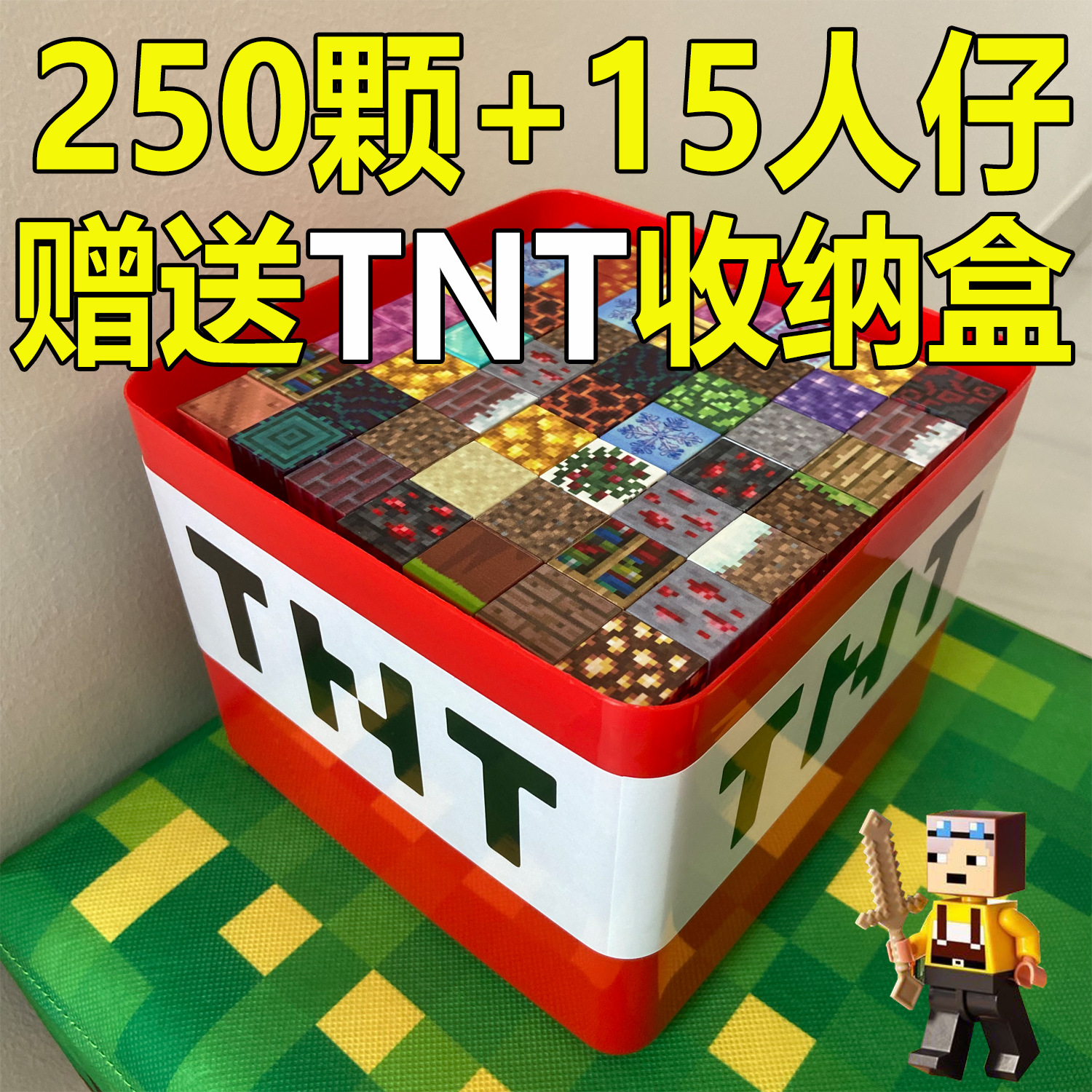 • 빌딩 블록 250개 + 미니피겨 15개 + TNT 보관함