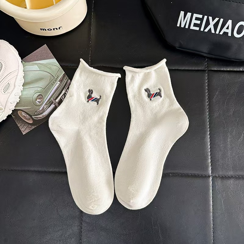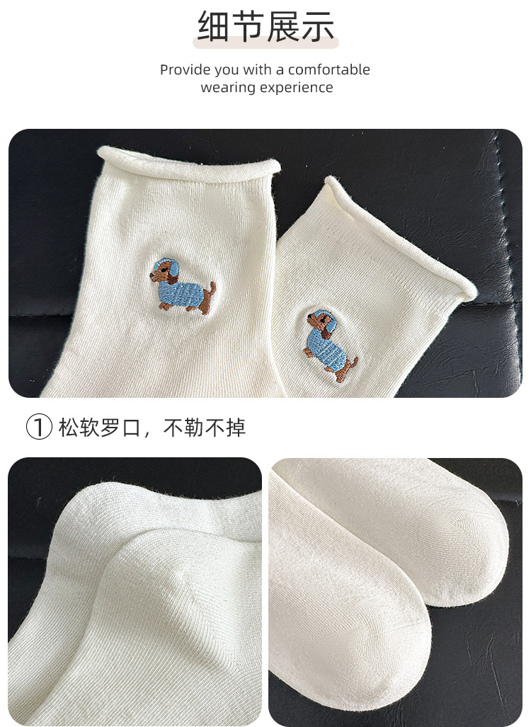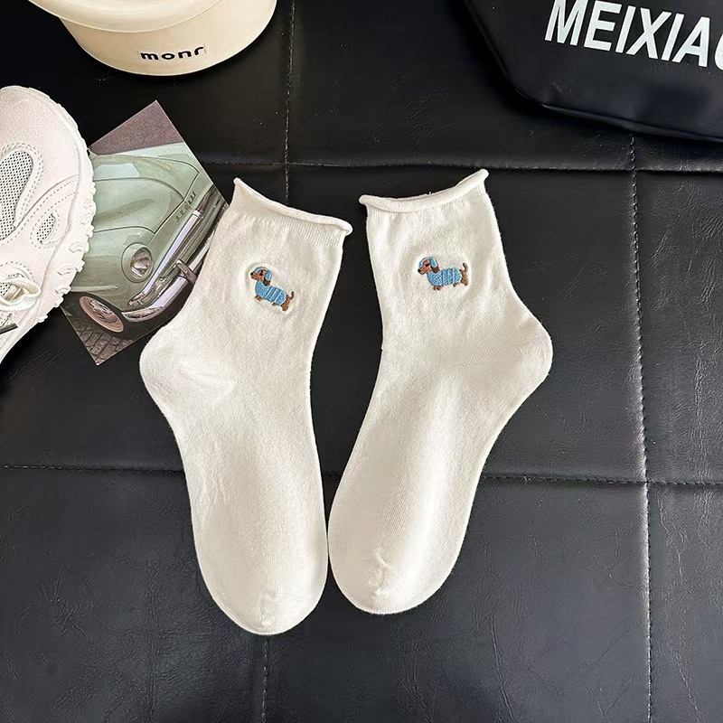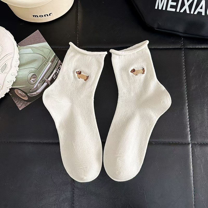 강아지 양말, 여성용 봄 여름 면 양말, 컬링 미드 종아리 양말, 귀여운 만화 자수 양말, 다용도 긴 양말