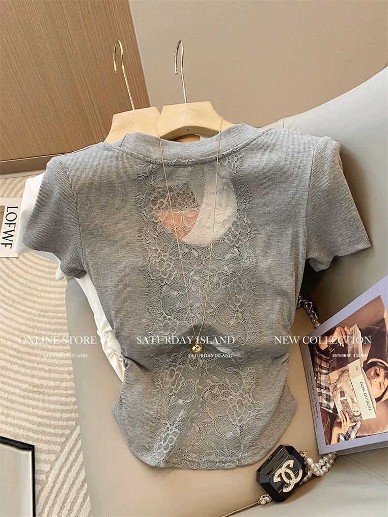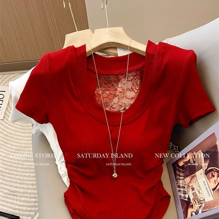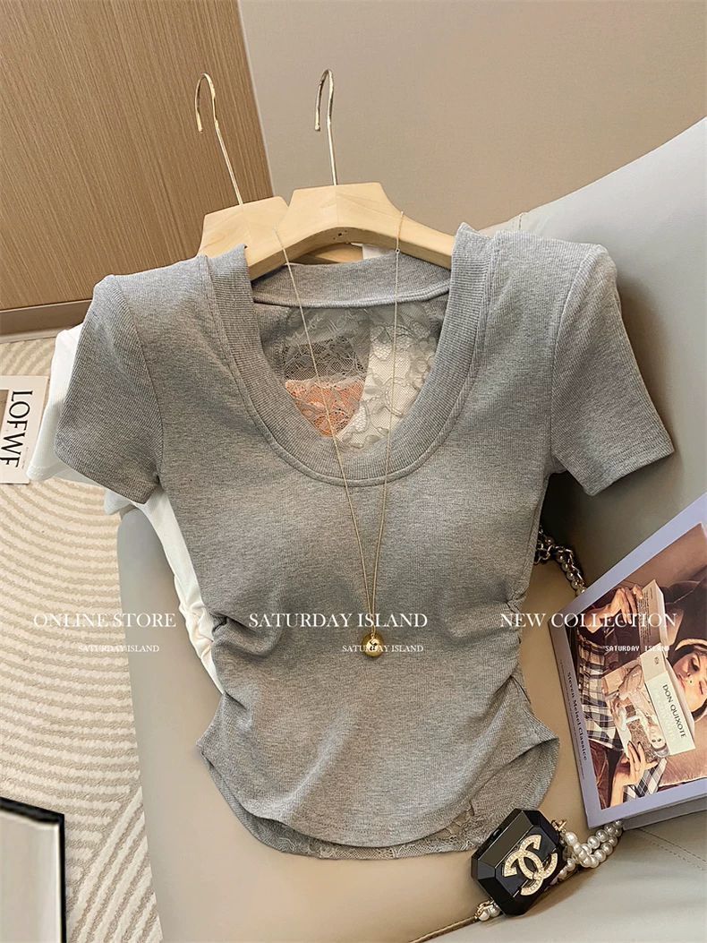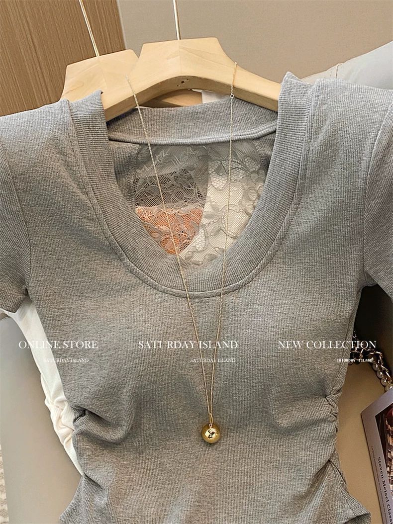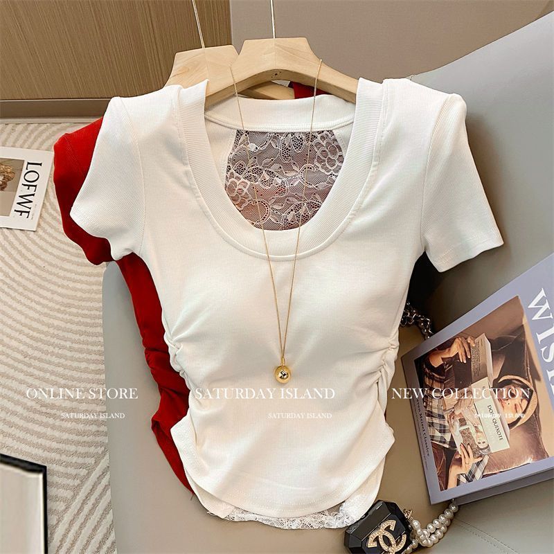 프렌치 디자인 레이스 스티치 U넥 반팔 티셔츠 여성용 2026 여름 신상품 순수하고 섹시한 스타일의 주름 장식 허리라인 탑스토어 가기