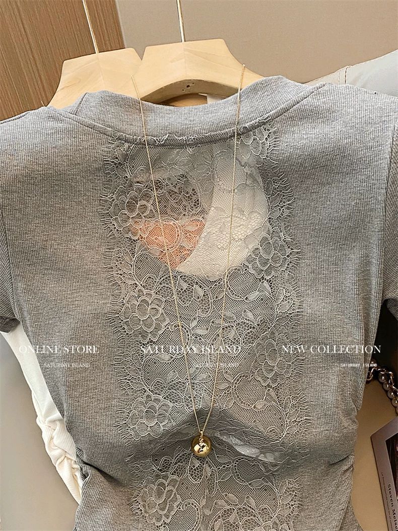 프렌치 디자인 레이스 스티치 U넥 반팔 티셔츠 여성용 2026 여름 신상품 순수하고 섹시한 스타일의 주름 장식 허리라인 탑