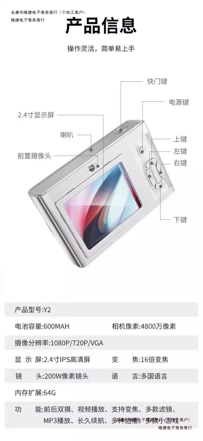 • Y2 밀키 화이트 4800w 고화질 듀얼 카메라(셀카 촬영 가능 + 매우 긴 배터리 수명) 선물 패키지 - 16g 메모리 카드[사진 500장 + 데이터 케이블 + 끈]