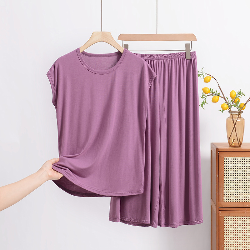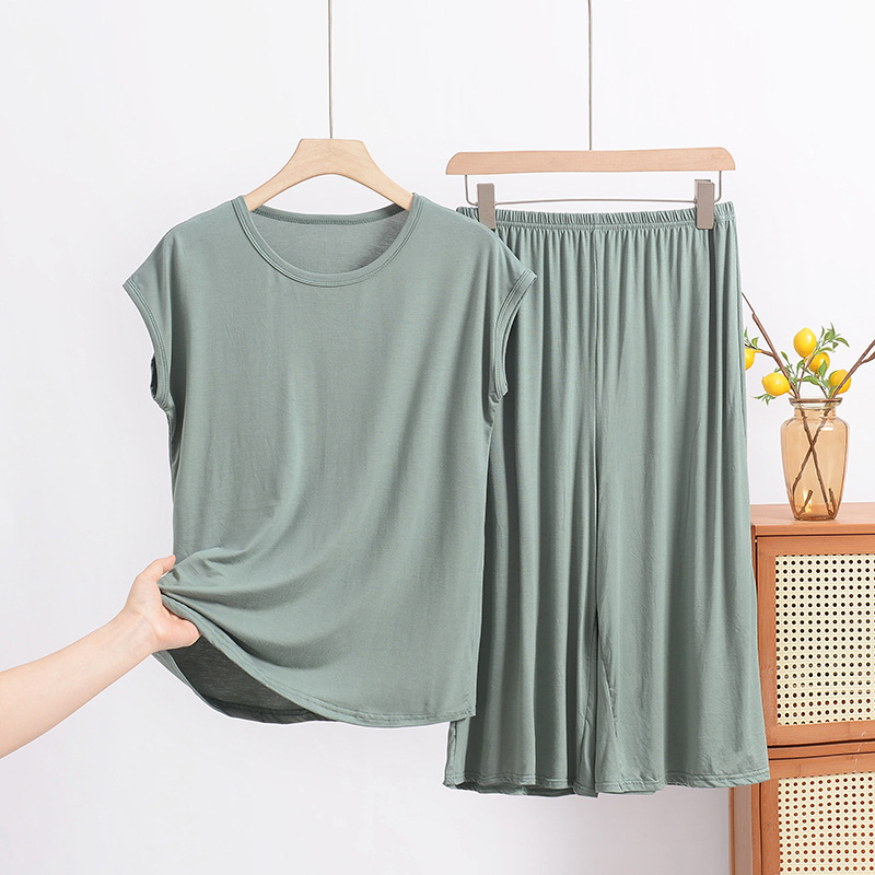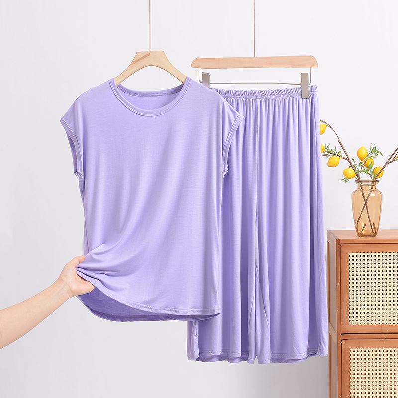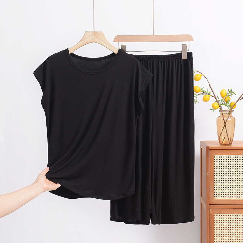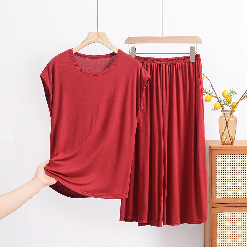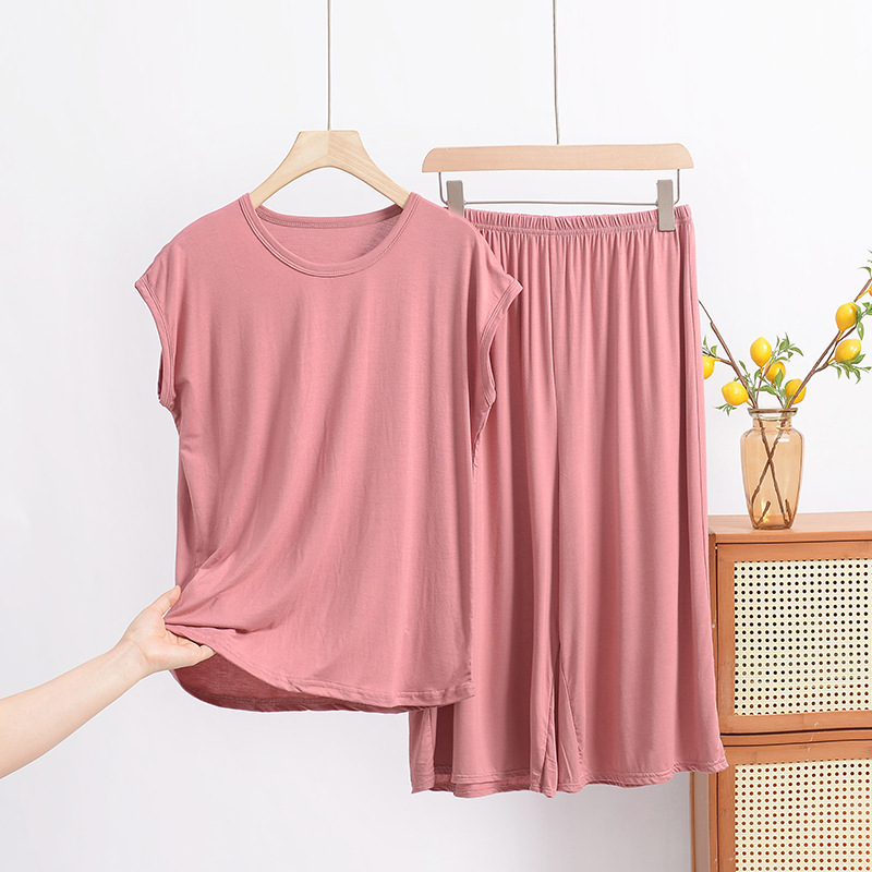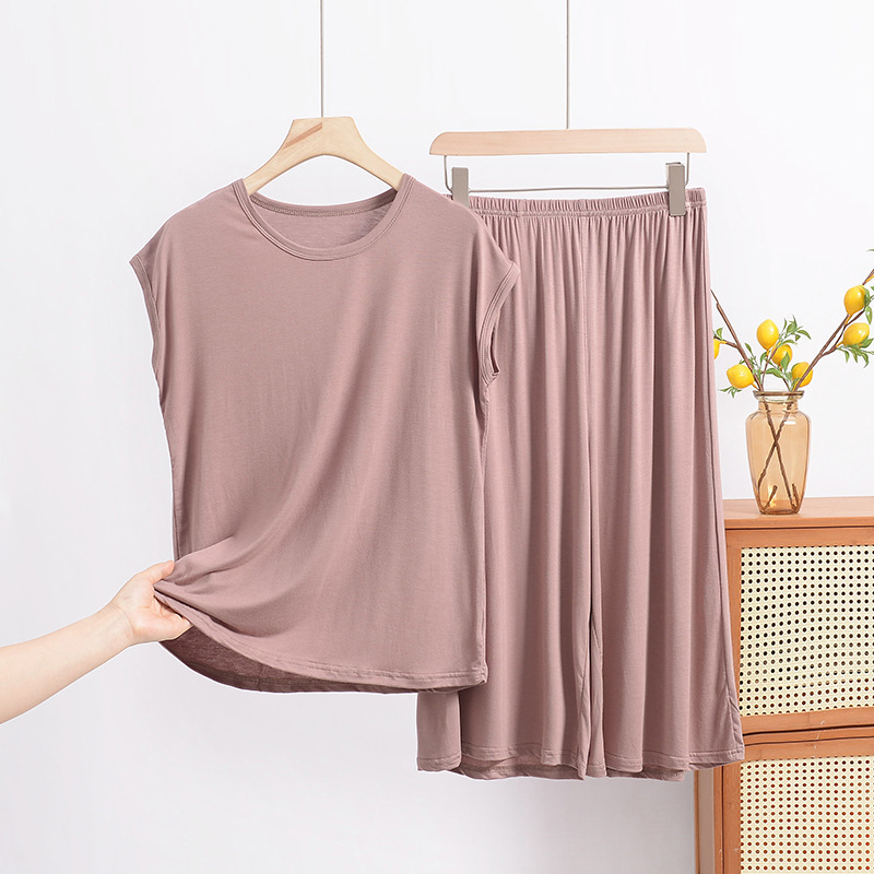 여름 모달 파자마 세트 여성용 얇은 홈 루즈 민소매 티셔츠 플러스 사이즈 탑 7부 반바지 투피스 세트