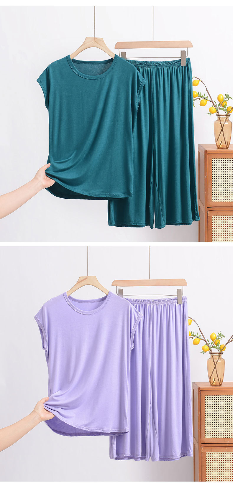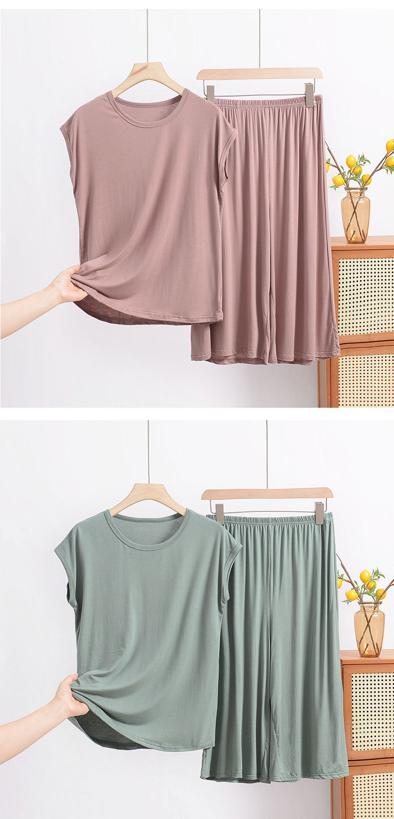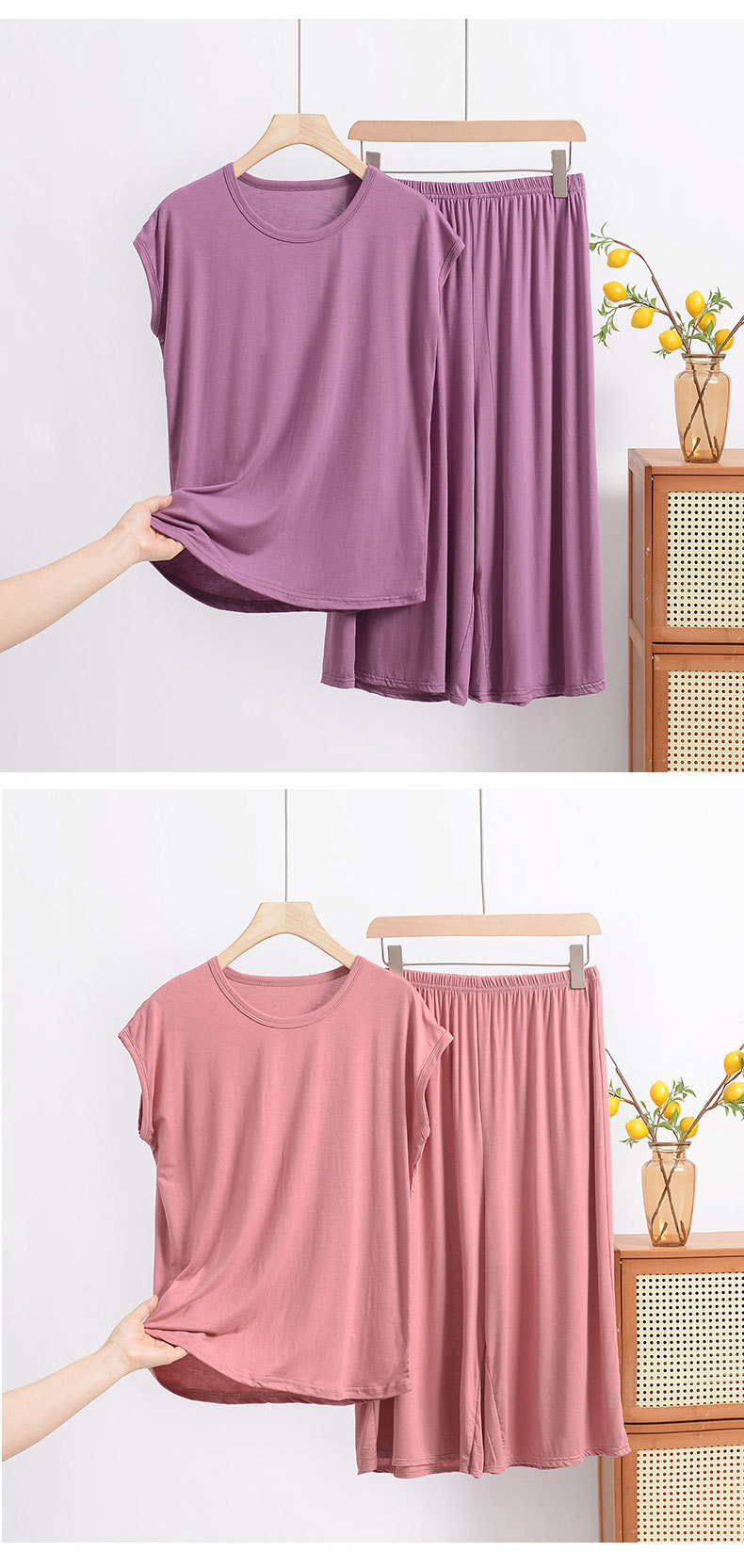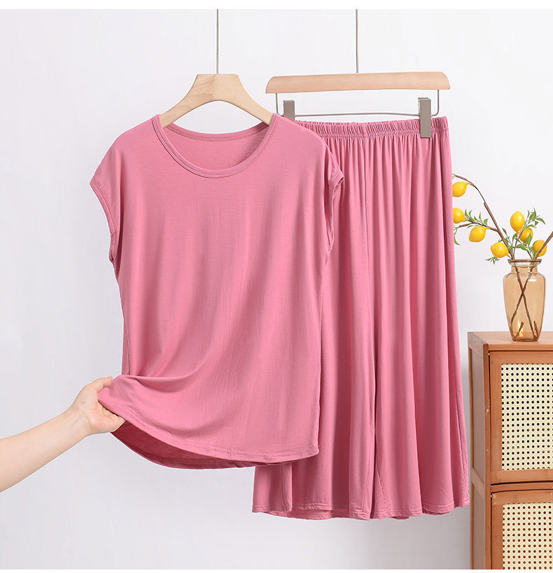 여름 모달 파자마 세트 여성용 얇은 홈 루즈 민소매 티셔츠 플러스 사이즈 탑 7부 반바지 투피스 세트