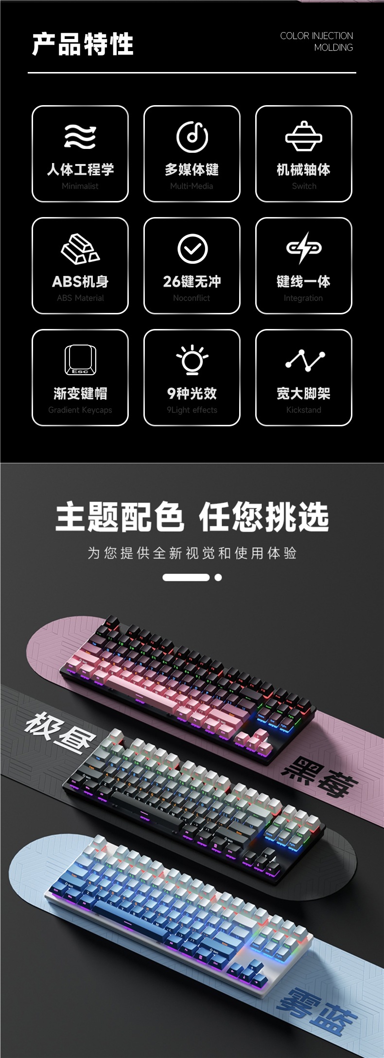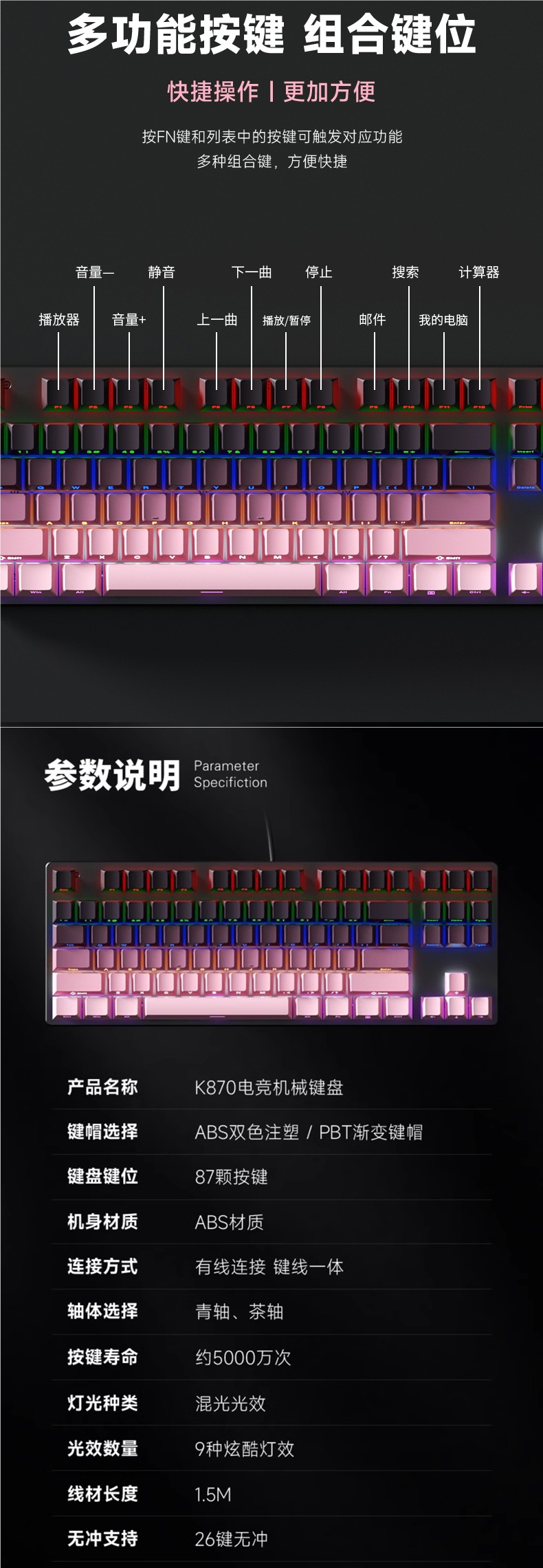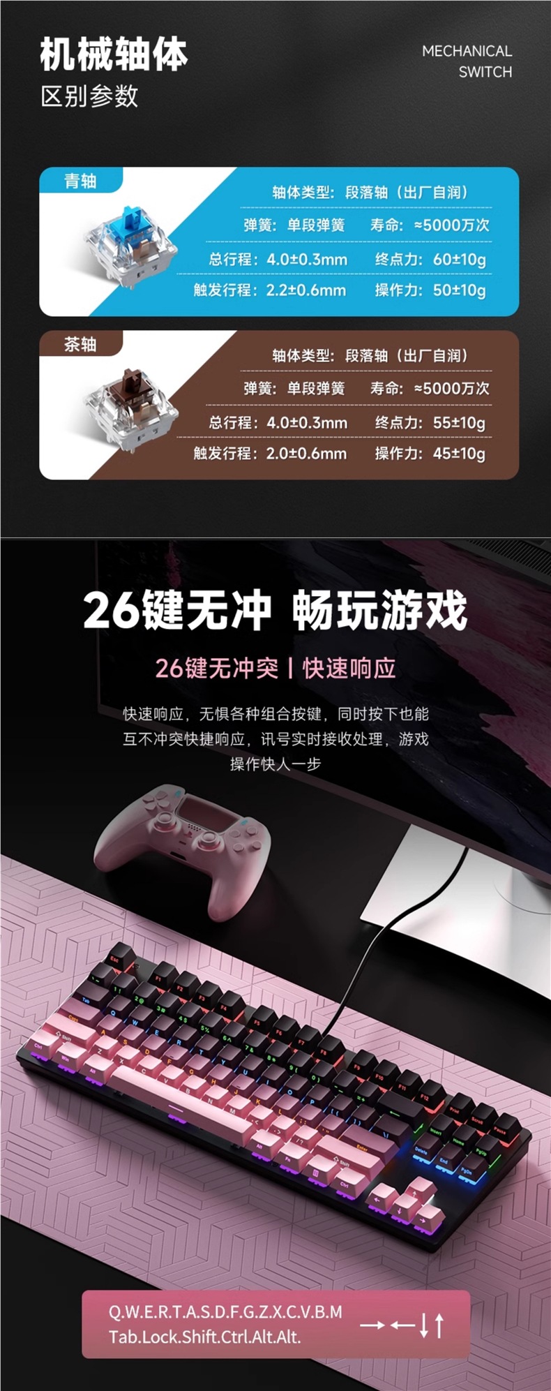 Fenglingdu 87 키 기계식 키보드 유선 녹색 및 홍차 축 컴퓨터 데스크탑 오피스 게임 e-스포츠 그라디언트 측면 각인