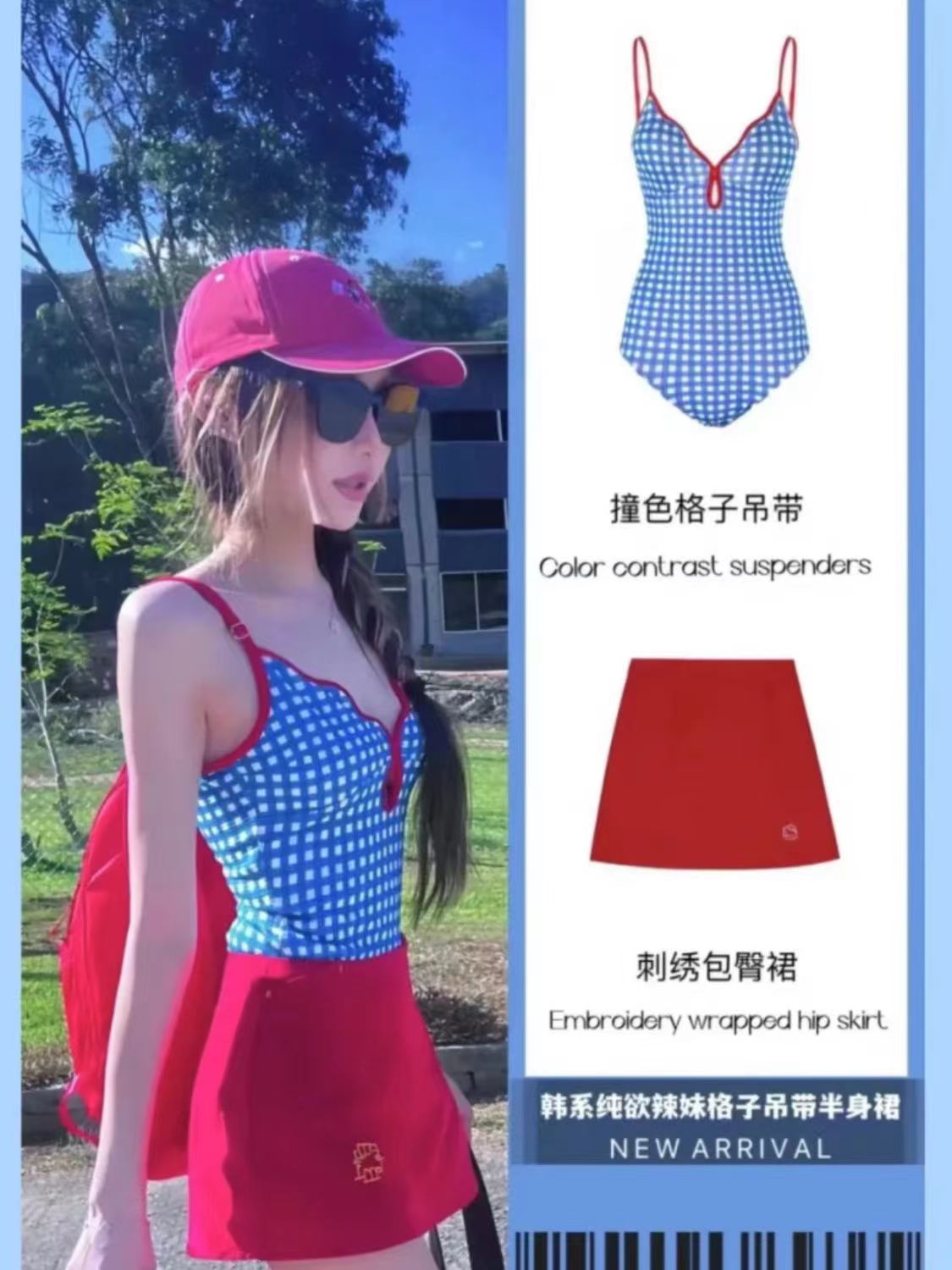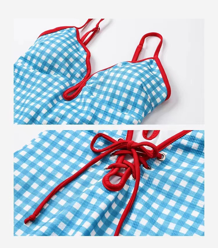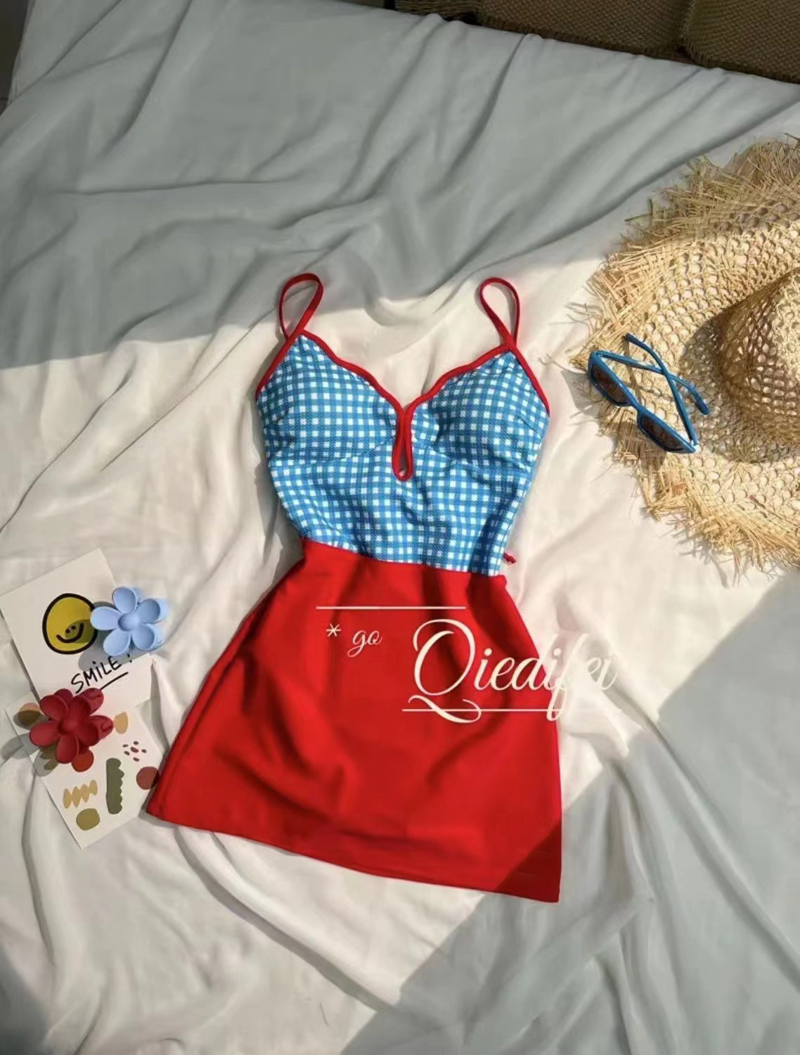 일본 신선한 소녀 연령 감소 파란색 격자 무늬 여름 서스펜더 백리스 슬리밍 온천 원피스 수영복 여성 레드 스커트스토어 가기