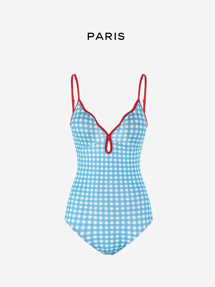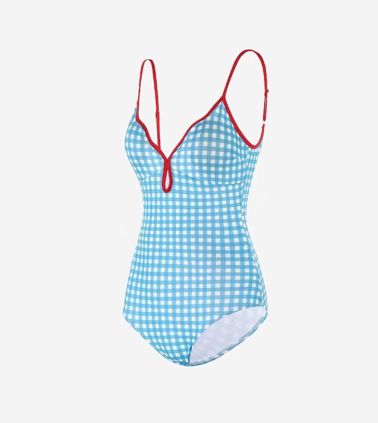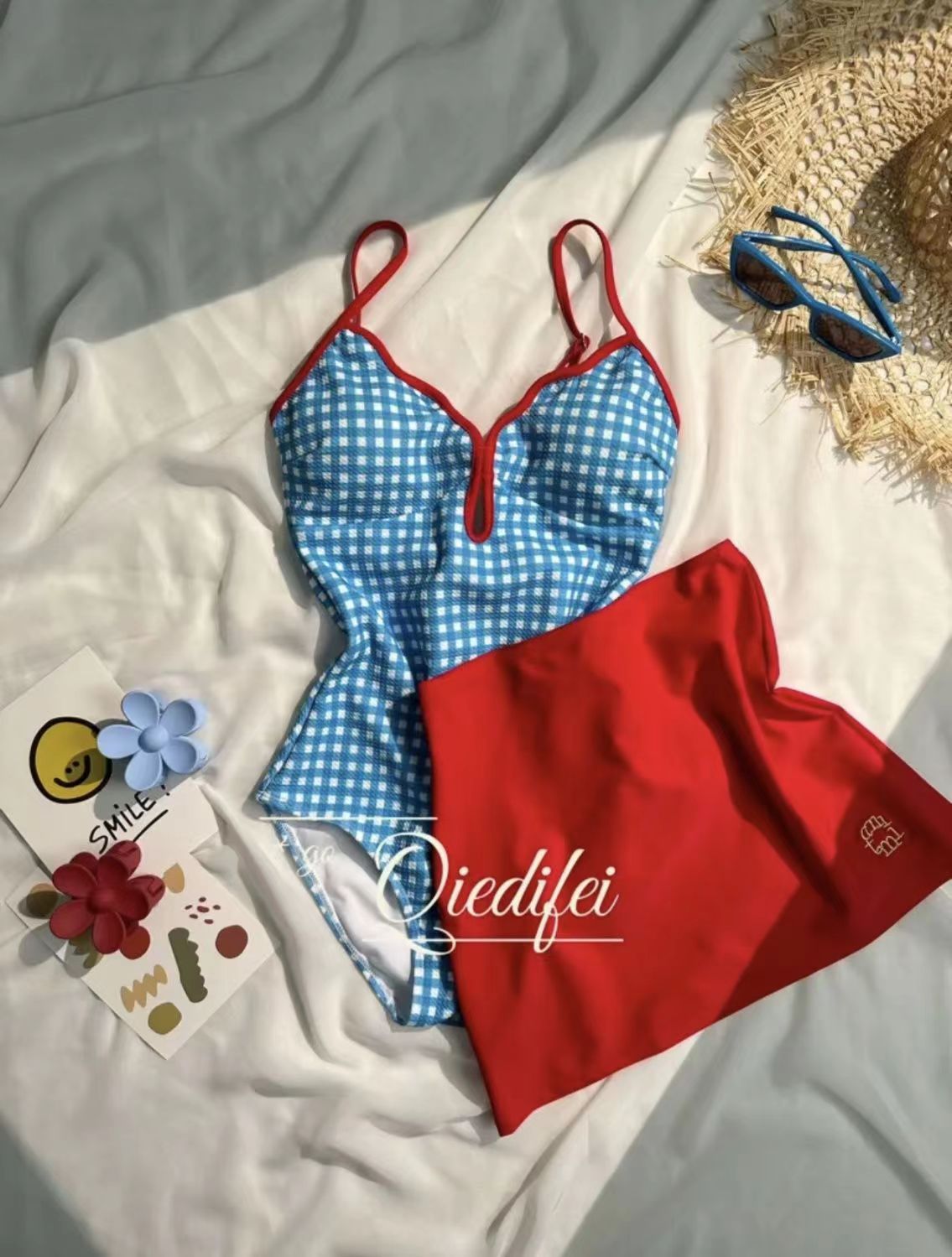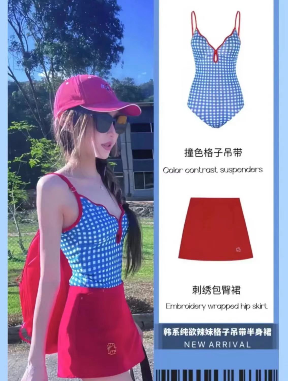 일본 신선한 소녀 연령 감소 파란색 격자 무늬 여름 서스펜더 백리스 슬리밍 온천 원피스 수영복 여성 레드 스커트스토어 가기